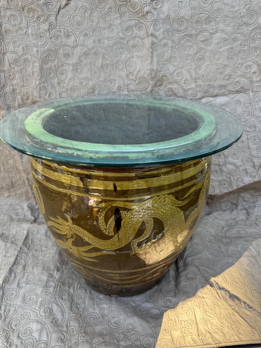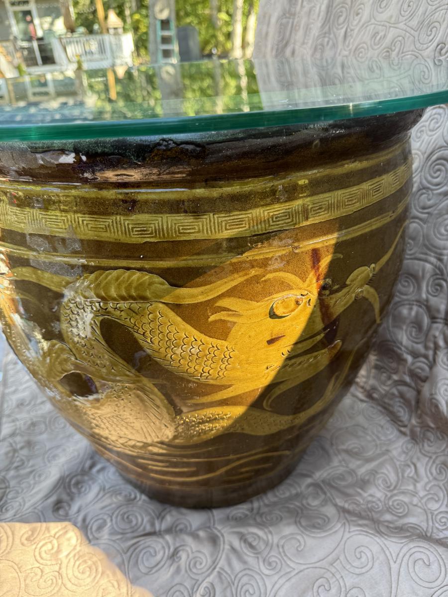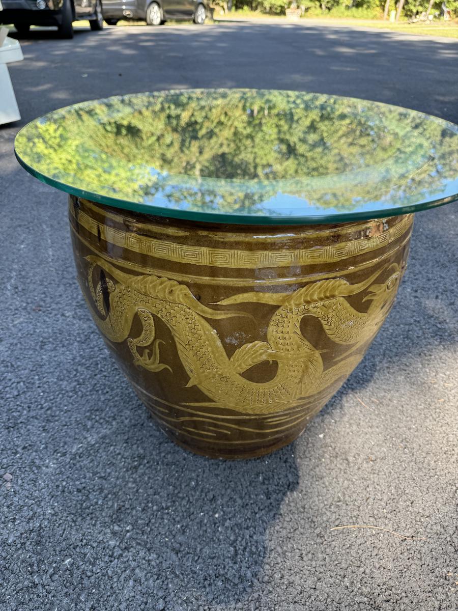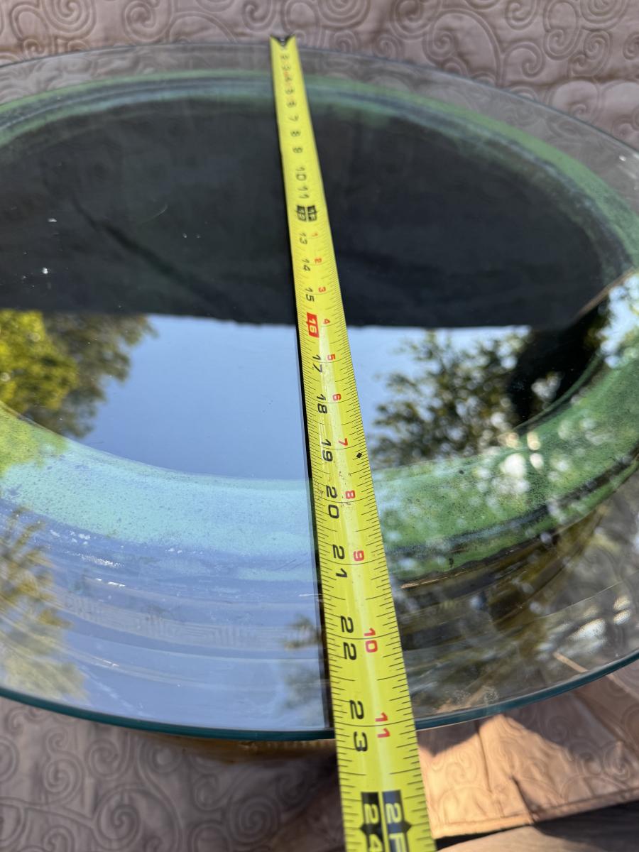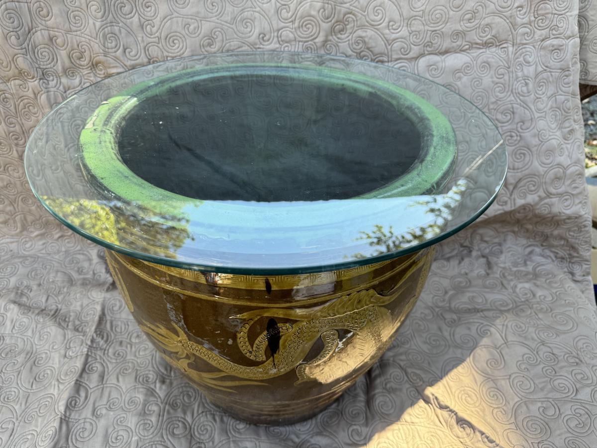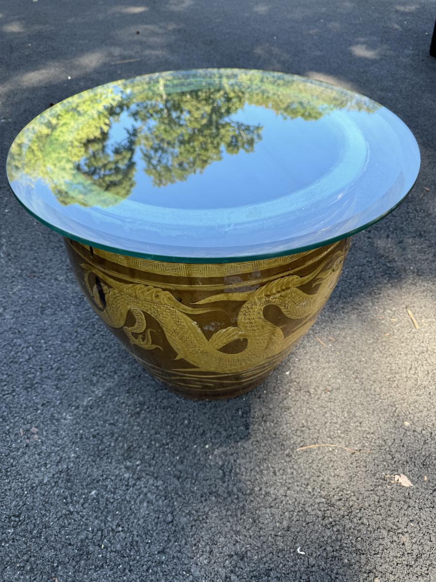 Buying as is, as found in this wonderful estate. See MANY PHOTOS for content, condition and dimensions. Never a Buyers Premiums or Credit Card Fee. All lots start at just $10 and sell with No Reserve to the highest bidder. Glass top 23” diameter.