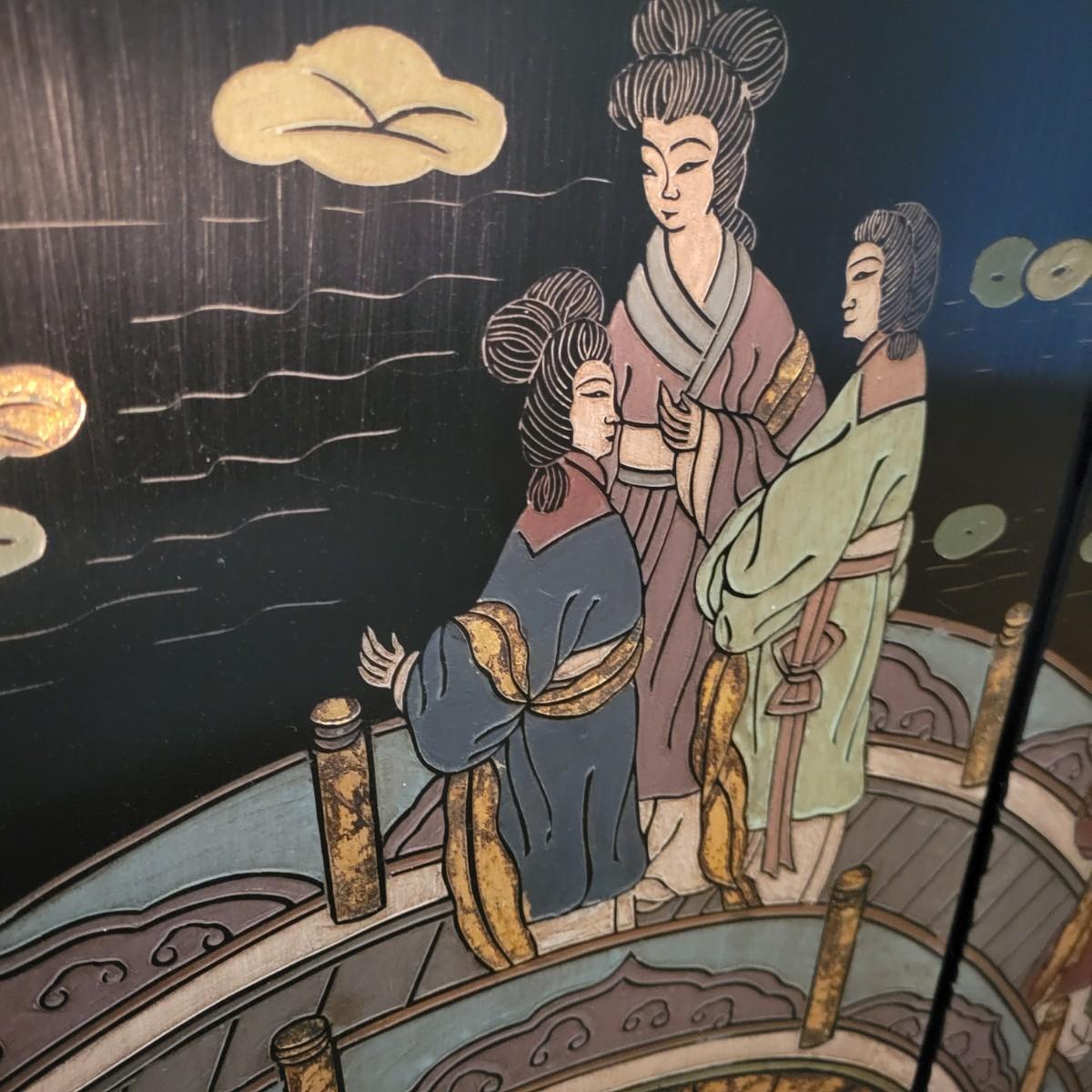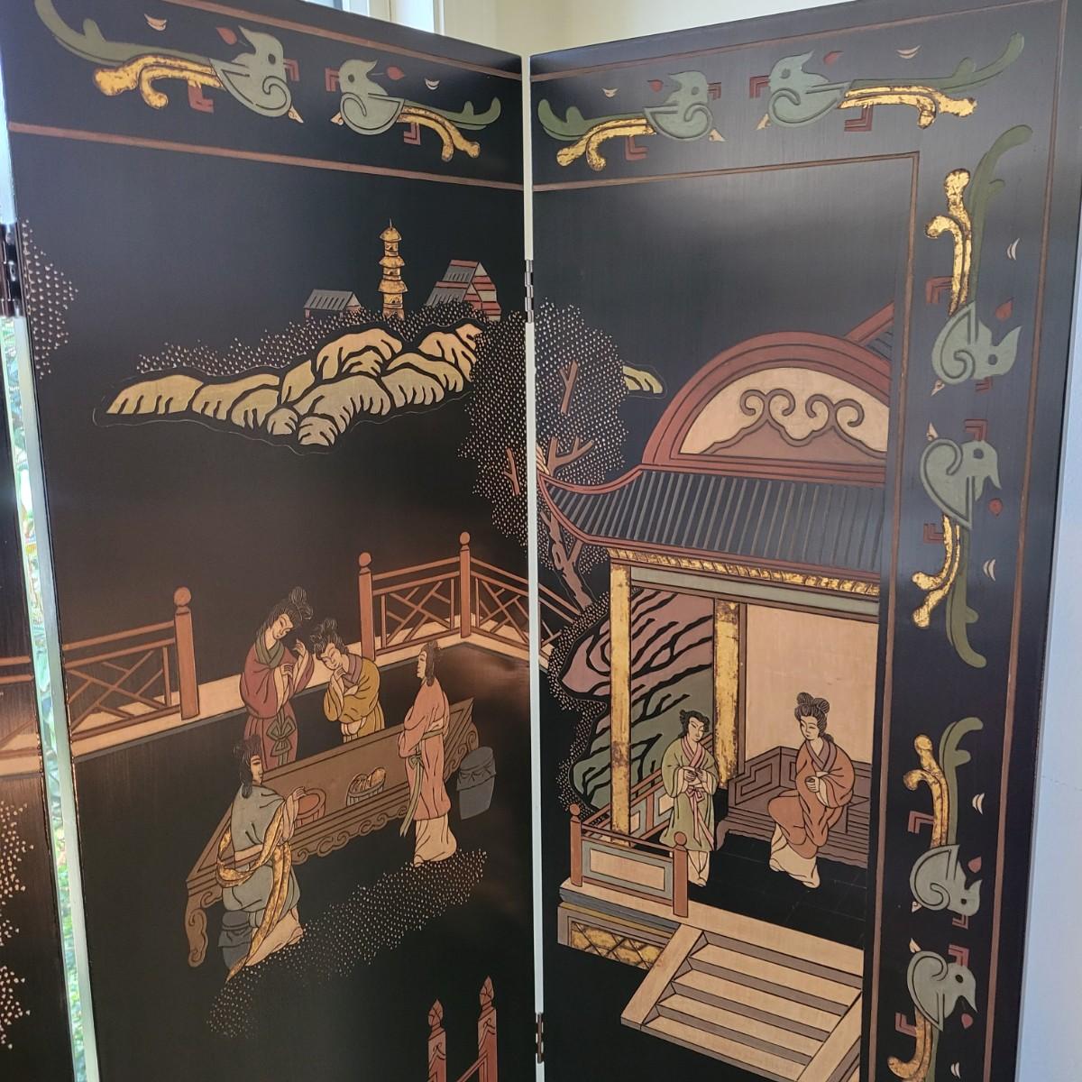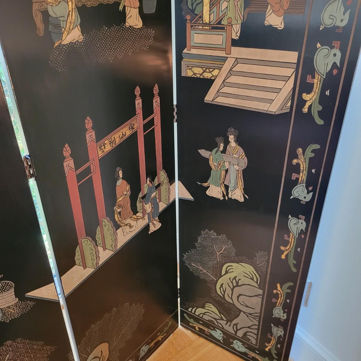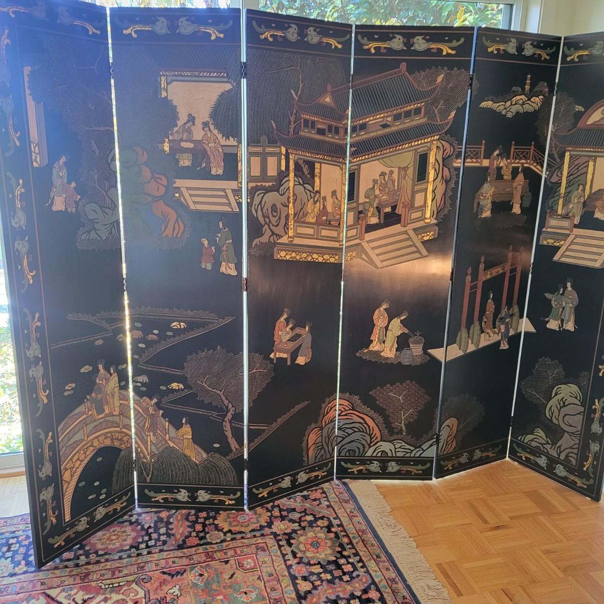 A large Asian folding screen in good condition with some minor chips in the black lacquer enamel. This screen features six panels that depict pre industrial Japanese scenes on one side and nature scenes on the other. It appears the lacquer was cut away to create the various scenes and the removed areas were hand painted. Measures approximately 96" x 68.5" x 1" and each panel measures 16" wide. Winning bidder will need to bring assistance to move and load this item as it is substantial and will need to go up a flight of stairs. Local pickup only.