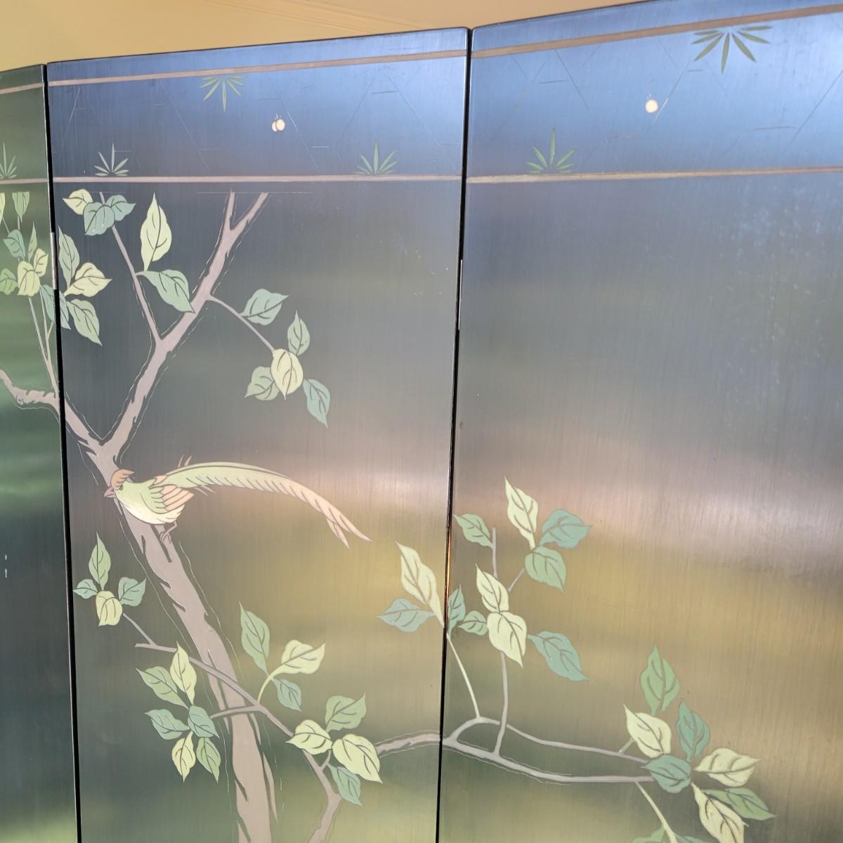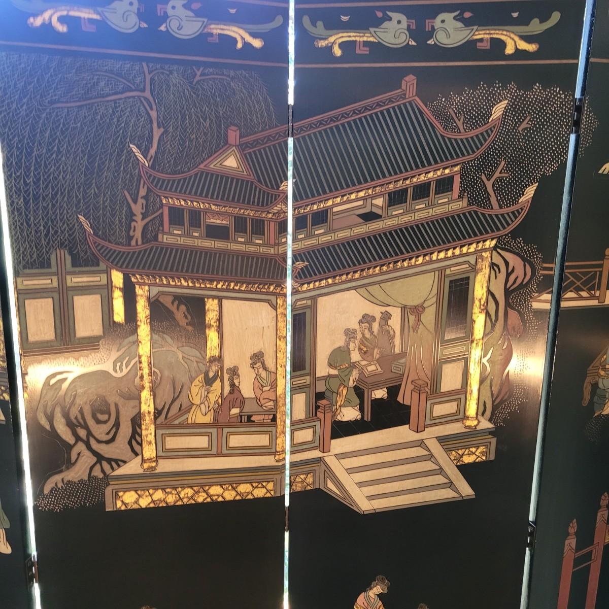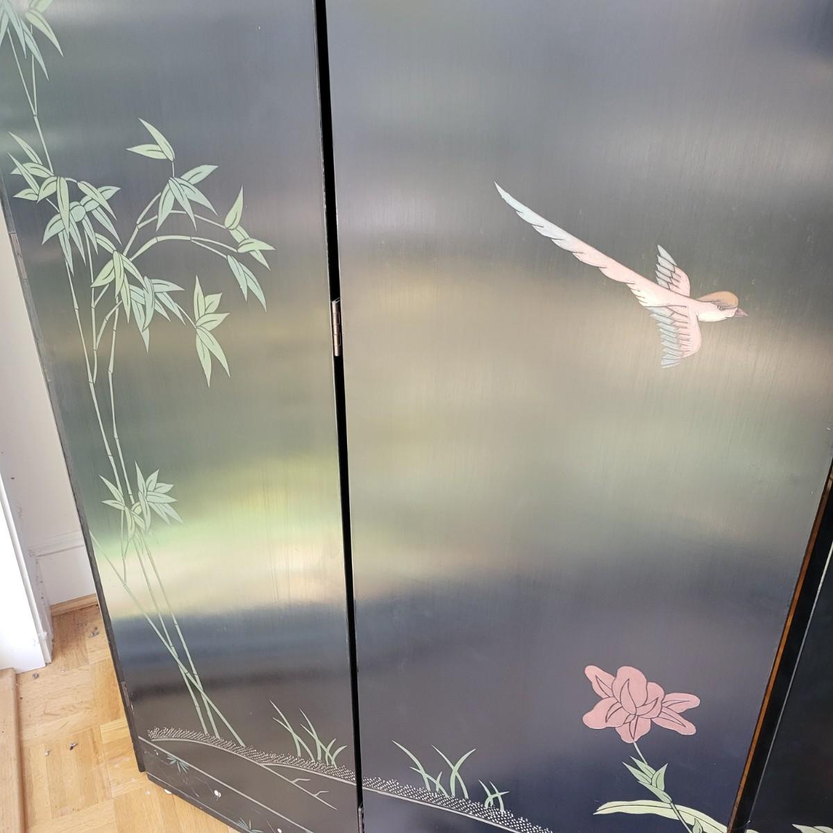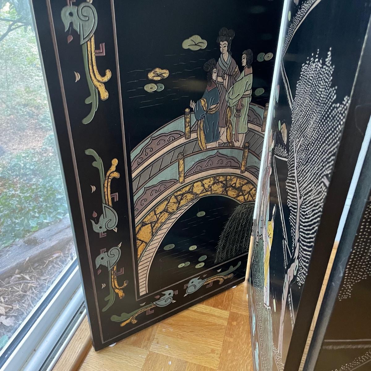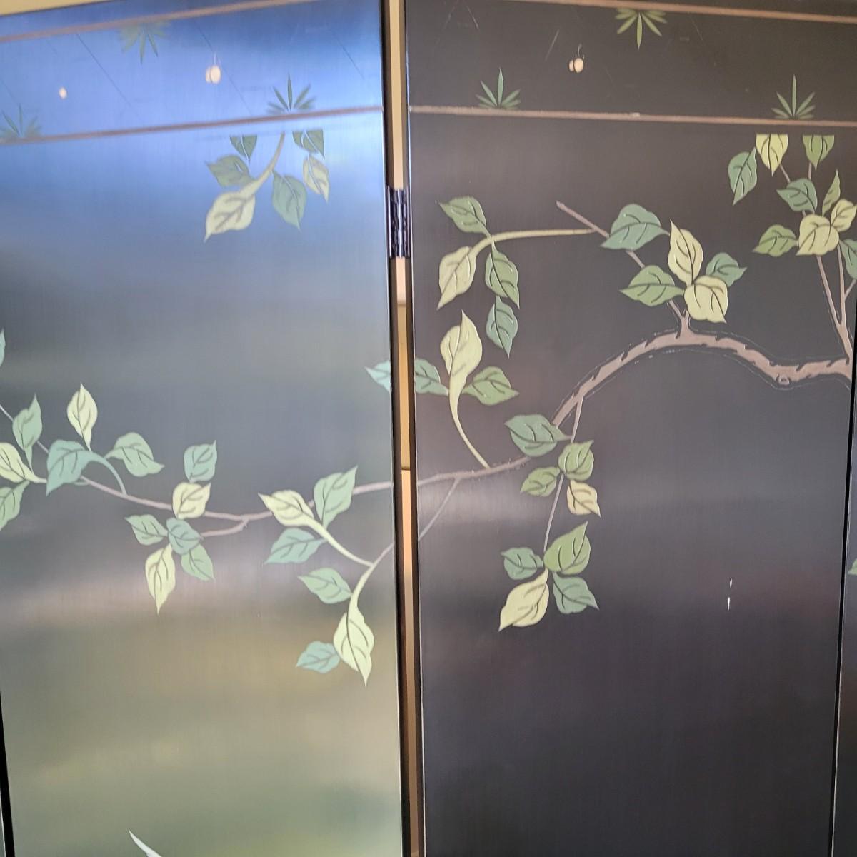 A large Asian folding screen in good condition with some minor chips in the black lacquer enamel. This screen features six panels that depict pre industrial Japanese scenes on one side and nature scenes on the other. It appears the lacquer was cut away to create the various scenes and the removed areas were hand painted. Measures approximately 96" x 68.5" x 1" and each panel measures 16" wide. Winning bidder will need to bring assistance to move and load this item as it is substantial and will need to go up a flight of stairs. Local pickup only.