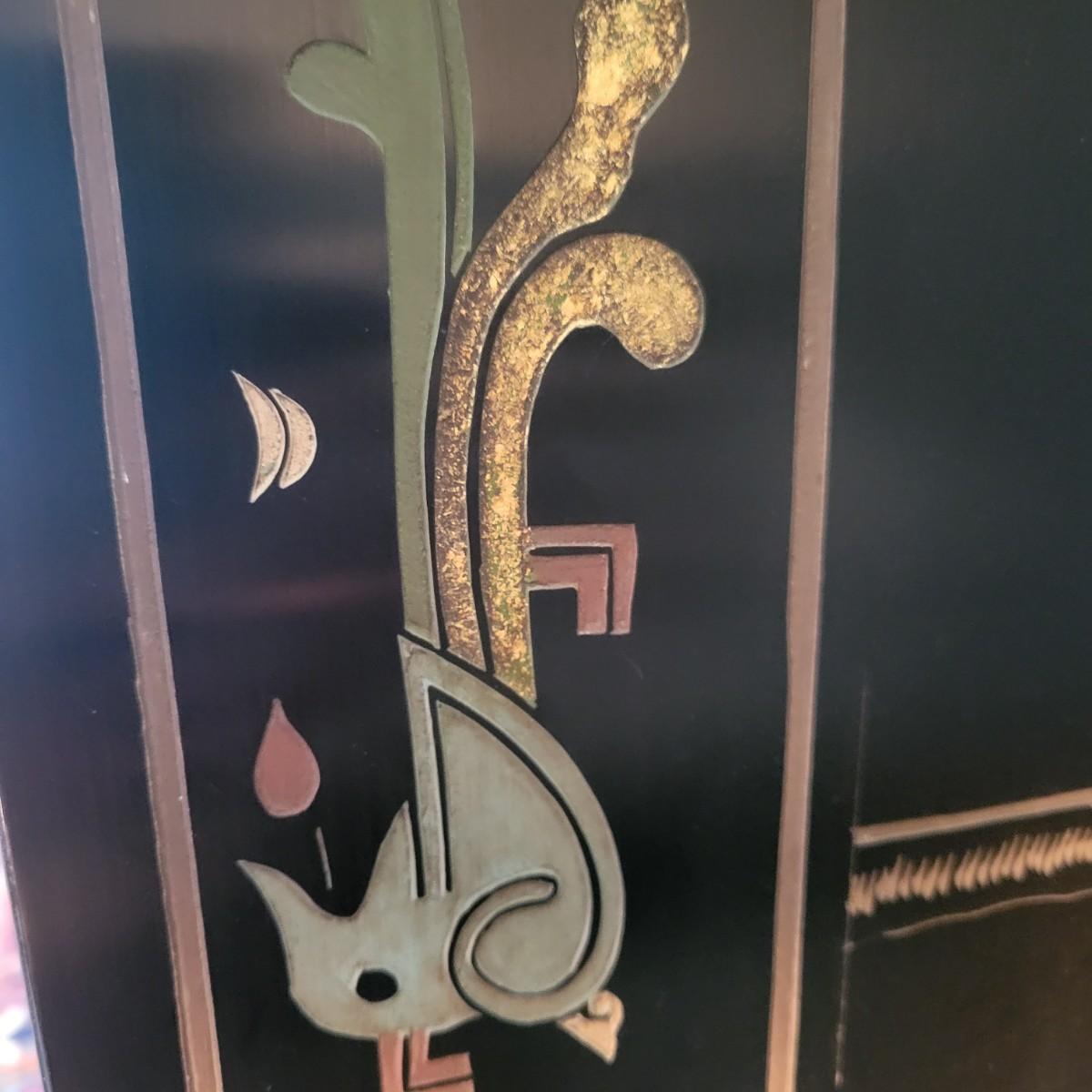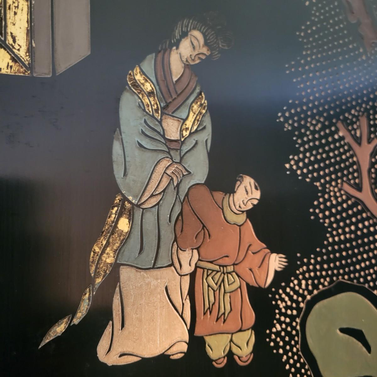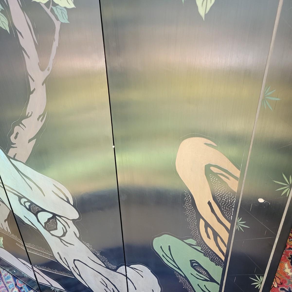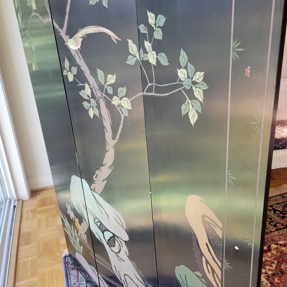 A large Asian folding screen in good condition with some minor chips in the black lacquer enamel. This screen features six panels that depict pre industrial Japanese scenes on one side and nature scenes on the other. It appears the lacquer was cut away to create the various scenes and the removed areas were hand painted. Measures approximately 96" x 68.5" x 1" and each panel measures 16" wide. Winning bidder will need to bring assistance to move and load this item as it is substantial and will need to go up a flight of stairs. Local pickup only.