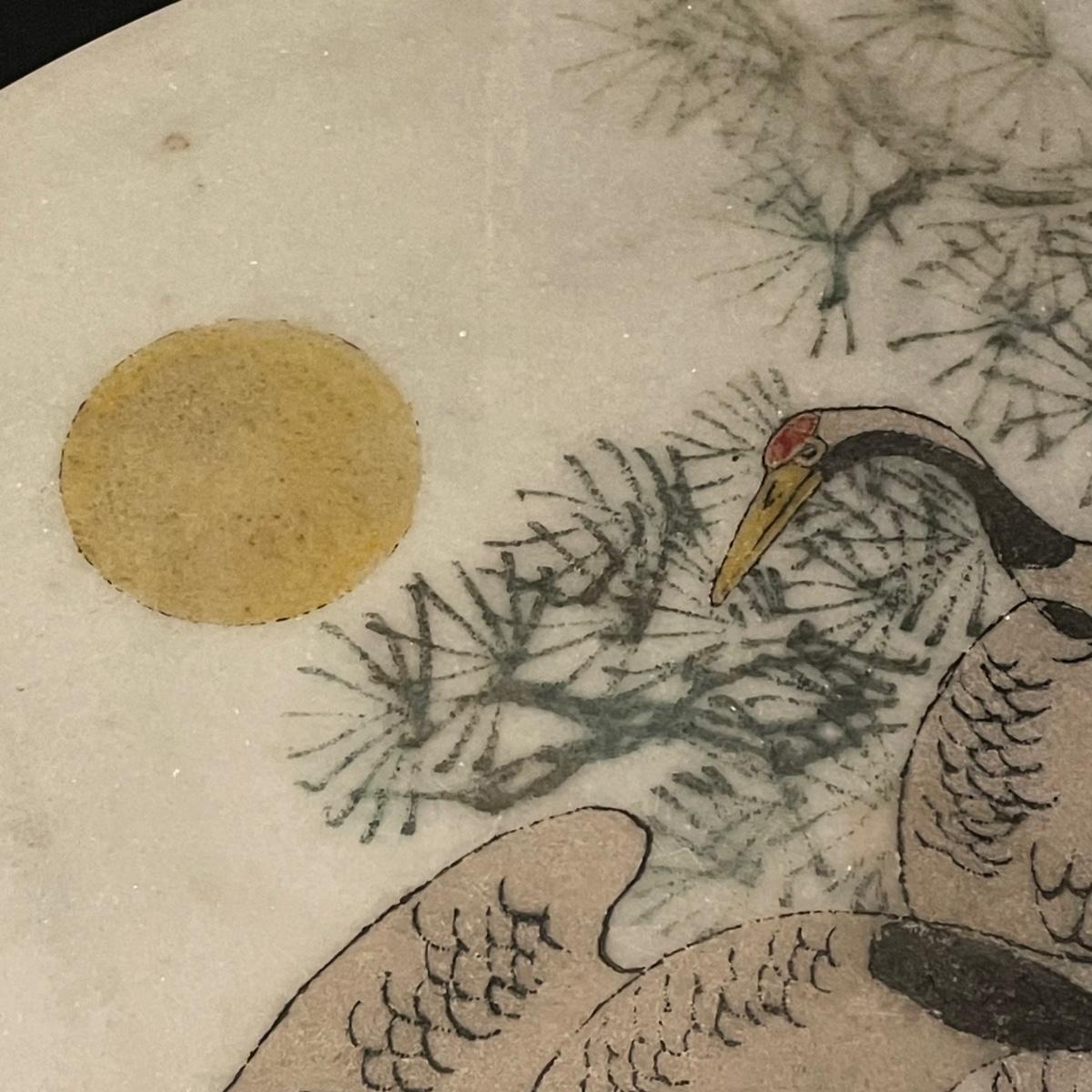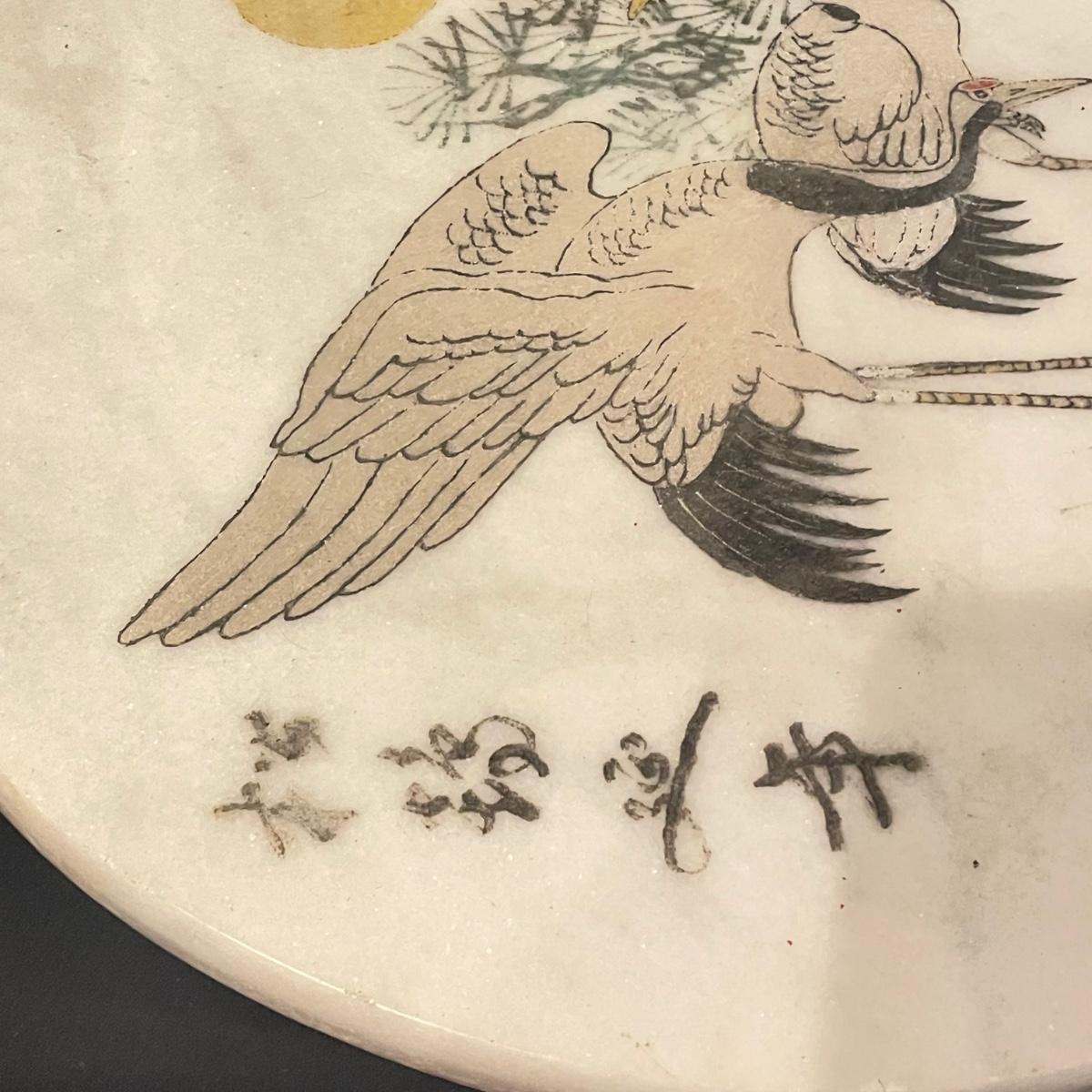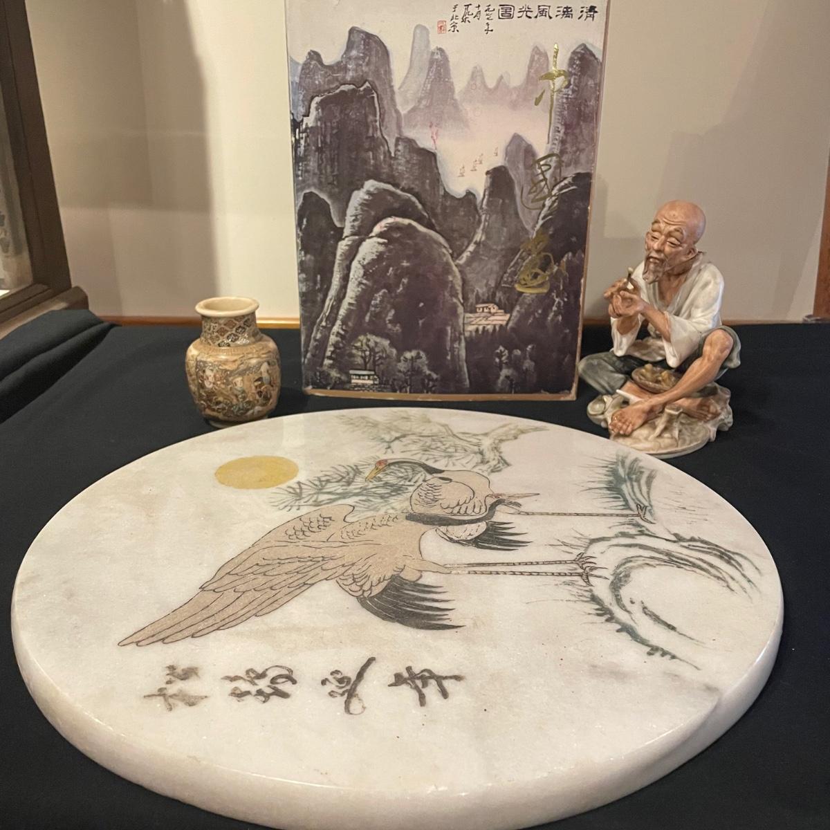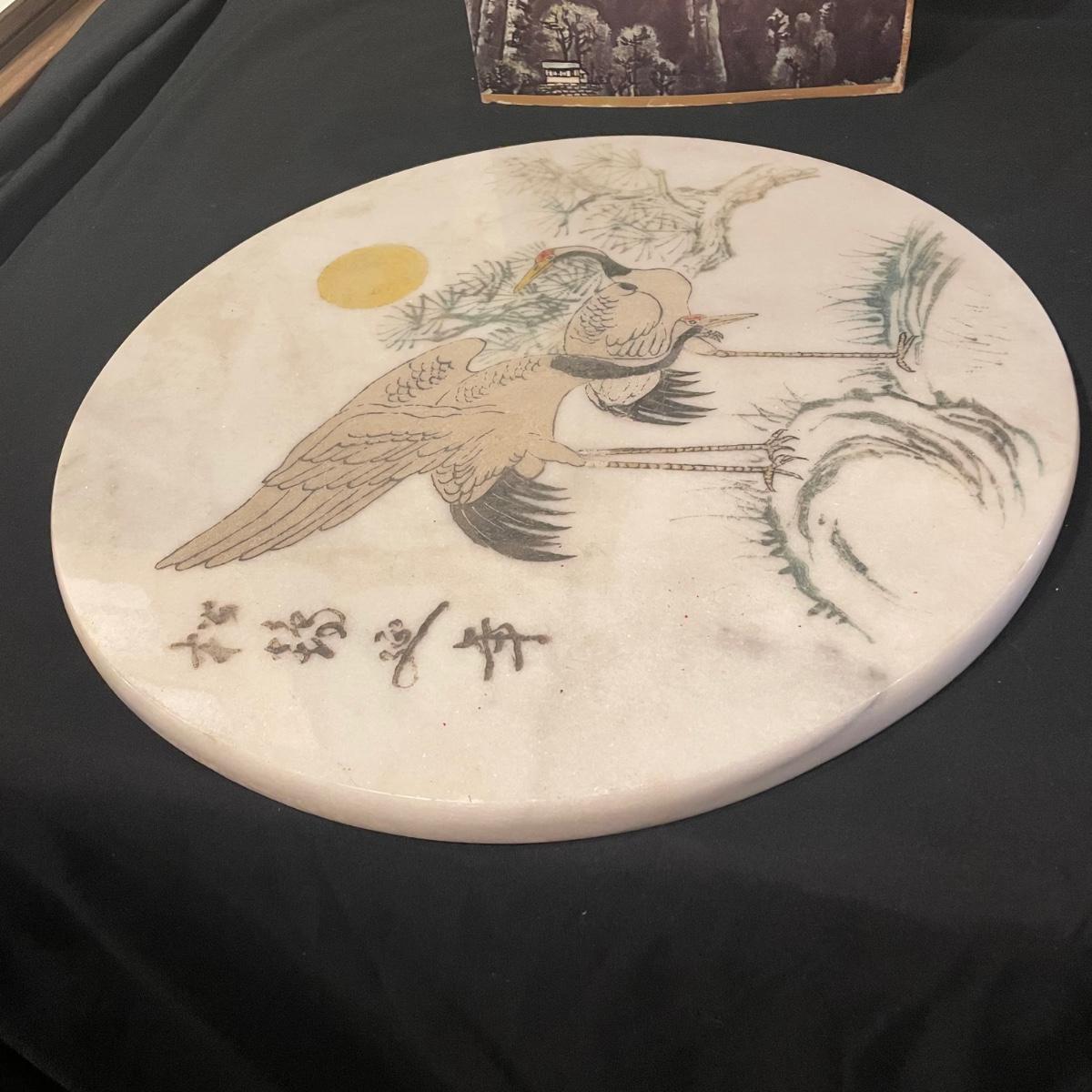 This lovely cutting board is marble and has a pair of hand painted sand cranes. Lot also includes a porcelain figurine that does have a broken toe, a book abs a small ceramic vase.
