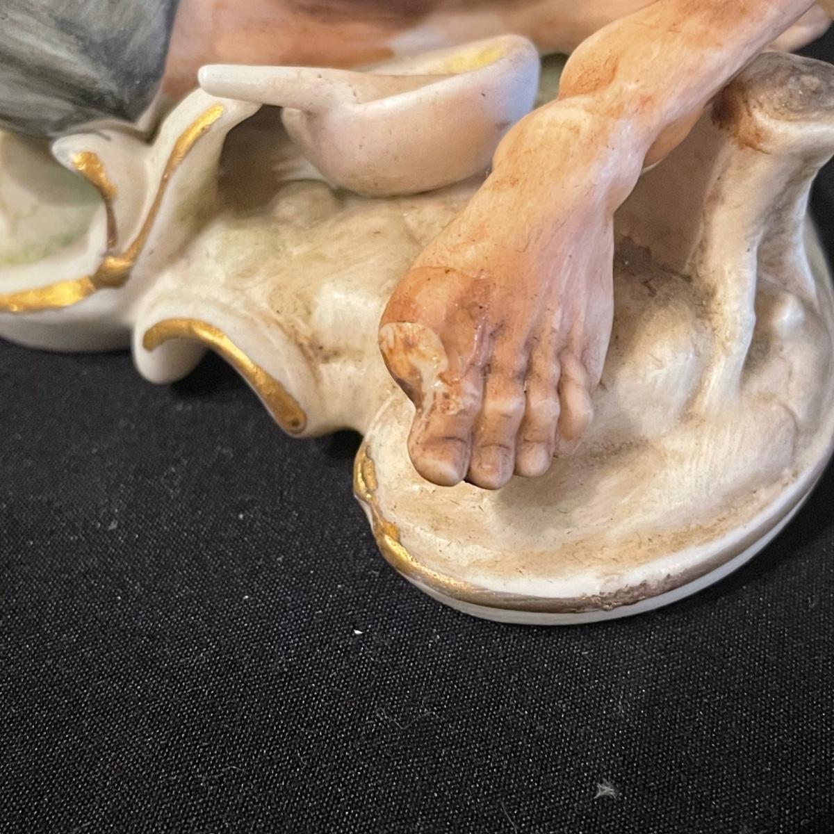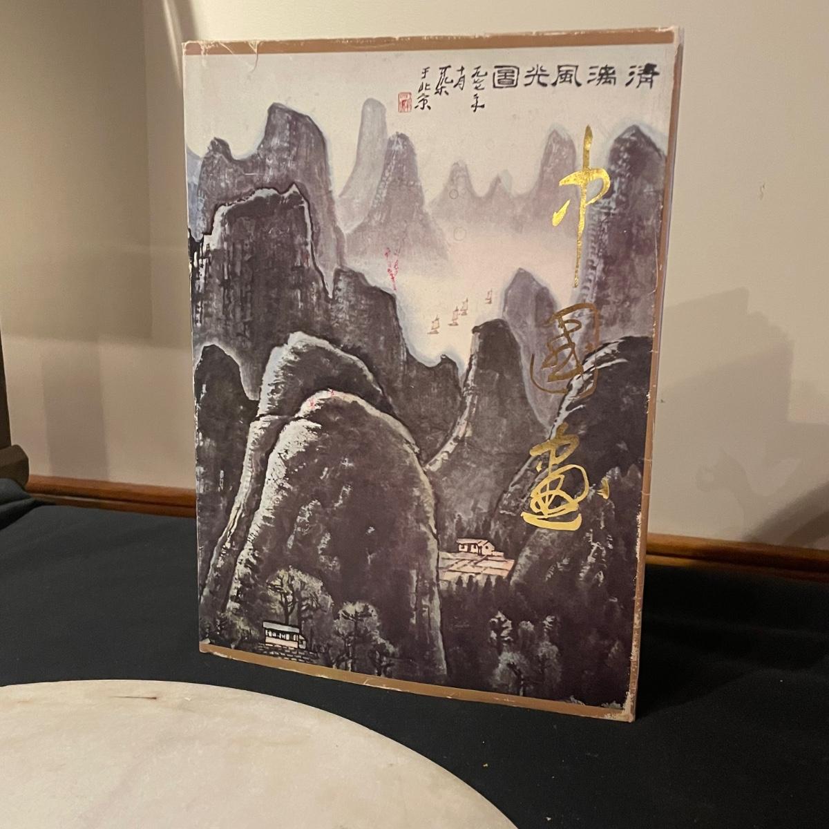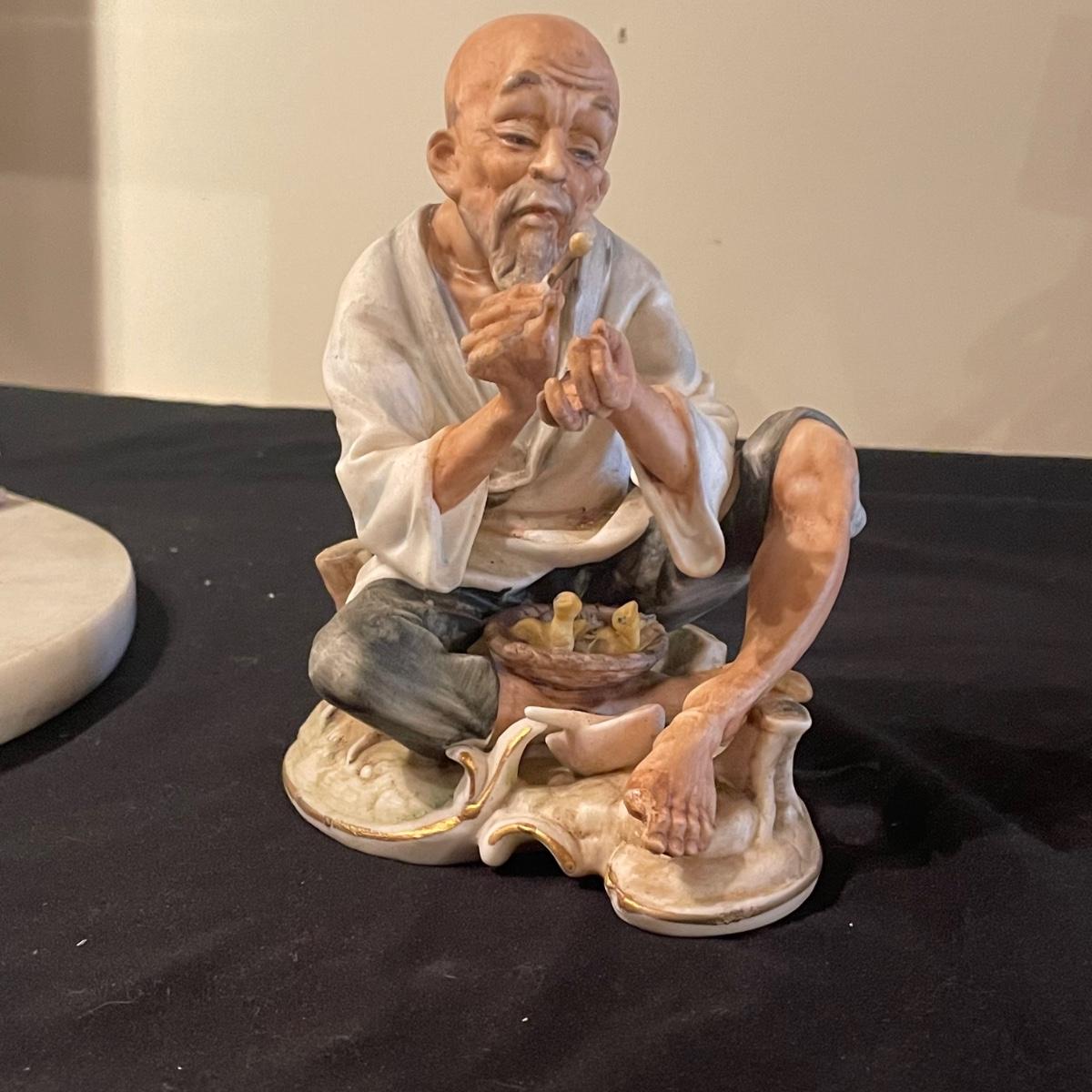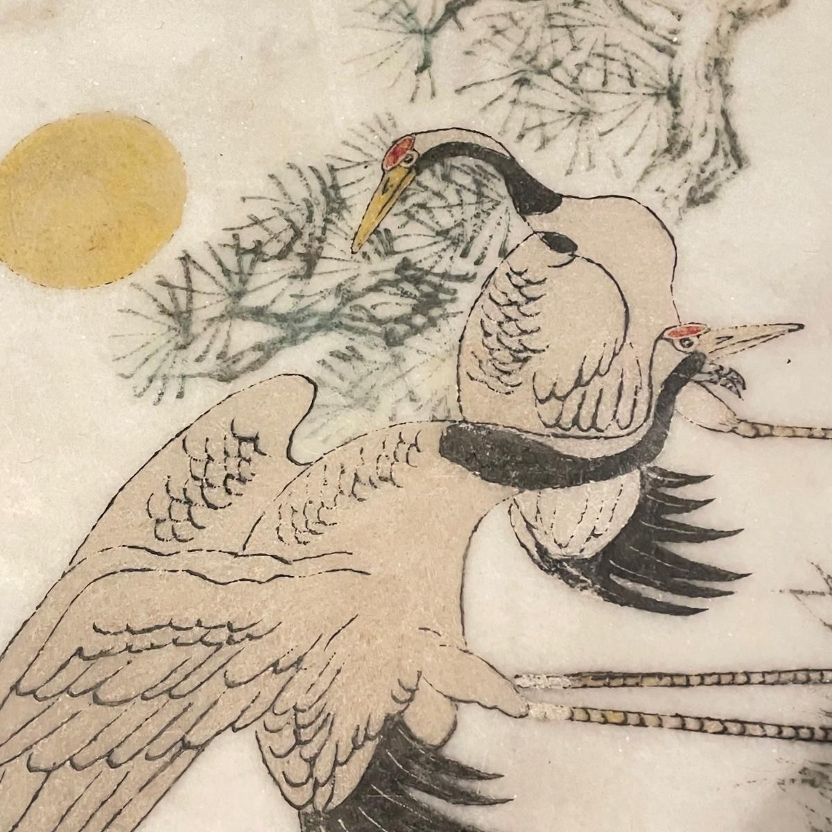 This lovely cutting board is marble and has a pair of hand painted sand cranes. Lot also includes a porcelain figurine that does have a broken toe, a book abs a small ceramic vase.