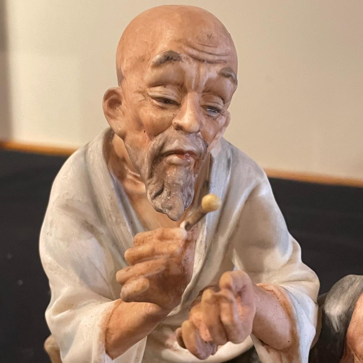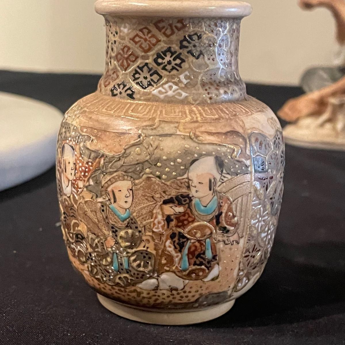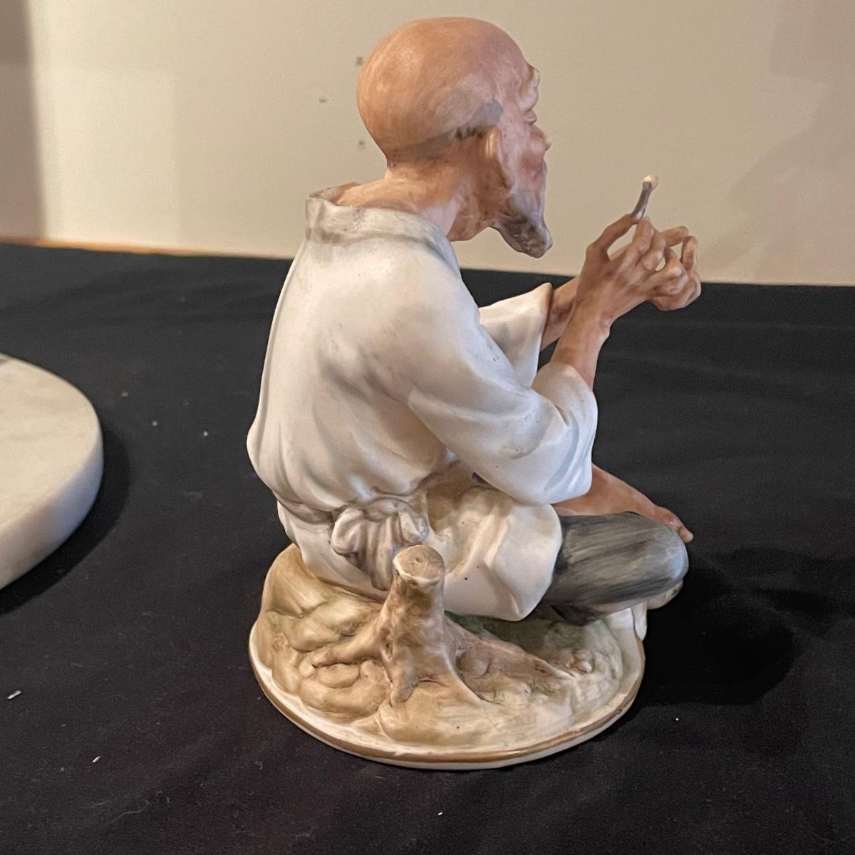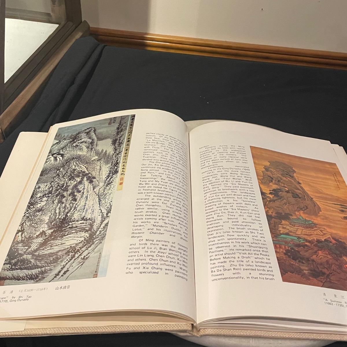 This lovely cutting board is marble and has a pair of hand painted sand cranes. Lot also includes a porcelain figurine that does have a broken toe, a book abs a small ceramic vase.