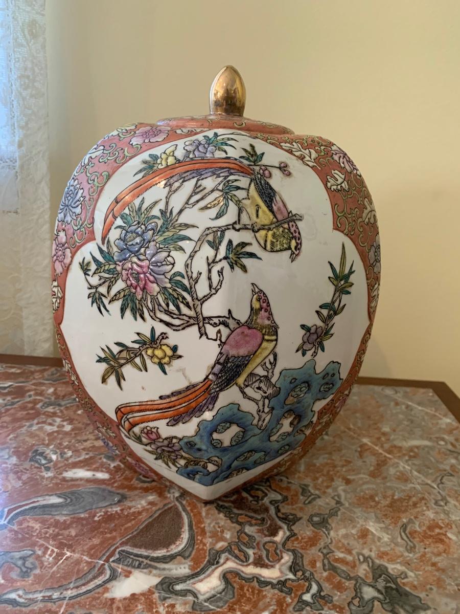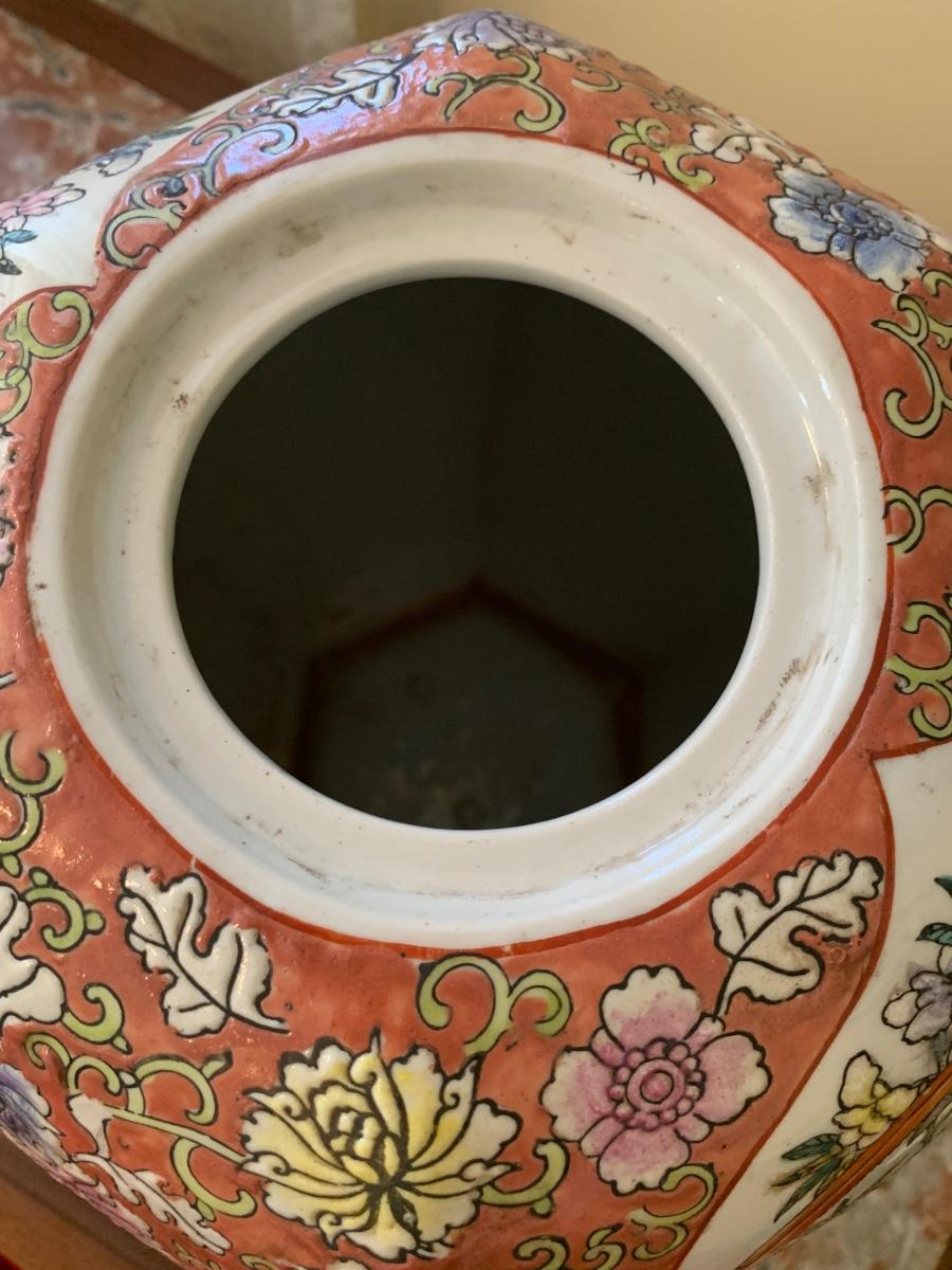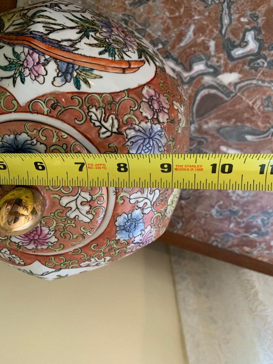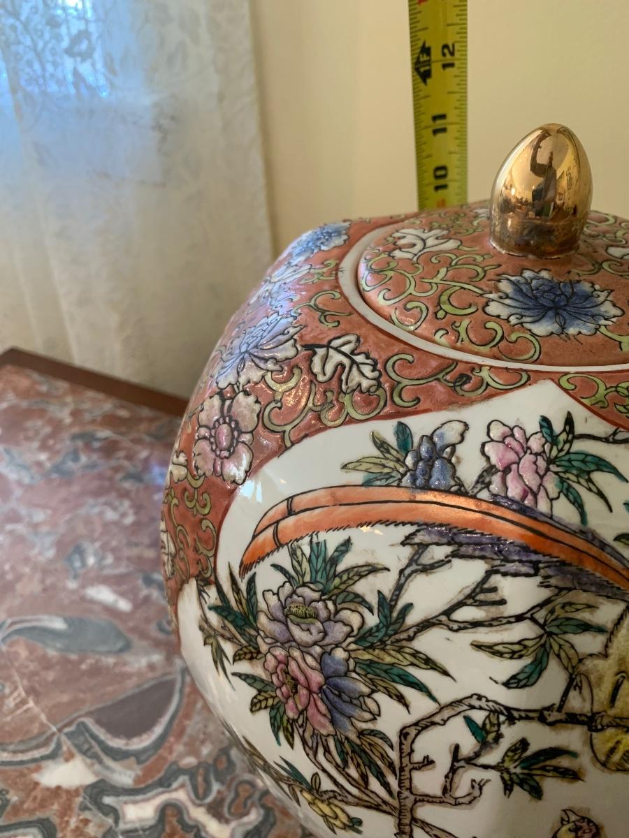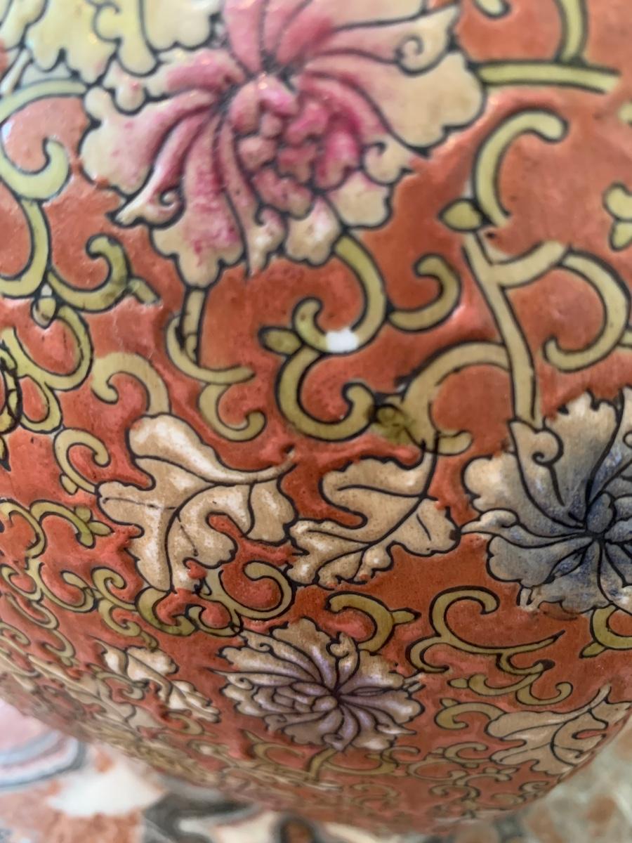 Painted porcelain vase. Beautiful design. Overall excellent condition except for very tiny chip in finish as shown in photo 12" tall