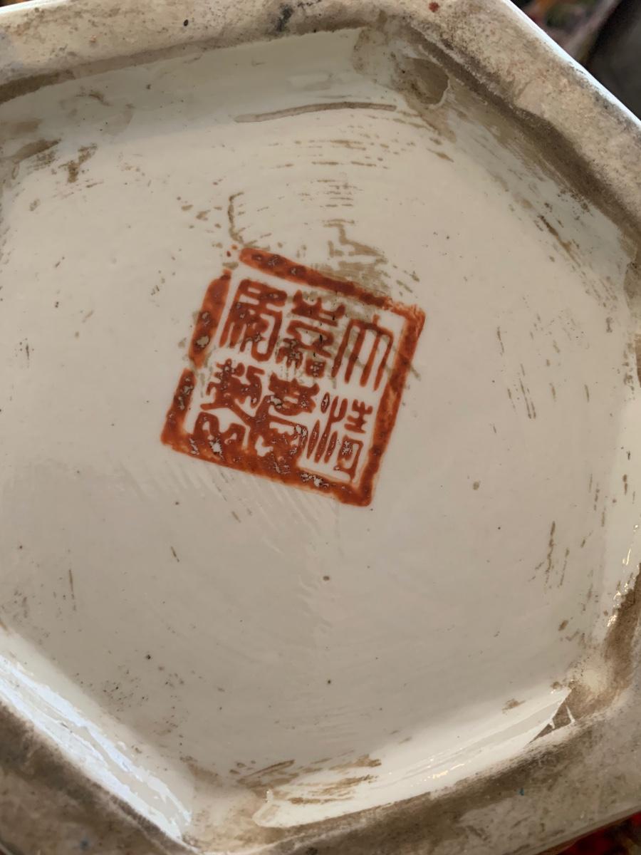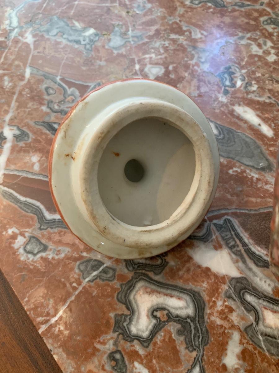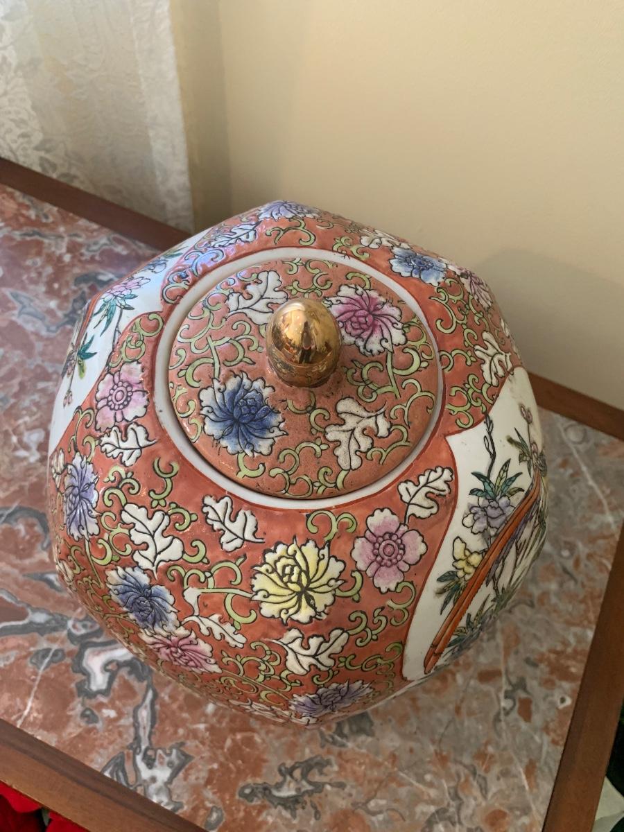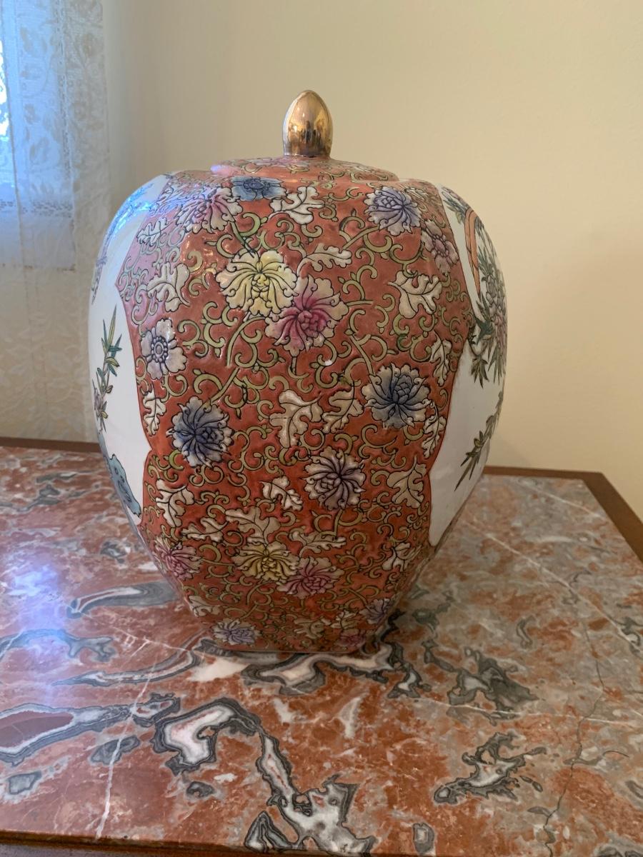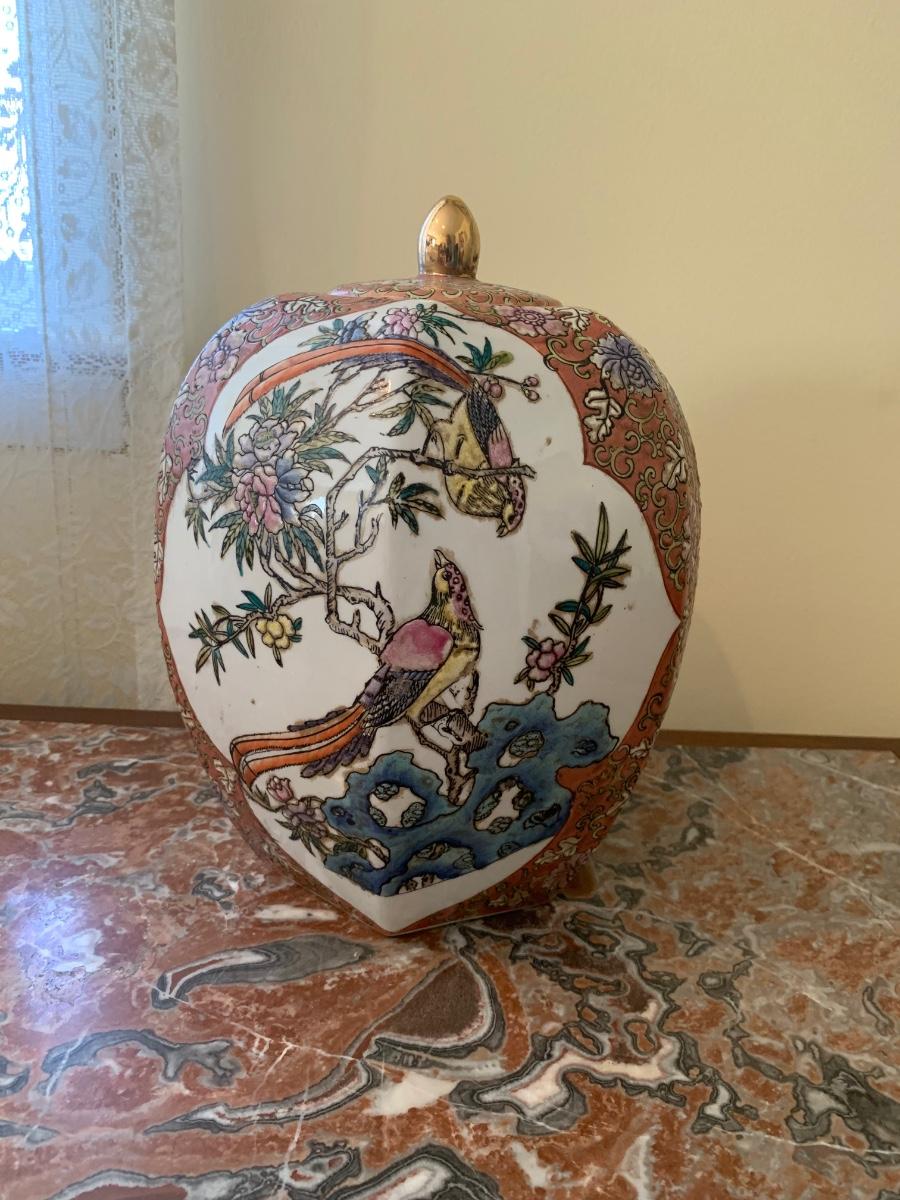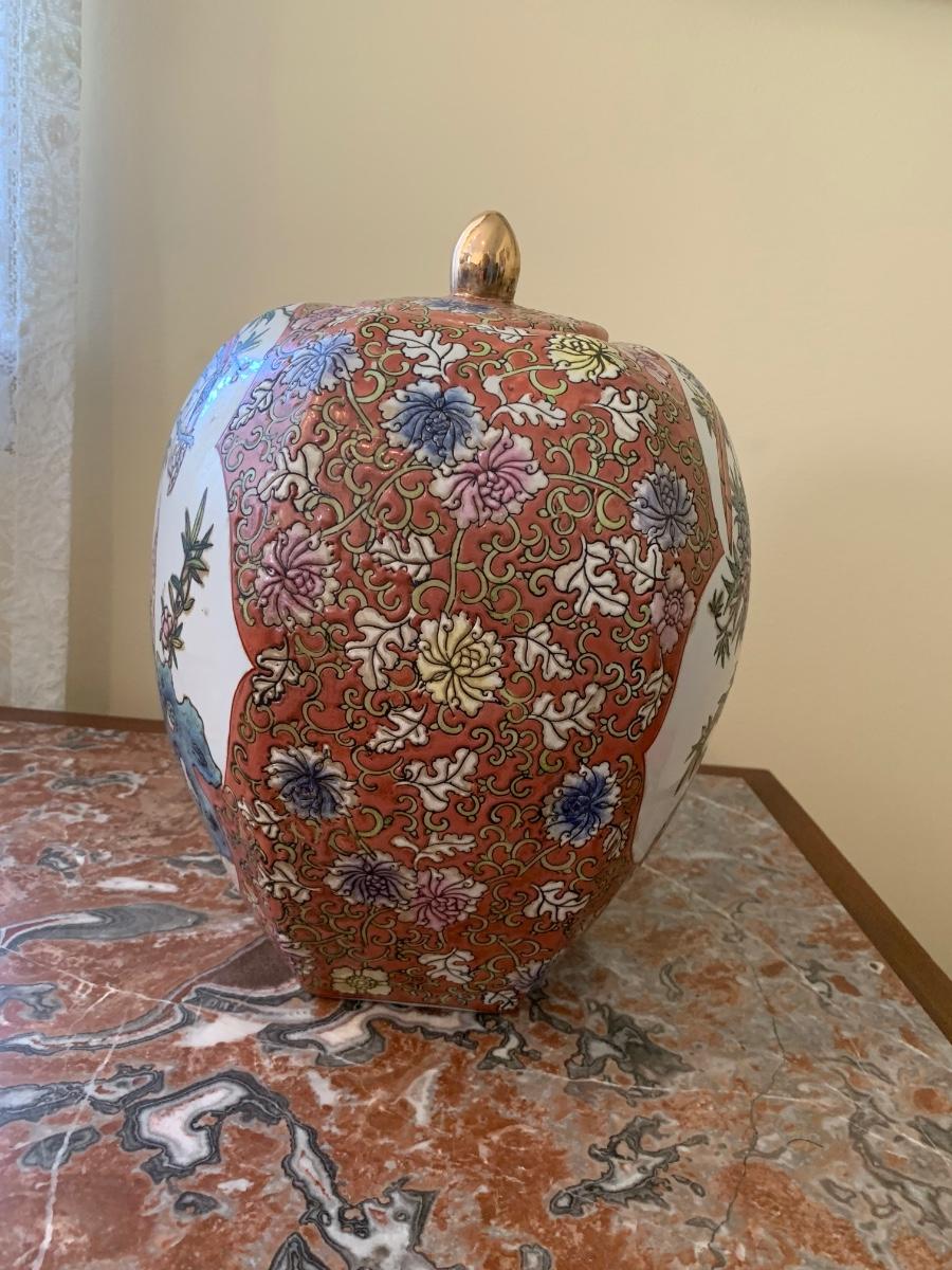 Painted porcelain vase. Beautiful design. Overall excellent condition except for very tiny chip in finish as shown in photo 12" tall
