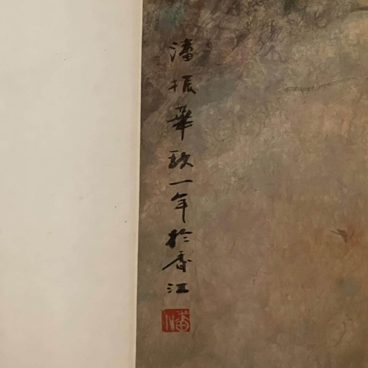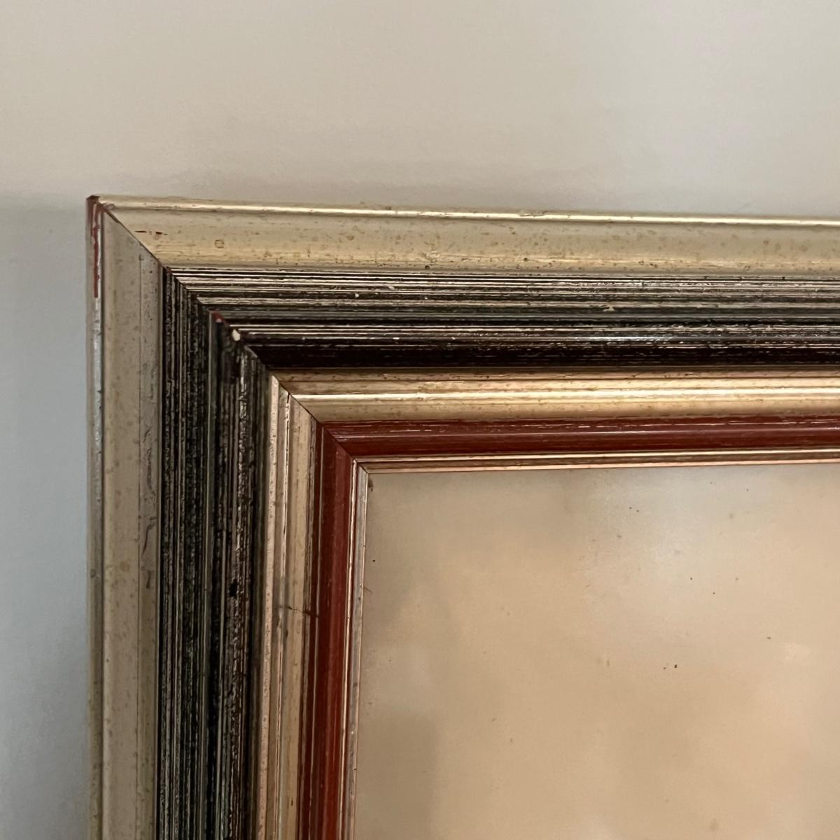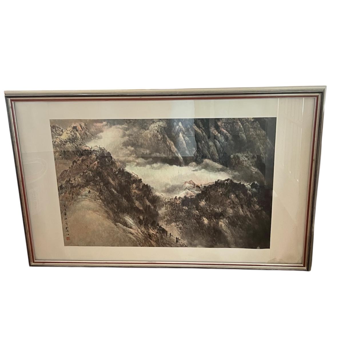 Beautiful landscape painting, possibly an original. It has a water mark in the lower right hand corner, see photo. Art is matted and mounted under glass in a large silver painted wooden frame.