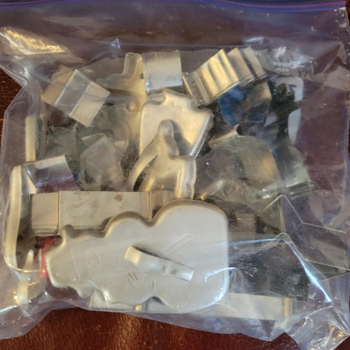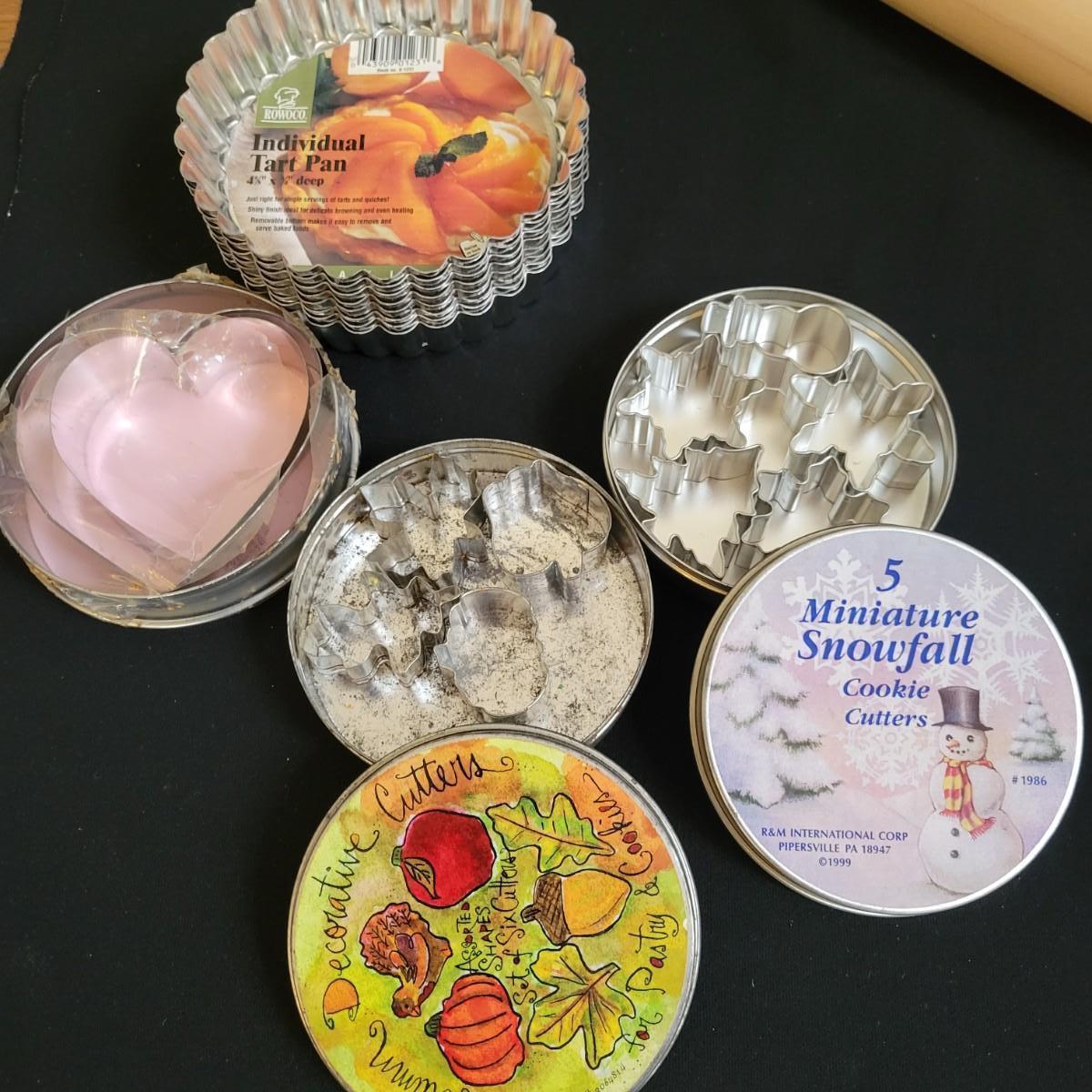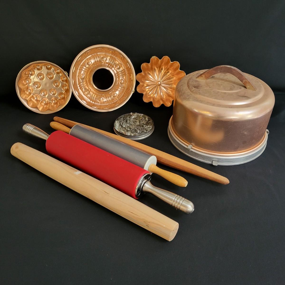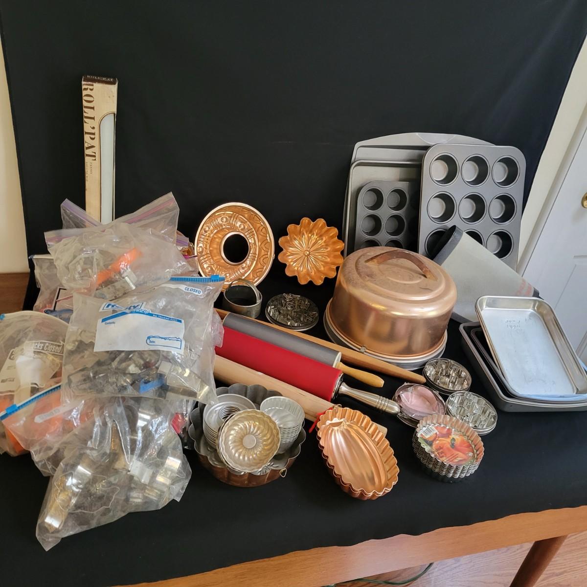 A huge assortment of baking accessories. Included are over 10 bags of cookie cutters that are animal and Christmas themed also include tins of cutters, many of which are vintage. A vintage cake carrier, baking pans, muffin pans, cookie sheets, rolling pins, silicone mats, copper molds and more. See attached pictures for full inventory. The cake carrier measures approximately 11"D x 8.5"H. Local pickup only