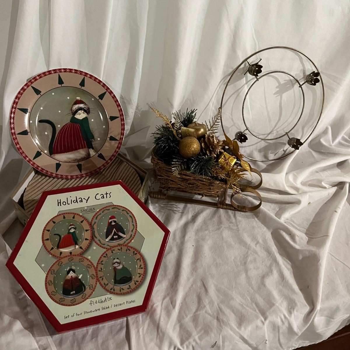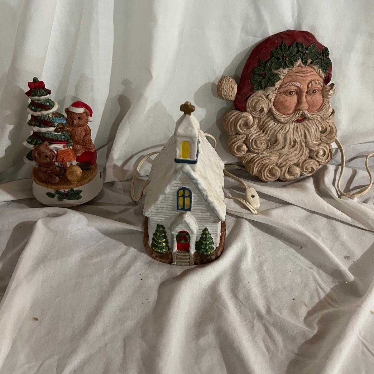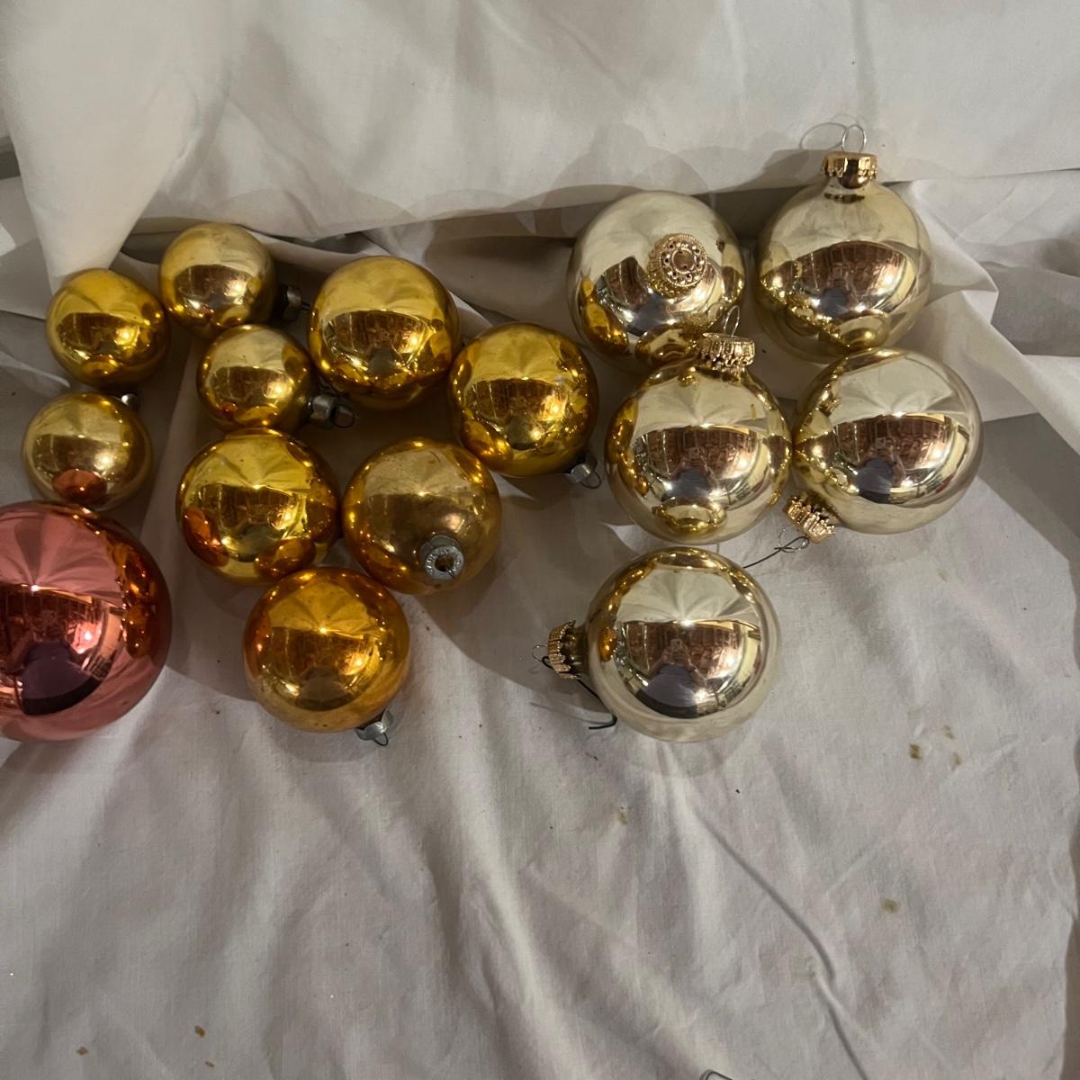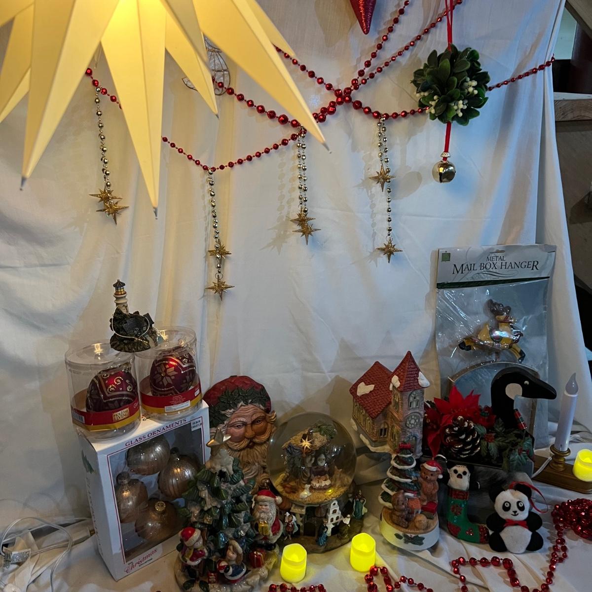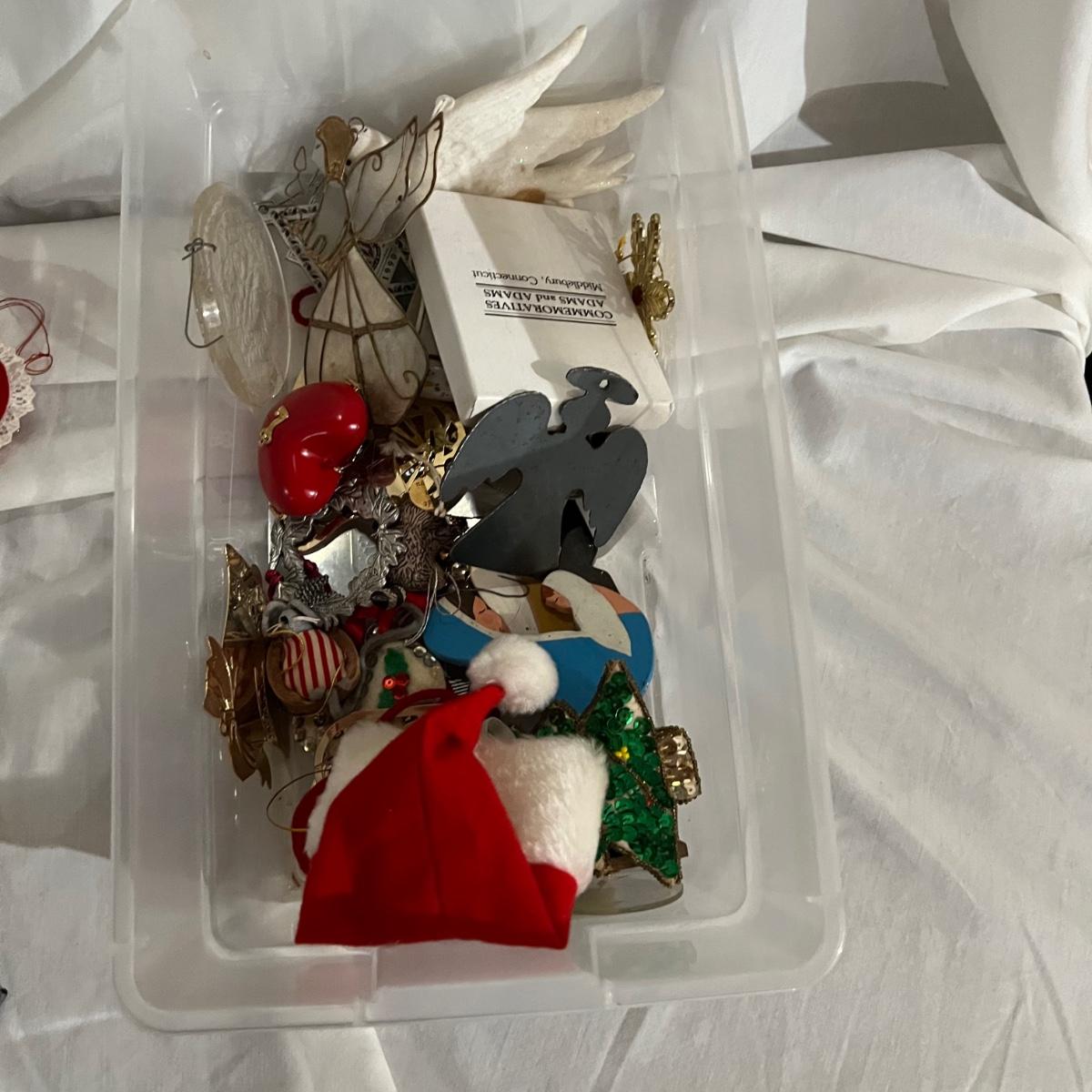 A wide assortment of many Christmas tree essentials and much more. Four Red and gold glass ornaments in original box, 15 gold glass and glitter ornaments, 23 Red and gold satin balls, Nine red glitter balls, five teardrop ornaments in red, 15 miscellaneous 1.5” and 2.5” gold ornaments, 18 6” icicle ornaments, six tasseled ornaments, two glass globes with the names Becky and Bob embossed, angel ornaments, 35 1.5” battery operated tea light-size candles that twinkle. Window lights, Seven 7” brass octagon bases with cords, two 7” round base corded, one 8” corded square base light. Two angel candles, one 5.5” H x 5”D and one 4”H x 3.5”D. A round blue table candle, 7” tall red “candy” candle, three silver flame battery candles with dimmer (appears to have never been used), 16 plastic cold-tone battery/cordless window candles. Lighted porcelain-like church and Christmas tree, four stoneware cat plates, and a beautiful 20 inch star fixture (please see photos for detailed picture of small crack that doesn't affect functionality). And even three large holiday storage bins included to carry away your holiday treasures! These items and more.