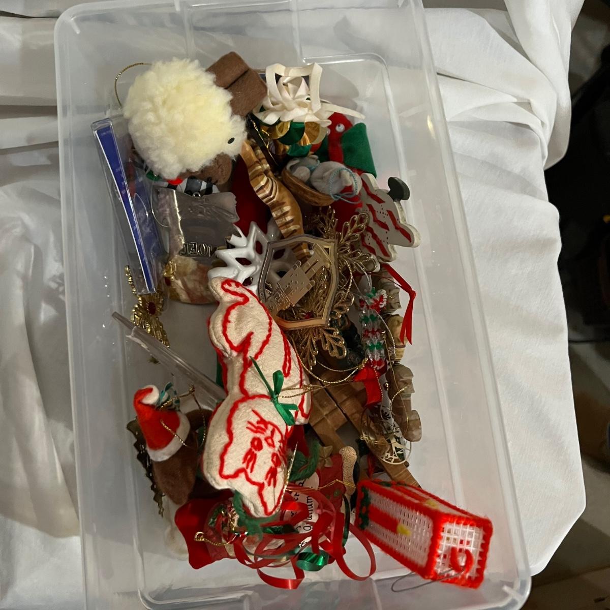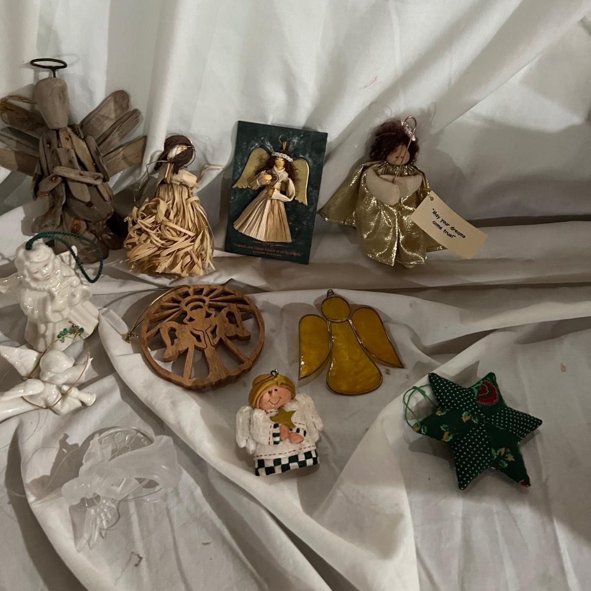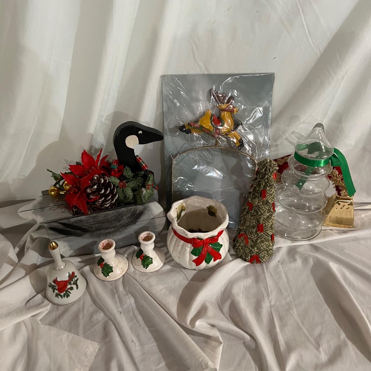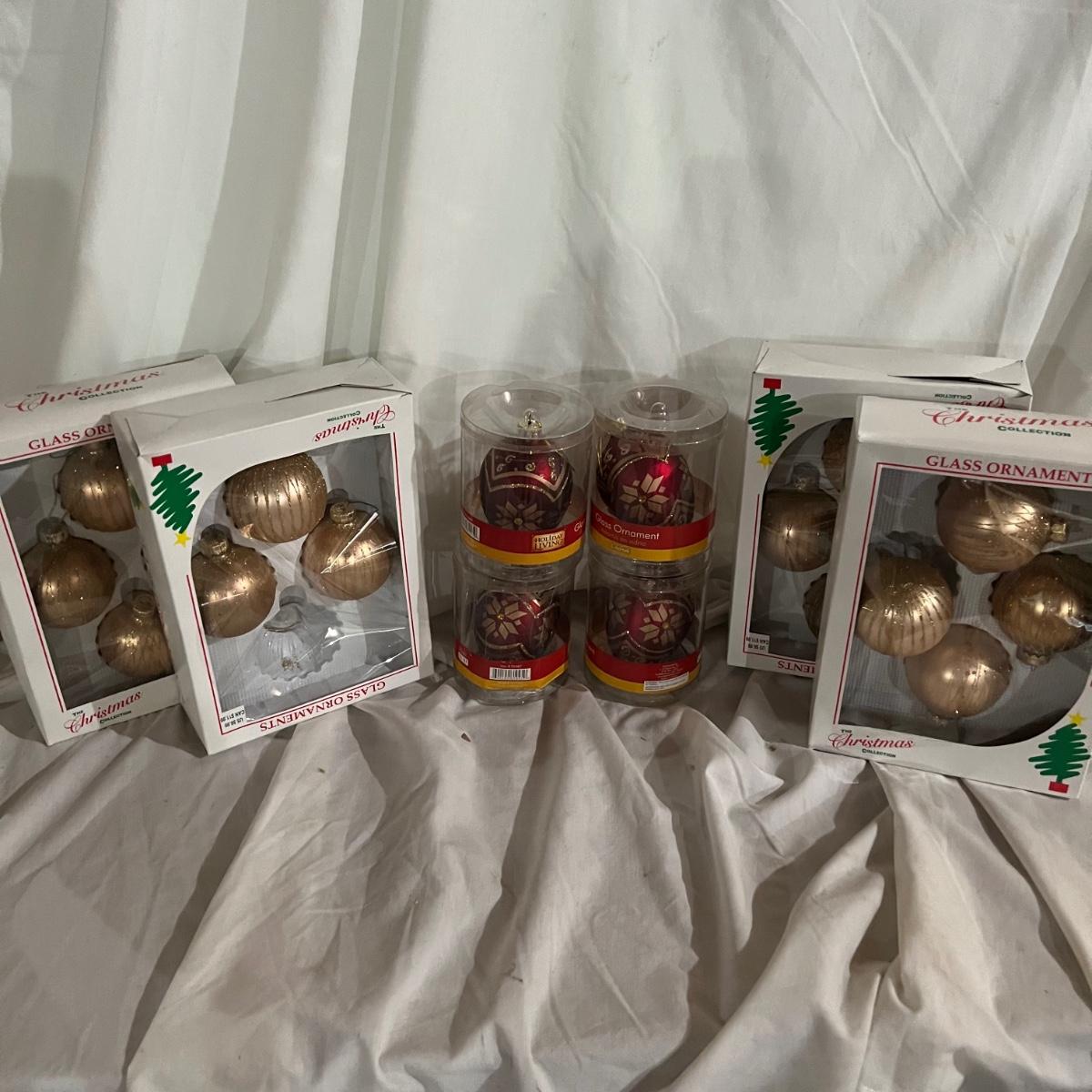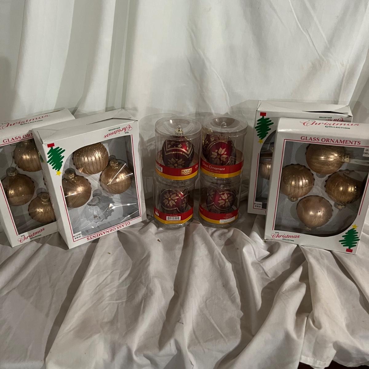 A wide assortment of many Christmas tree essentials and much more. Four Red and gold glass ornaments in original box, 15 gold glass and glitter ornaments, 23 Red and gold satin balls, Nine red glitter balls, five teardrop ornaments in red, 15 miscellaneous 1.5” and 2.5” gold ornaments, 18 6” icicle ornaments, six tasseled ornaments, two glass globes with the names Becky and Bob embossed, angel ornaments, 35 1.5” battery operated tea light-size candles that twinkle. Window lights, Seven 7” brass octagon bases with cords, two 7” round base corded, one 8” corded square base light. Two angel candles, one 5.5” H x 5”D and one 4”H x 3.5”D. A round blue table candle, 7” tall red “candy” candle, three silver flame battery candles with dimmer (appears to have never been used), 16 plastic cold-tone battery/cordless window candles. Lighted porcelain-like church and Christmas tree, four stoneware cat plates, and a beautiful 20 inch star fixture (please see photos for detailed picture of small crack that doesn't affect functionality). And even three large holiday storage bins included to carry away your holiday treasures! These items and more.