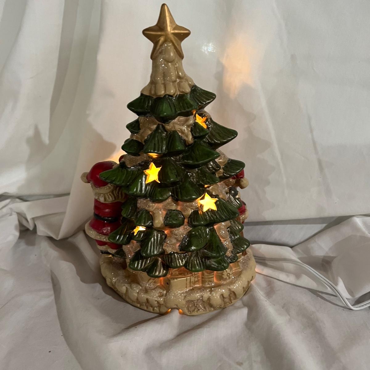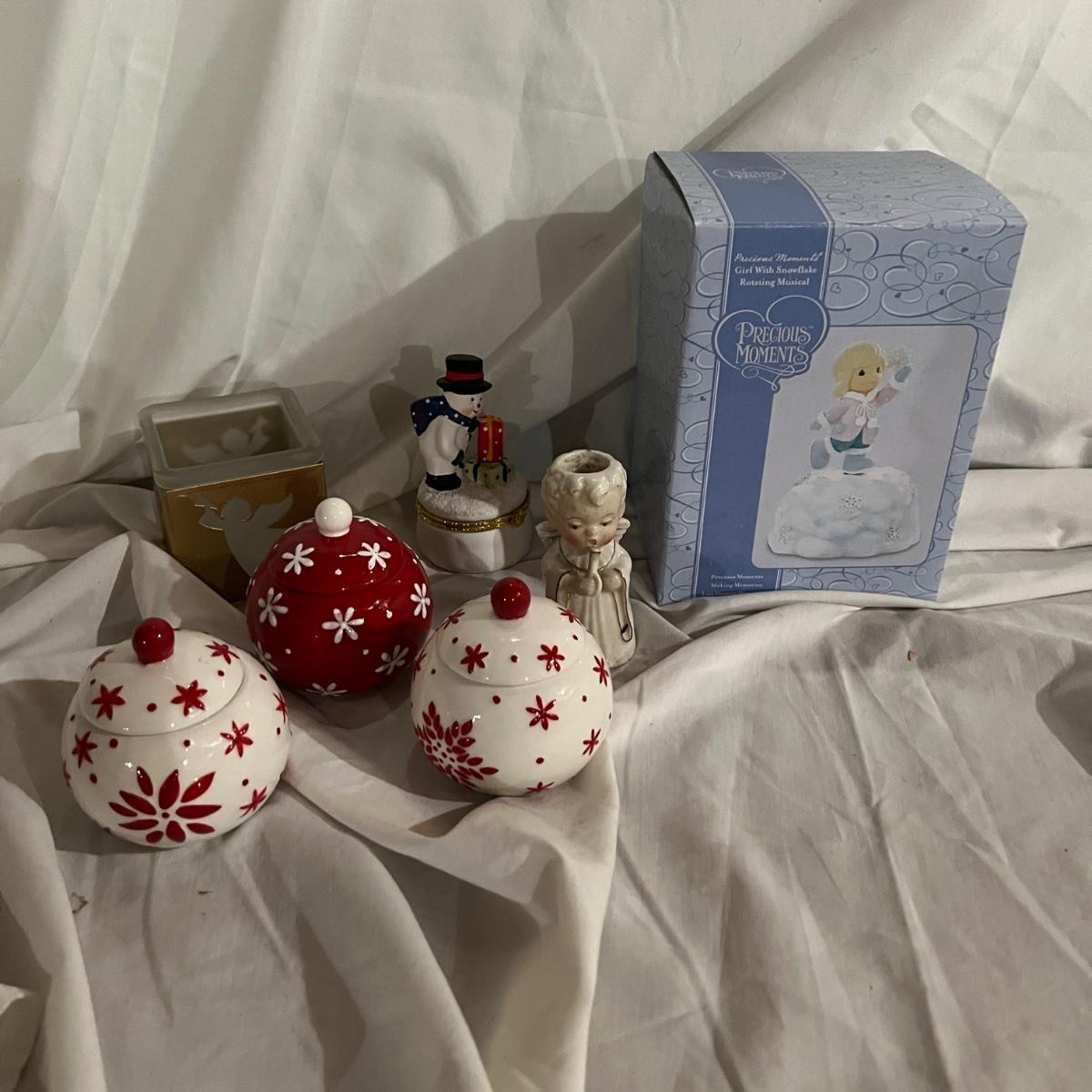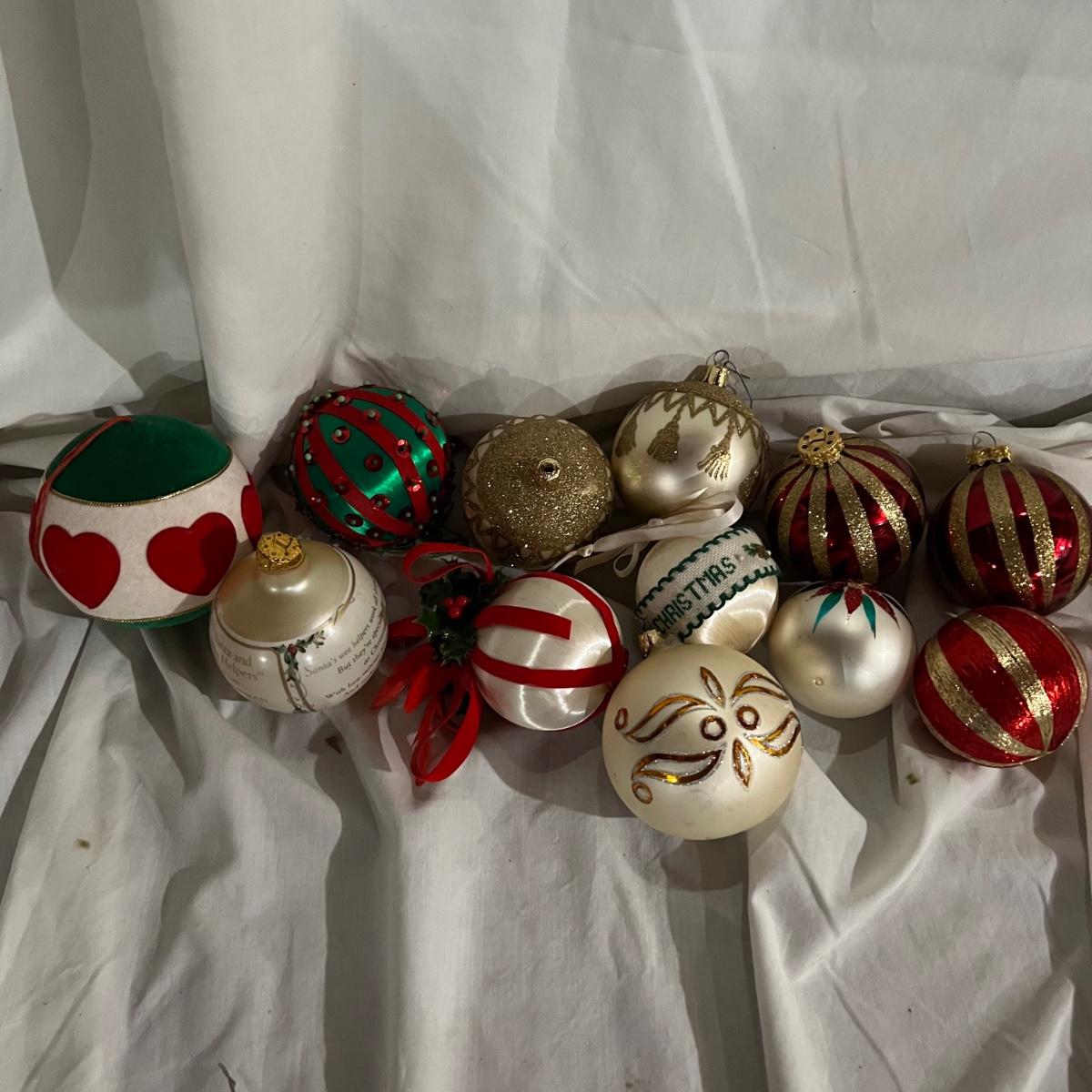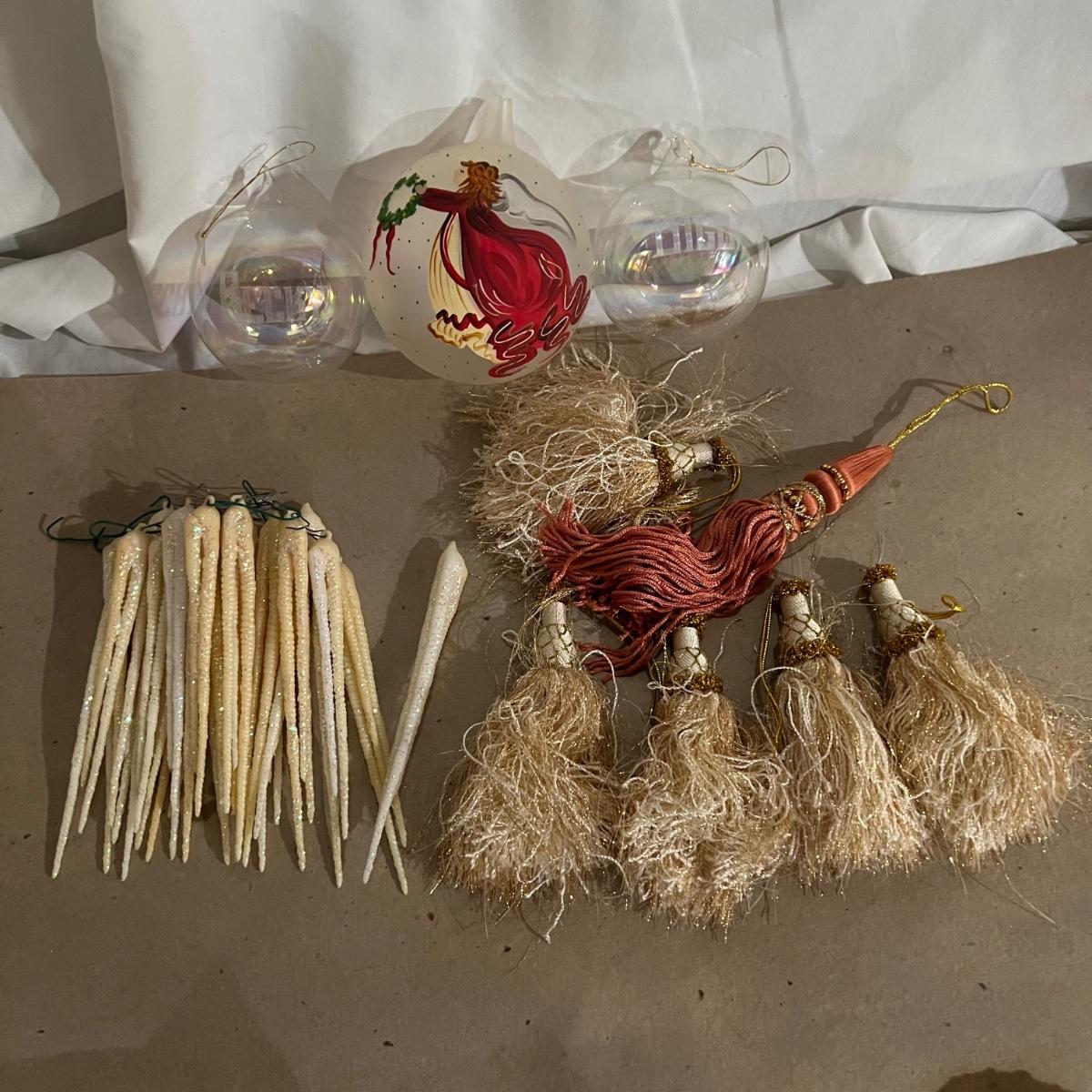A wide assortment of many Christmas tree essentials and much more. Four Red and gold glass ornaments in original box, 15 gold glass and glitter ornaments, 23 Red and gold satin balls, Nine red glitter balls, five teardrop ornaments in red, 15 miscellaneous 1.5” and 2.5” gold ornaments, 18 6” icicle ornaments, six tasseled ornaments, two glass globes with the names Becky and Bob embossed, angel ornaments, 35 1.5” battery operated tea light-size candles that twinkle. Window lights, Seven 7” brass octagon bases with cords, two 7” round base corded, one 8” corded square base light. Two angel candles, one 5.5” H x 5”D and one 4”H x 3.5”D. A round blue table candle, 7” tall red “candy” candle, three silver flame battery candles with dimmer (appears to have never been used), 16 plastic cold-tone battery/cordless window candles. Lighted porcelain-like church and Christmas tree, four stoneware cat plates, and a beautiful 20 inch star fixture (please see photos for detailed picture of small crack that doesn't affect functionality). And even three large holiday storage bins included to carry away your holiday treasures! These items and more.