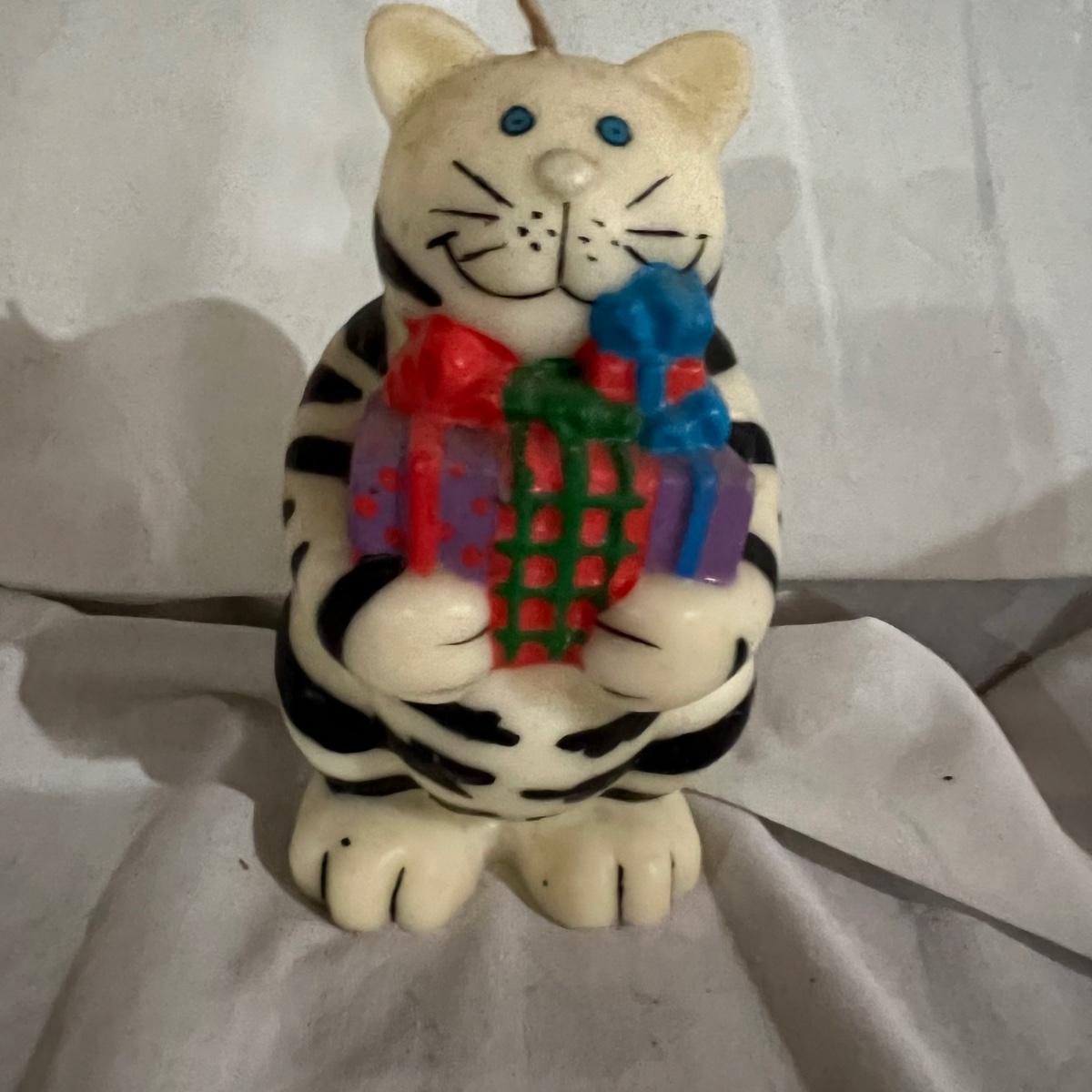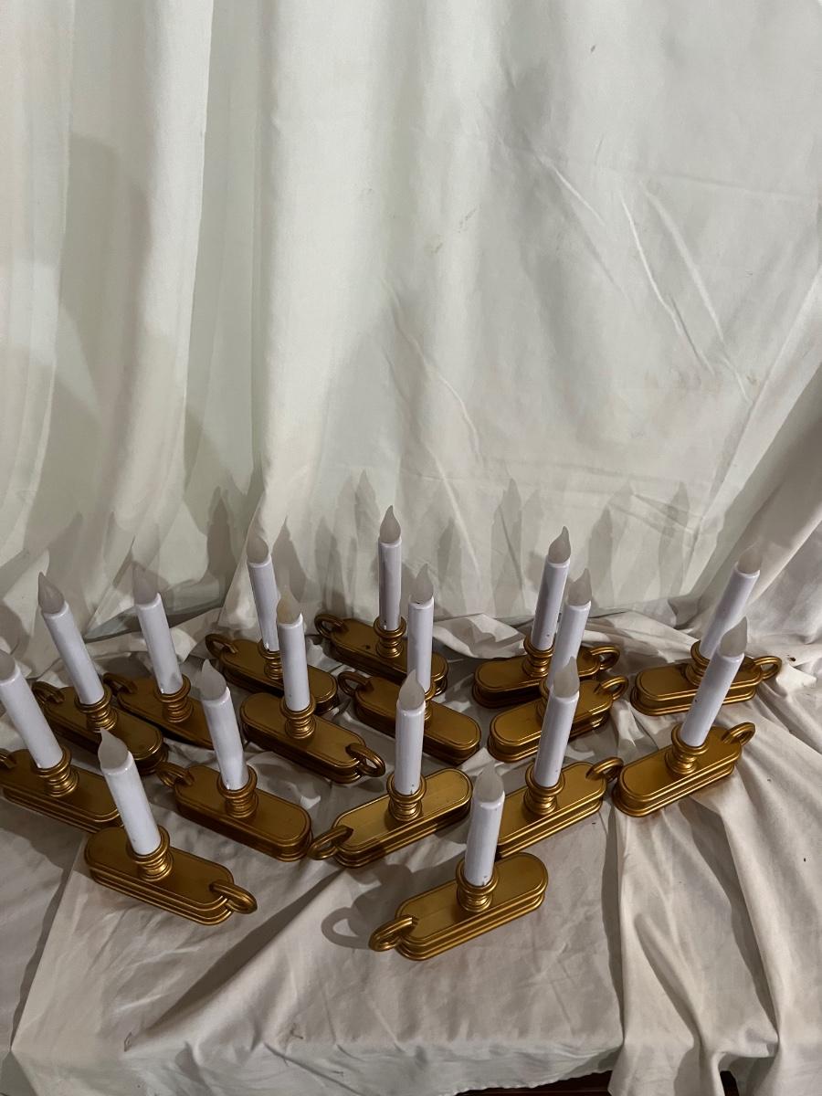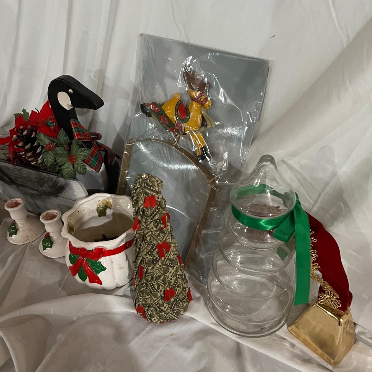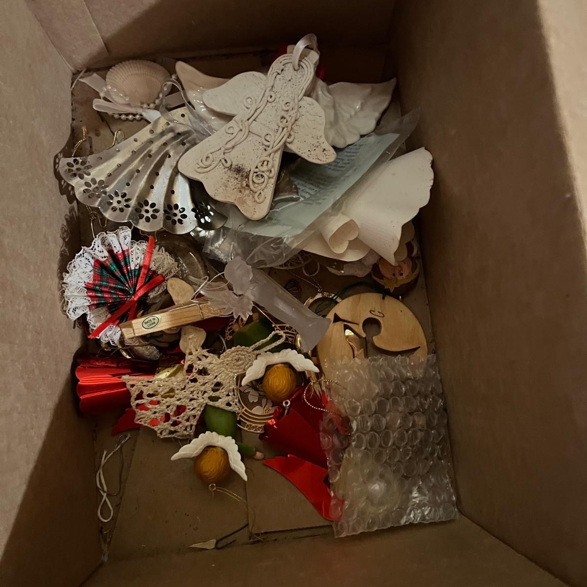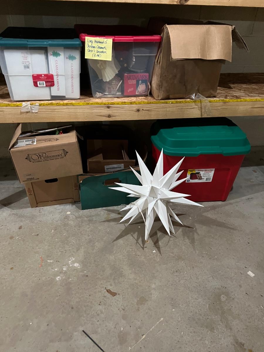 A wide assortment of many Christmas tree essentials and much more. Four Red and gold glass ornaments in original box, 15 gold glass and glitter ornaments, 23 Red and gold satin balls, Nine red glitter balls, five teardrop ornaments in red, 15 miscellaneous 1.5” and 2.5” gold ornaments, 18 6” icicle ornaments, six tasseled ornaments, two glass globes with the names Becky and Bob embossed, angel ornaments, 35 1.5” battery operated tea light-size candles that twinkle. Window lights, Seven 7” brass octagon bases with cords, two 7” round base corded, one 8” corded square base light. Two angel candles, one 5.5” H x 5”D and one 4”H x 3.5”D. A round blue table candle, 7” tall red “candy” candle, three silver flame battery candles with dimmer (appears to have never been used), 16 plastic cold-tone battery/cordless window candles. Lighted porcelain-like church and Christmas tree, four stoneware cat plates, and a beautiful 20 inch star fixture (please see photos for detailed picture of small crack that doesn't affect functionality). And even three large holiday storage bins included to carry away your holiday treasures! These items and more.