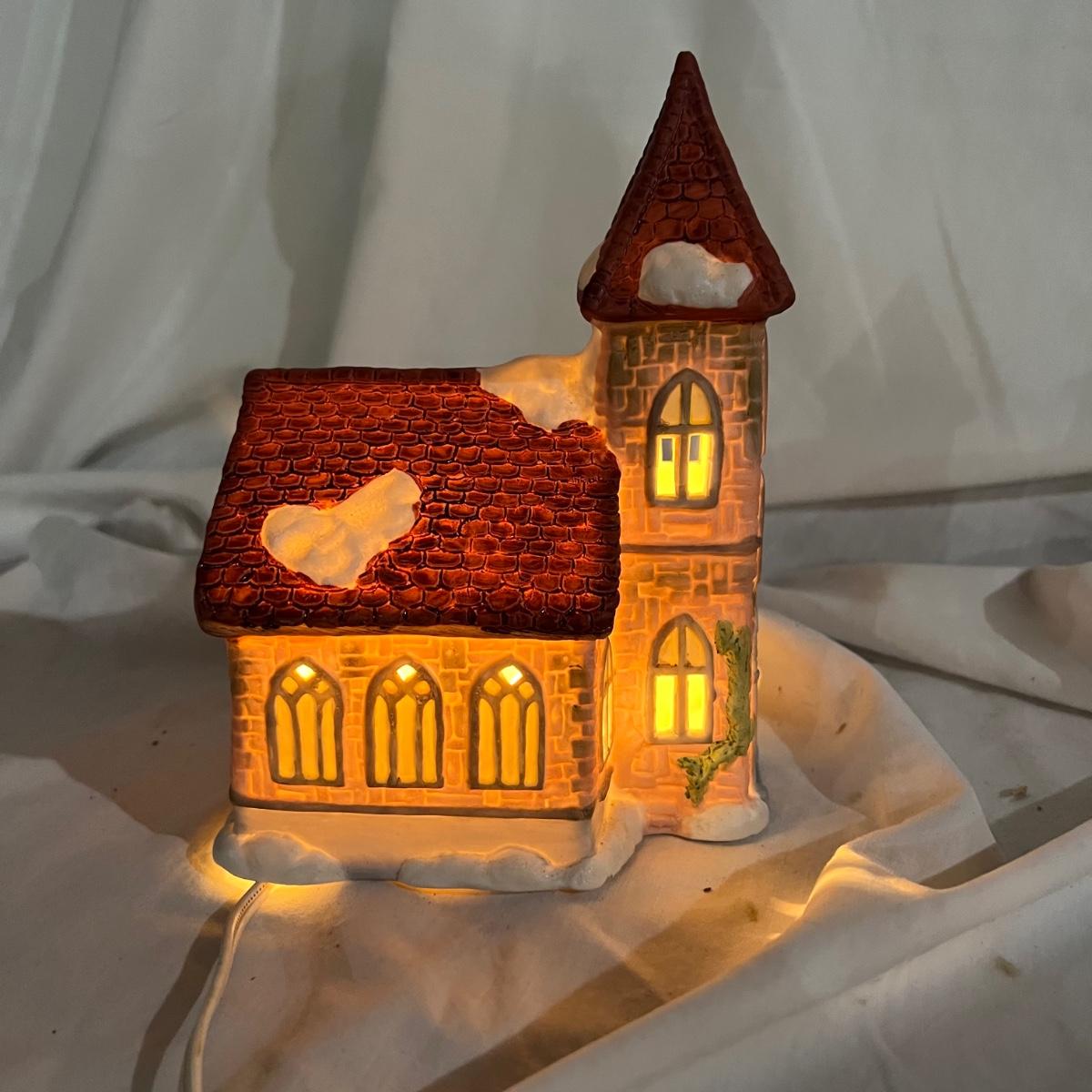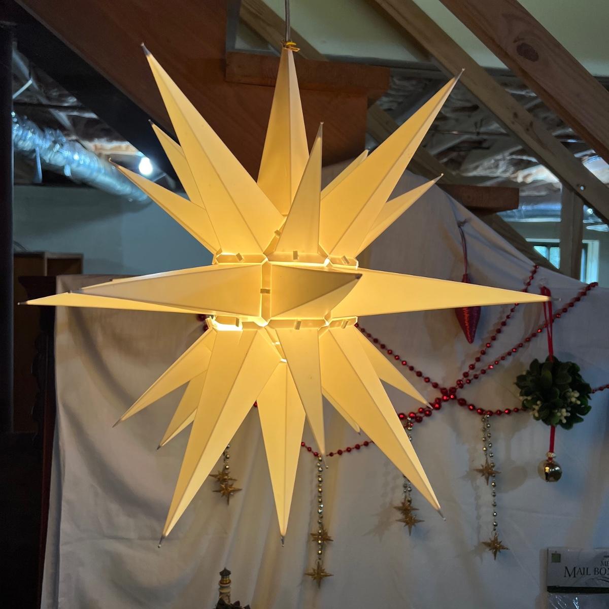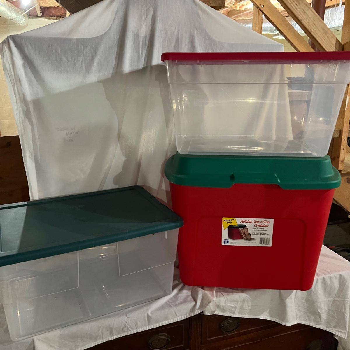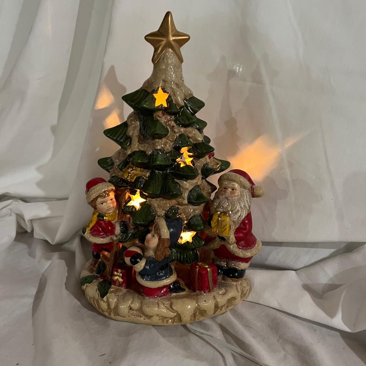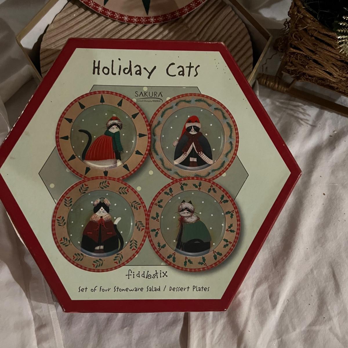 A wide assortment of many Christmas tree essentials and much more. Four Red and gold glass ornaments in original box, 15 gold glass and glitter ornaments, 23 Red and gold satin balls, Nine red glitter balls, five teardrop ornaments in red, 15 miscellaneous 1.5” and 2.5” gold ornaments, 18 6” icicle ornaments, six tasseled ornaments, two glass globes with the names Becky and Bob embossed, angel ornaments, 35 1.5” battery operated tea light-size candles that twinkle. Window lights, Seven 7” brass octagon bases with cords, two 7” round base corded, one 8” corded square base light. Two angel candles, one 5.5” H x 5”D and one 4”H x 3.5”D. A round blue table candle, 7” tall red “candy” candle, three silver flame battery candles with dimmer (appears to have never been used), 16 plastic cold-tone battery/cordless window candles. Lighted porcelain-like church and Christmas tree, four stoneware cat plates, and a beautiful 20 inch star fixture (please see photos for detailed picture of small crack that doesn't affect functionality). And even three large holiday storage bins included to carry away your holiday treasures! These items and more.