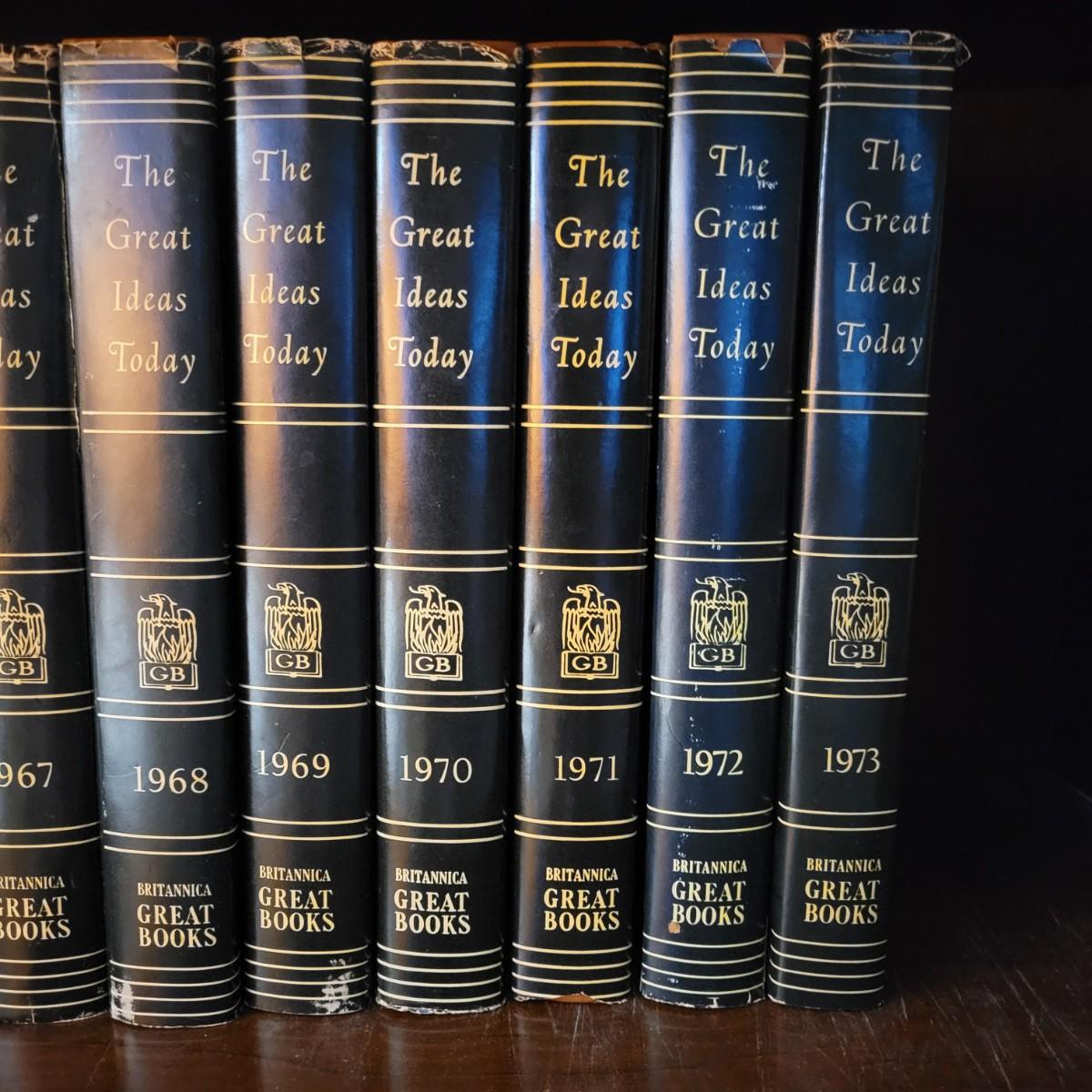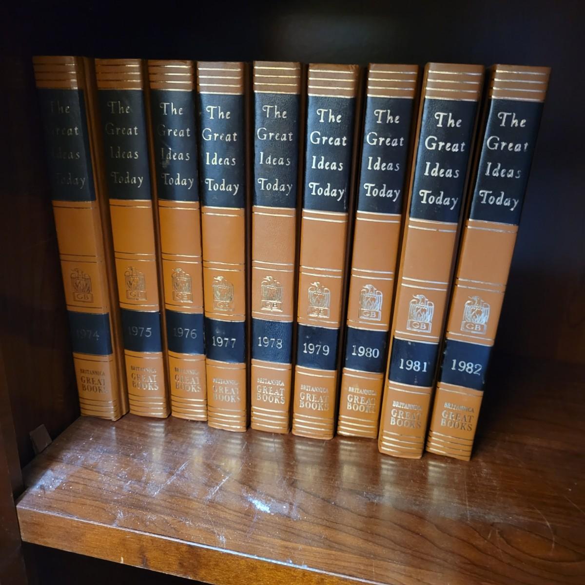 A large assortment of The Great Books of the Western World in good condition. This lot includes over 80 books, a majority of which are leather-bound books. Most of the lot is a collection of great books by Brittanica and includes titles like Darwin, Marx, Tolstoy, Milton, Descartes and many more. Also included is The Great Ideas of today by Brittanica covering the years of 1965 to 1982. Bookshelf is not included in this lot, but is available in this auction. Local pickup only