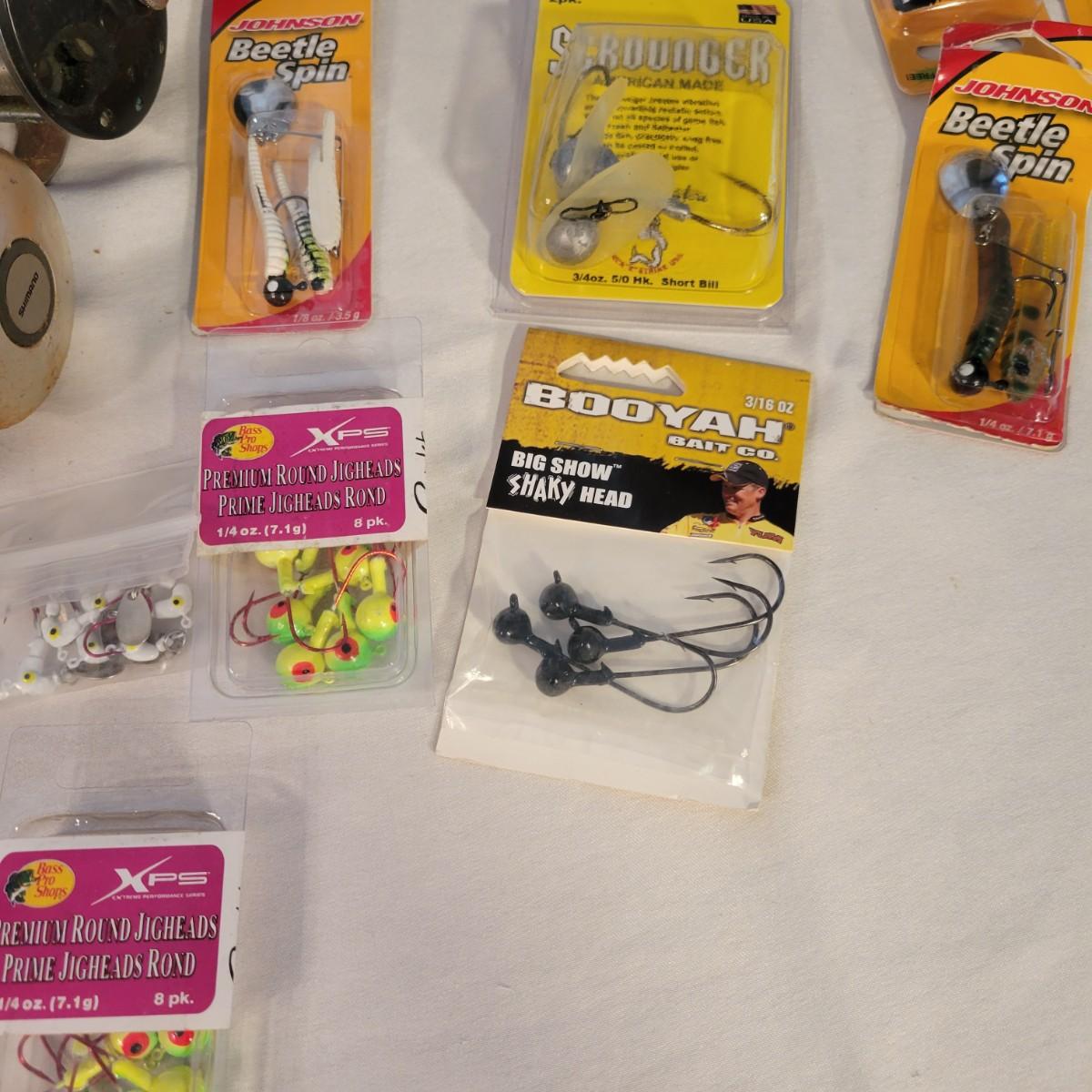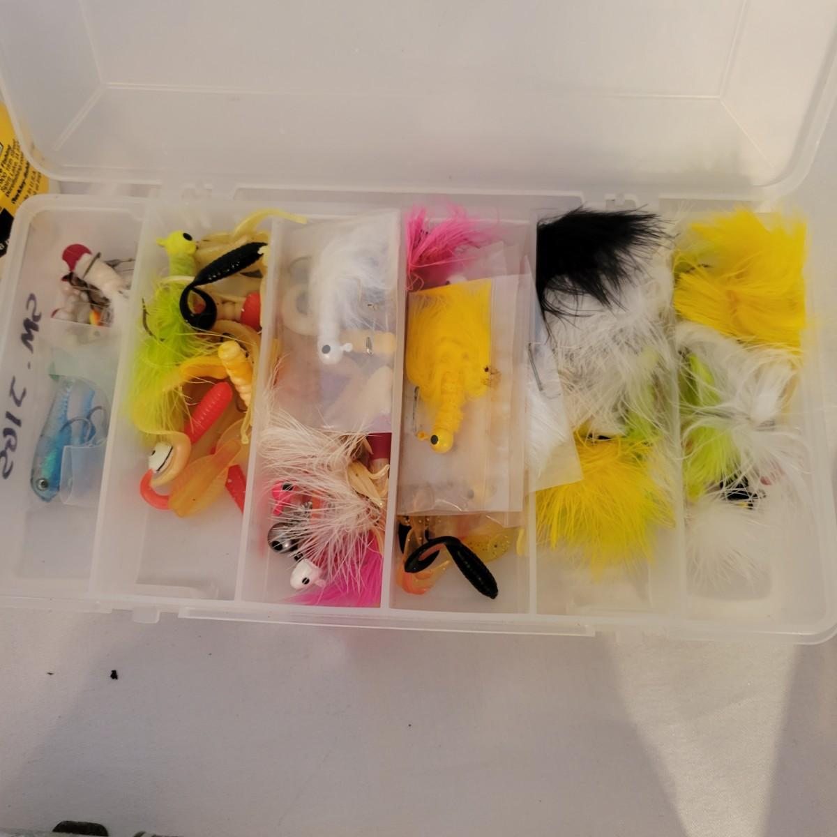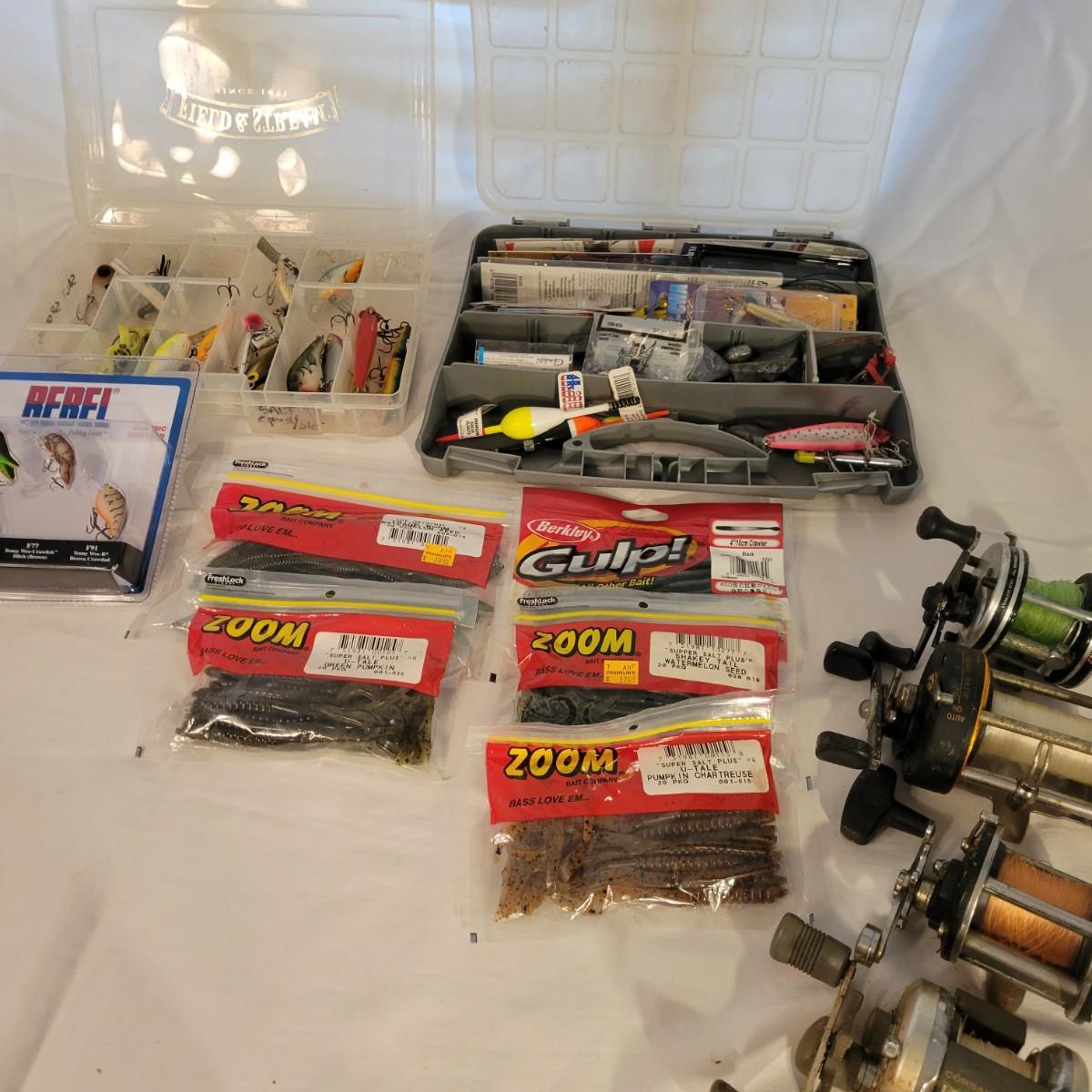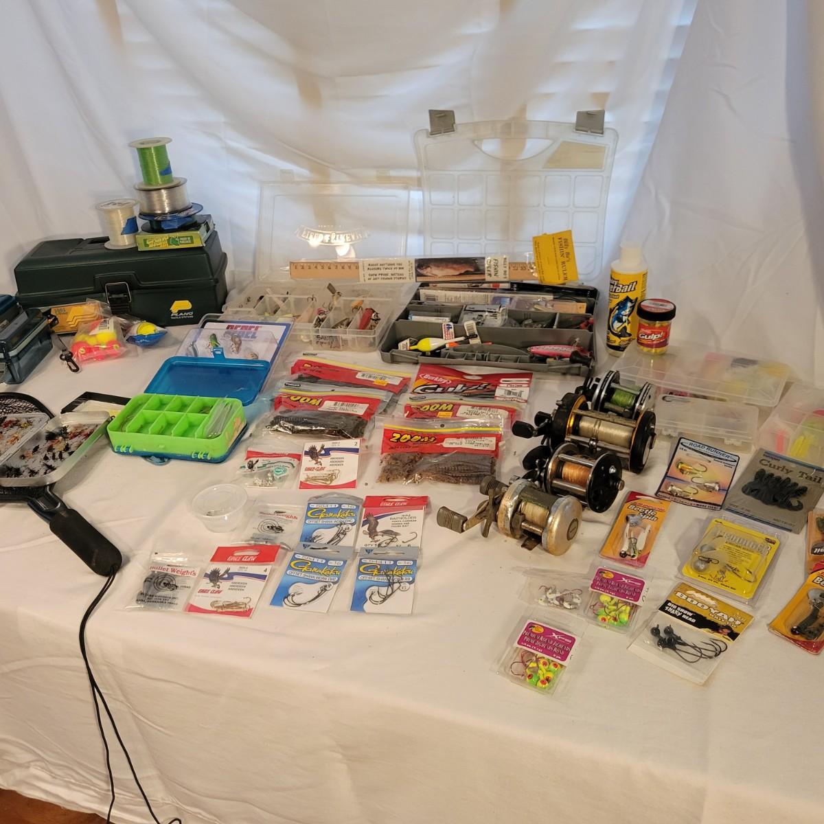 A large assortment of fishing gear, lures, reels and more in good condition. Many items are new and unused. Includes an assortment of crankbaits, soft plastics, jigs, jig heads and tackle boxes. A multitude of different hooks, sinkers, bobbers and leaders are also included. Four bait casting reels, a fly reel, a hand net, a casting net and much more. The grey tackle box with the clear top measures approximately 12.5" x 10" x 2". Shipping available. Shipping can be costly. We suggest calling our local UPS with dimensions and getting an estimate before bidding: (828) 252-6930