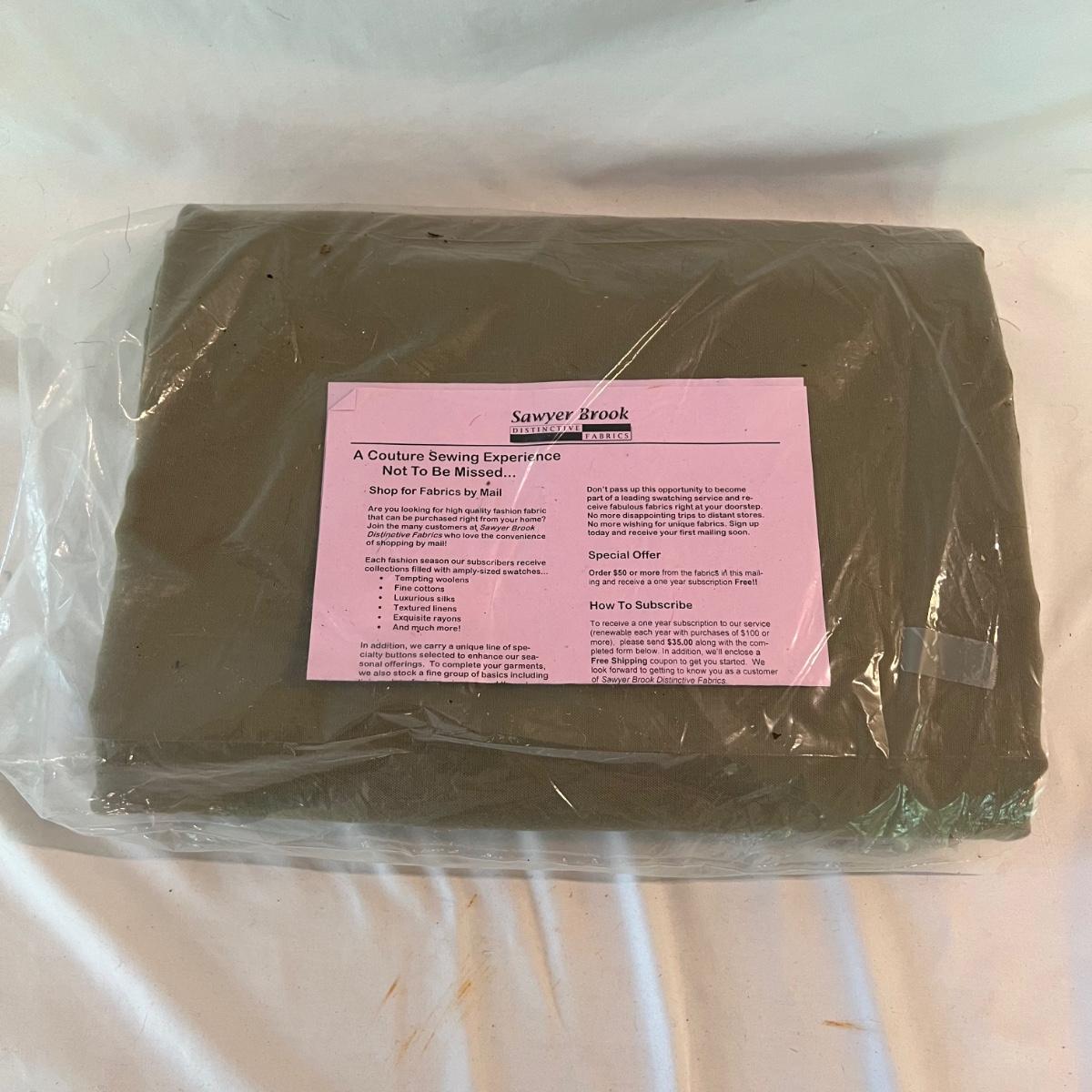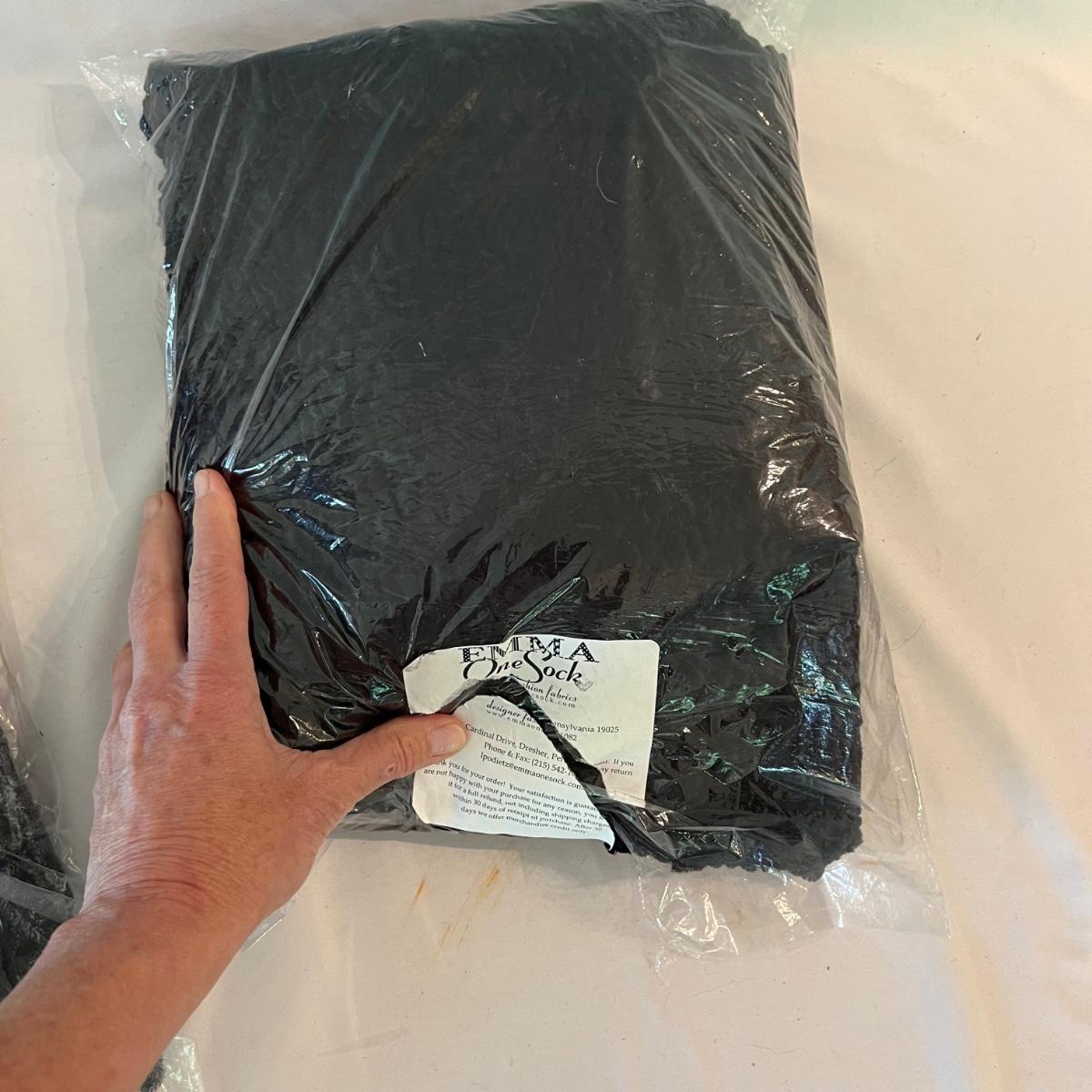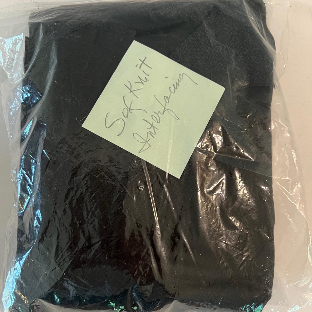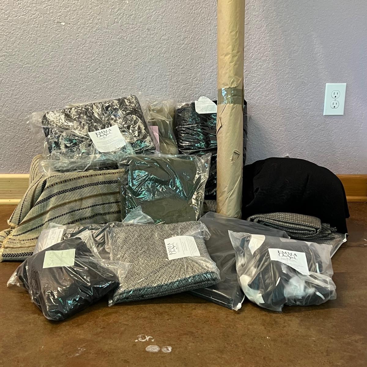 Twenty packages/sections for fabric. Lot includes one large roll of fabric. None of the packages have amounts/yardage notes or fiber content. Some feel wool-like, others acrylic-like (stretchy).