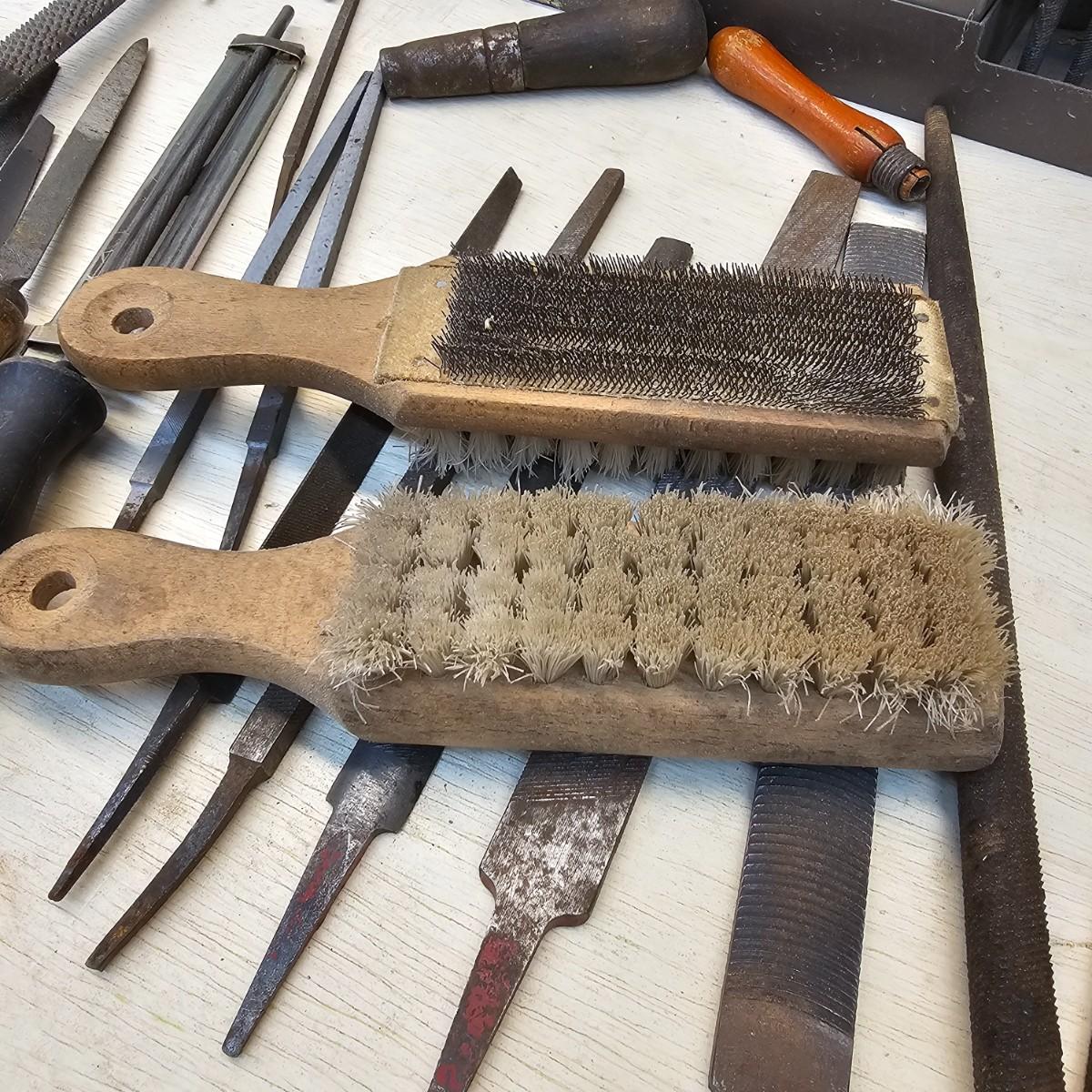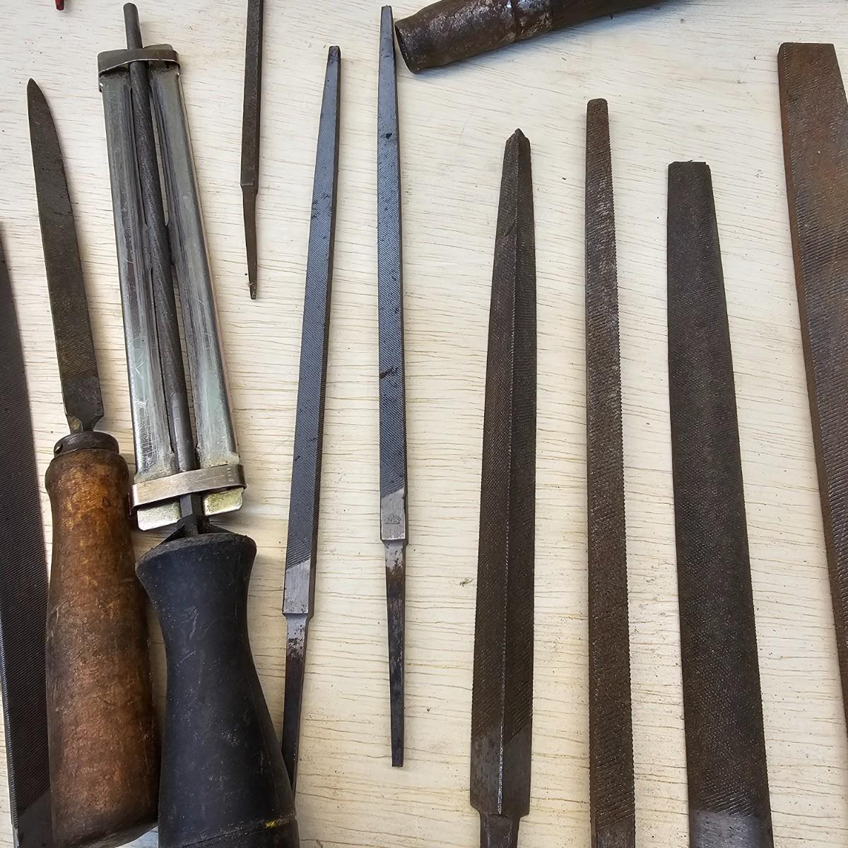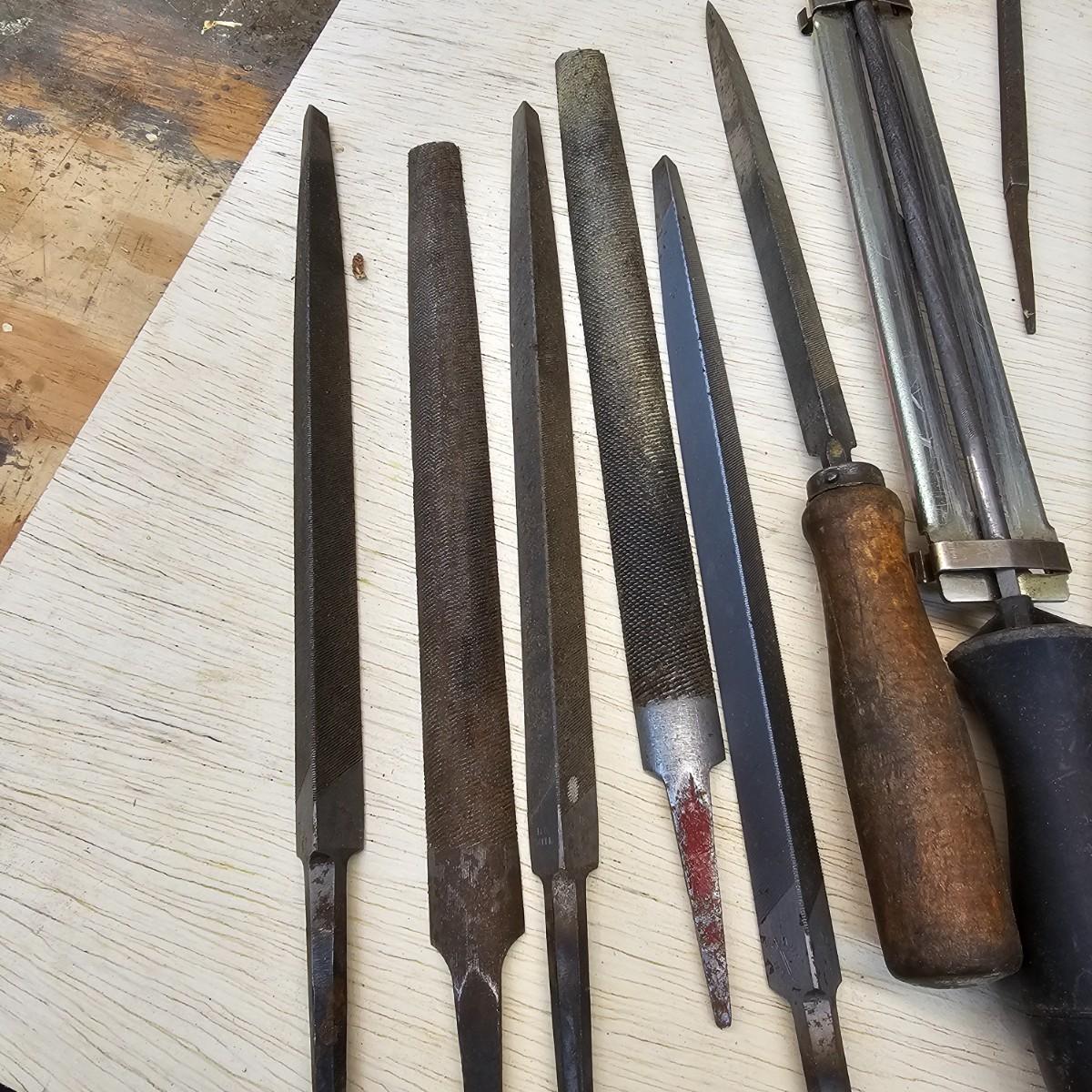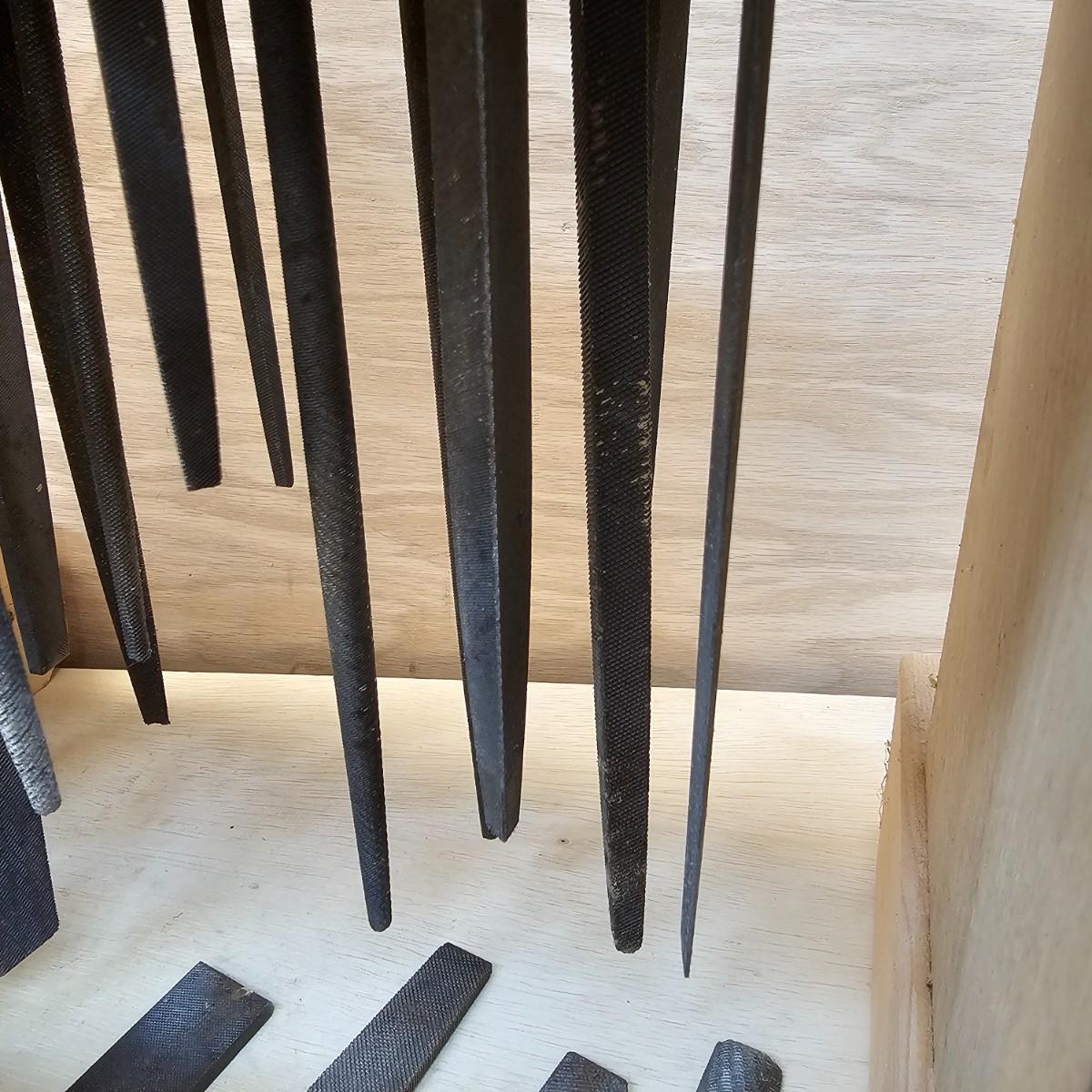 Flat, round, triangular, square, tapered. Fine cut to coarse, wood ramps and ruffles. Extra handles, two file cards plus two storage items. Most all files used. Sizes range from 8" to 18" long, from companies like Simcads, Black Diamond, Heller and Nicholson. Over 75 items here. See photos for details. Local pickup only.