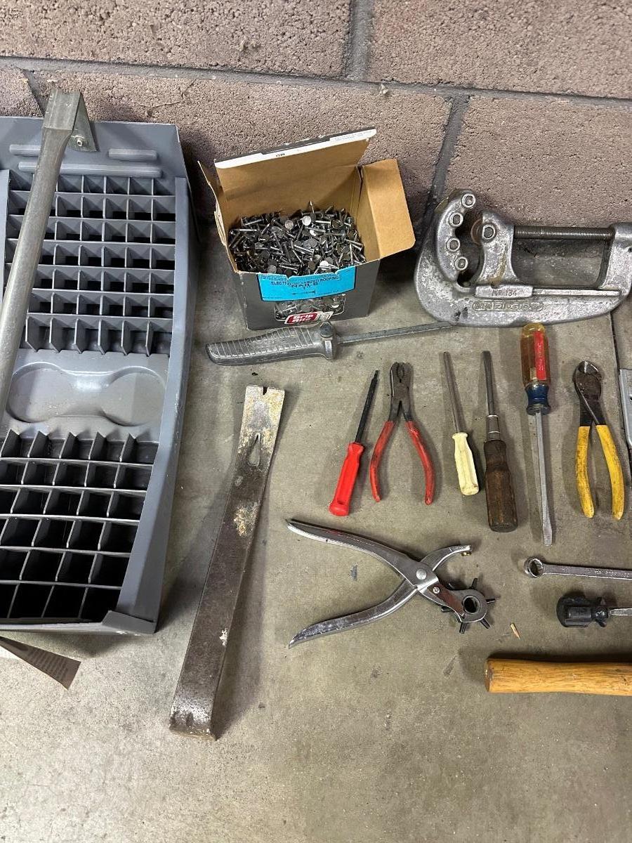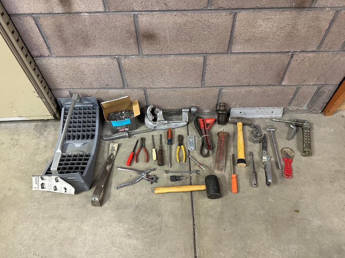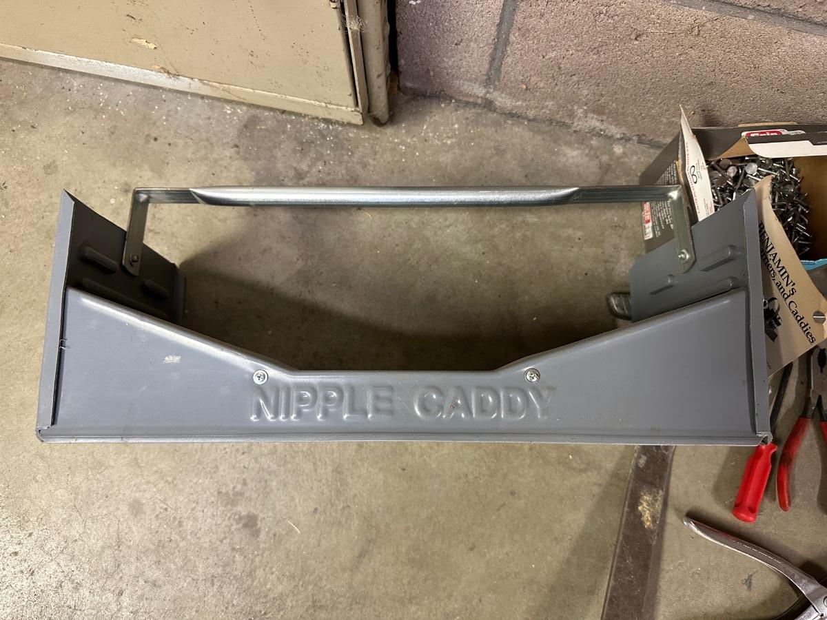 LARGE ASSORTMENT OF HAND TOOLS AND A NIPPLE CADDY
