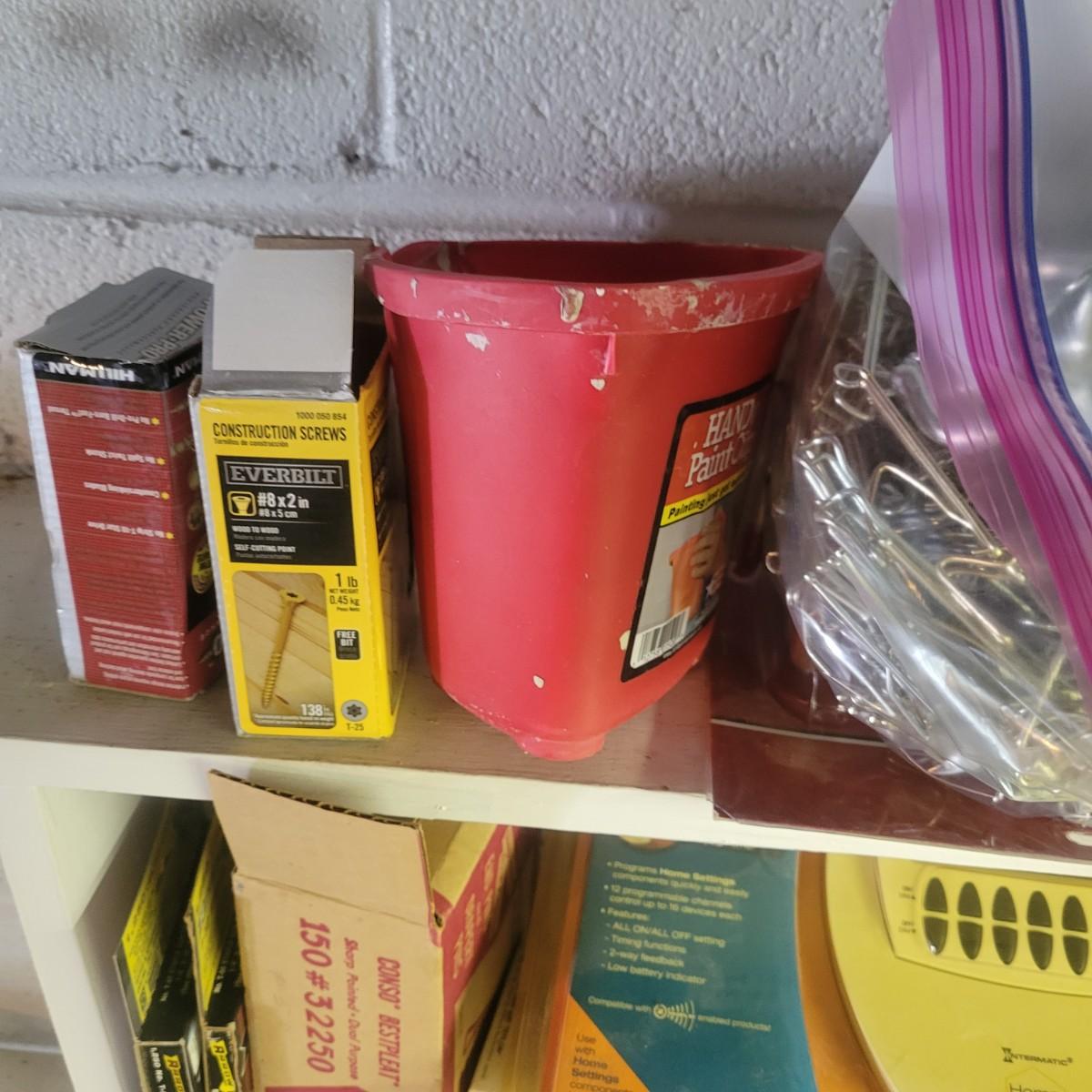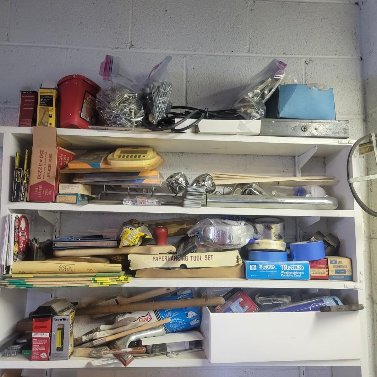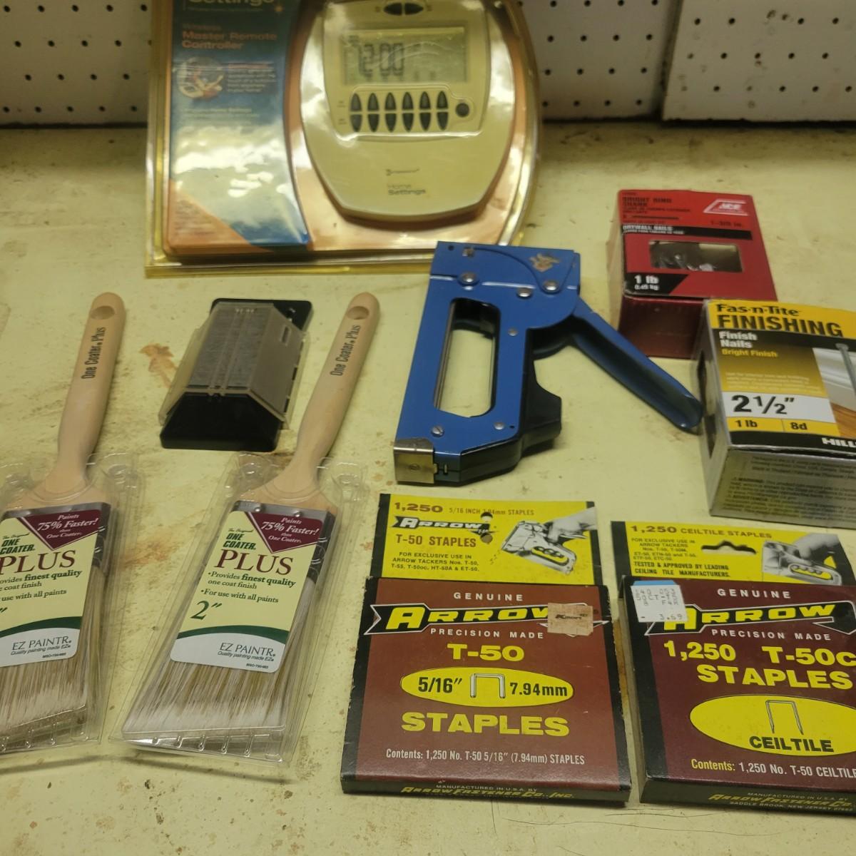 A large assortment of hardware. Lot includes paint brushes, nails, screws, sandpaper, staple gun, weather stripping and more. See attached pictures for full inventory. Local pickup only