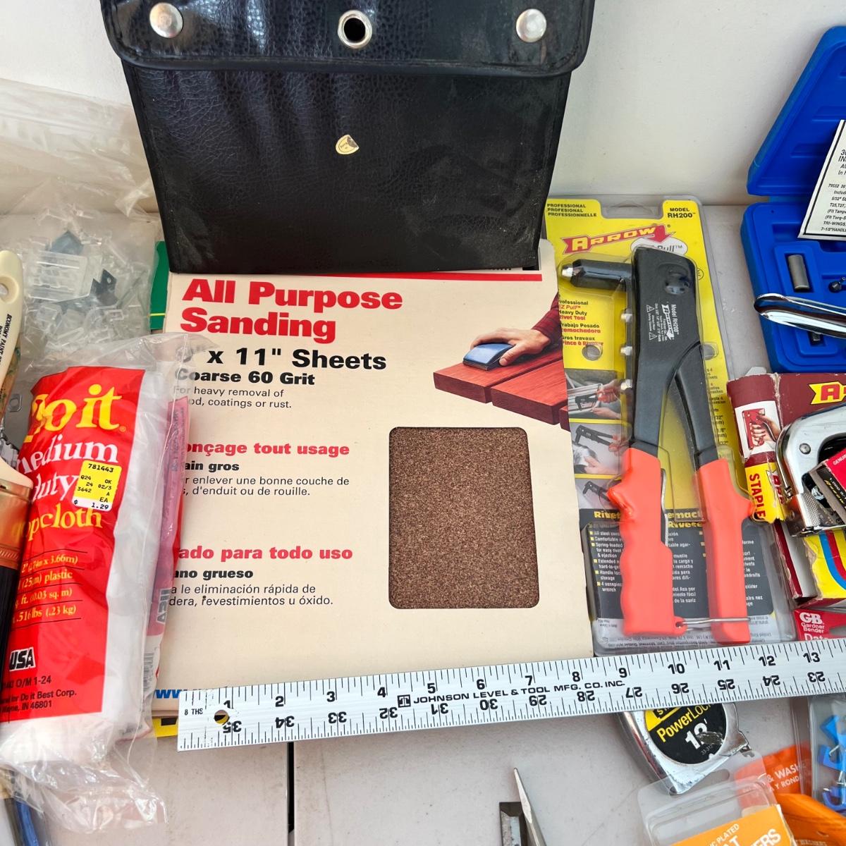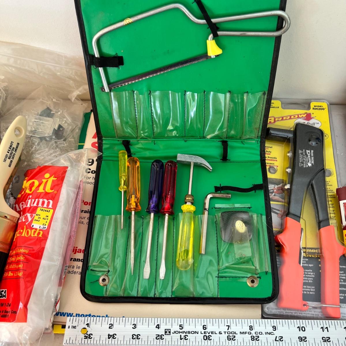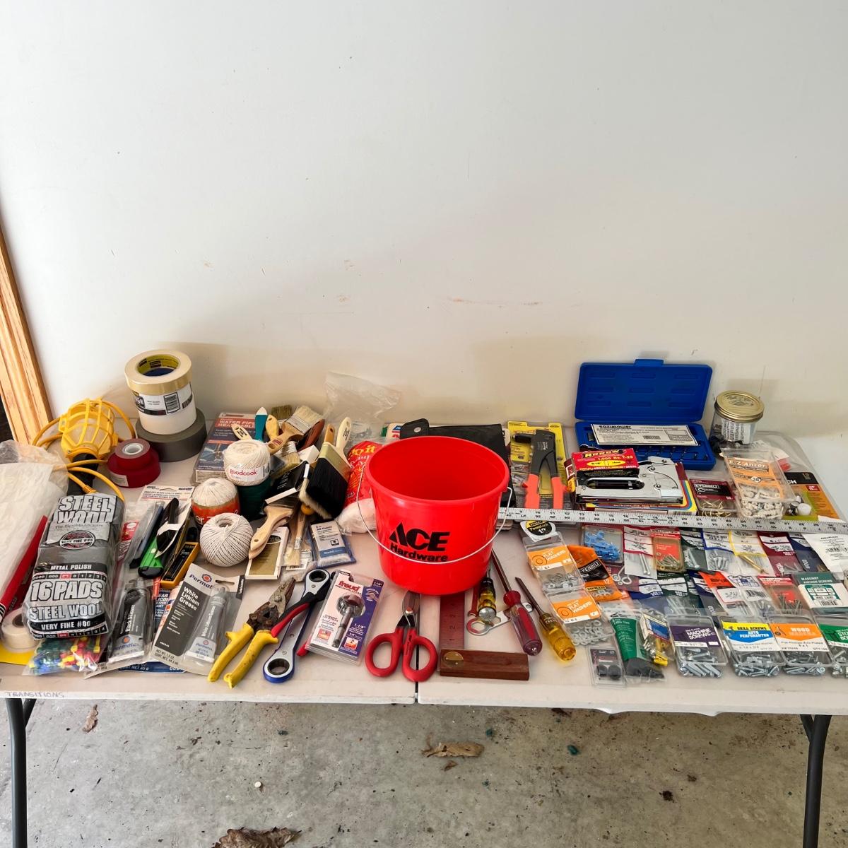 A very large assortment of miscellaneous must-have hardware items for around the house! Items range from yardsticks, washers, light, cable, ties, tape, sandpaper, paint brushes, and much more. Please see photographs for inventory. Please note that the main screwdriver is missing from the blue case and only the bits are present.