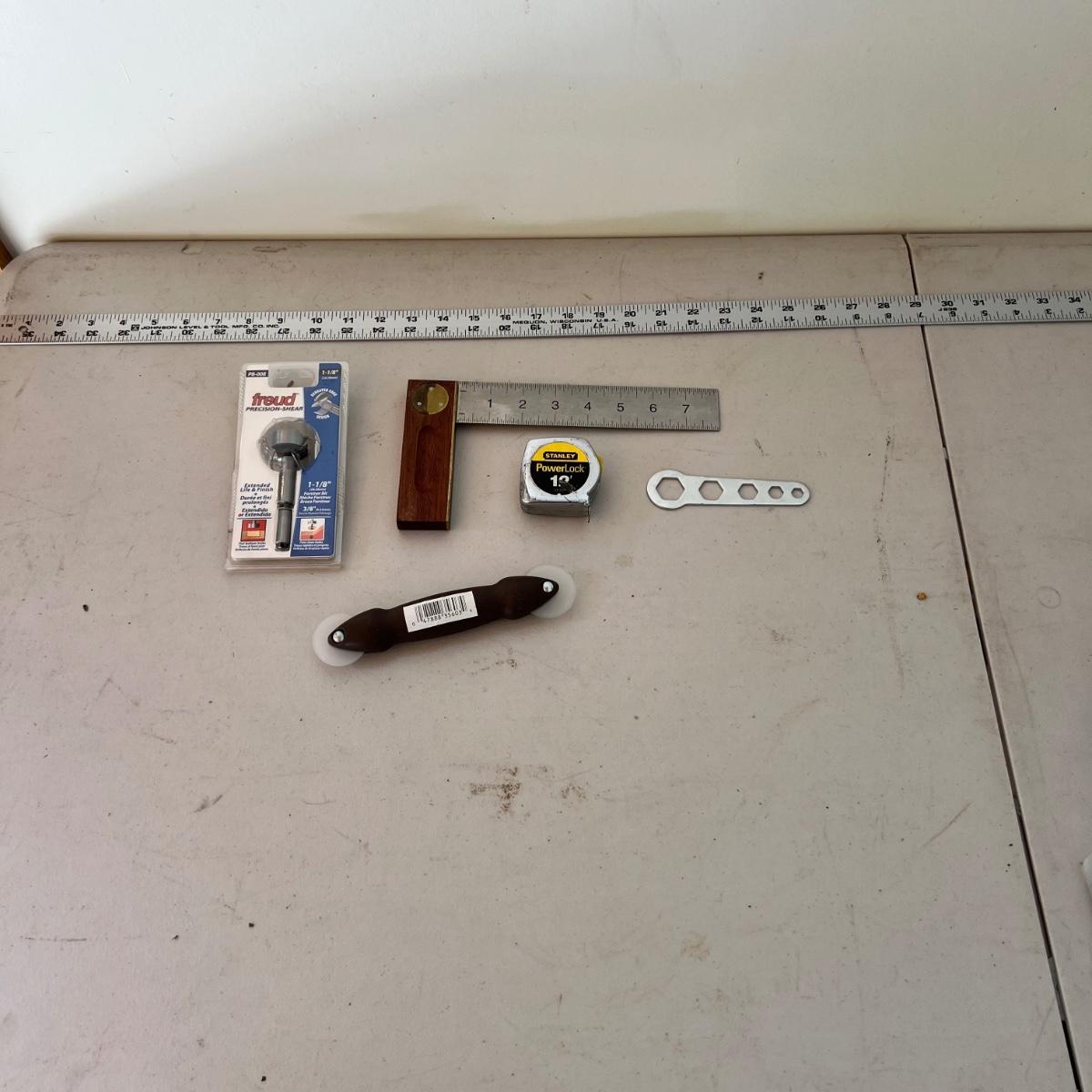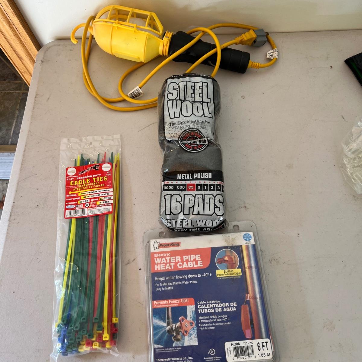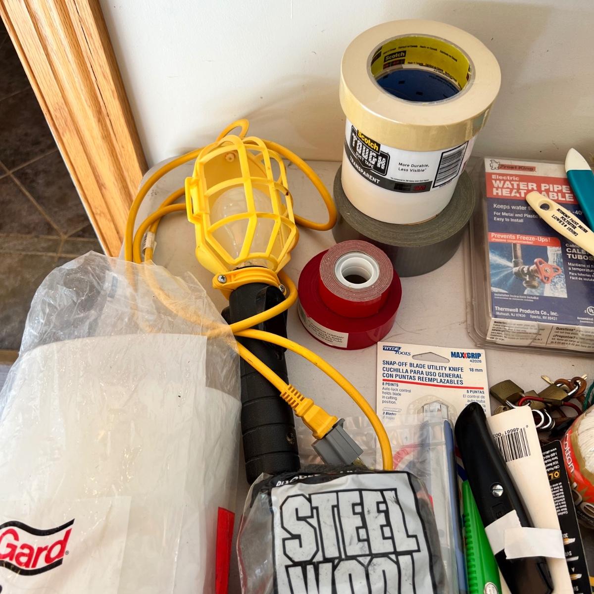 A very large assortment of miscellaneous must-have hardware items for around the house! Items range from yardsticks, washers, light, cable, ties, tape, sandpaper, paint brushes, and much more. Please see photographs for inventory. Please note that the main screwdriver is missing from the blue case and only the bits are present.