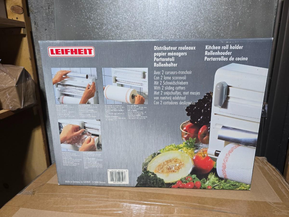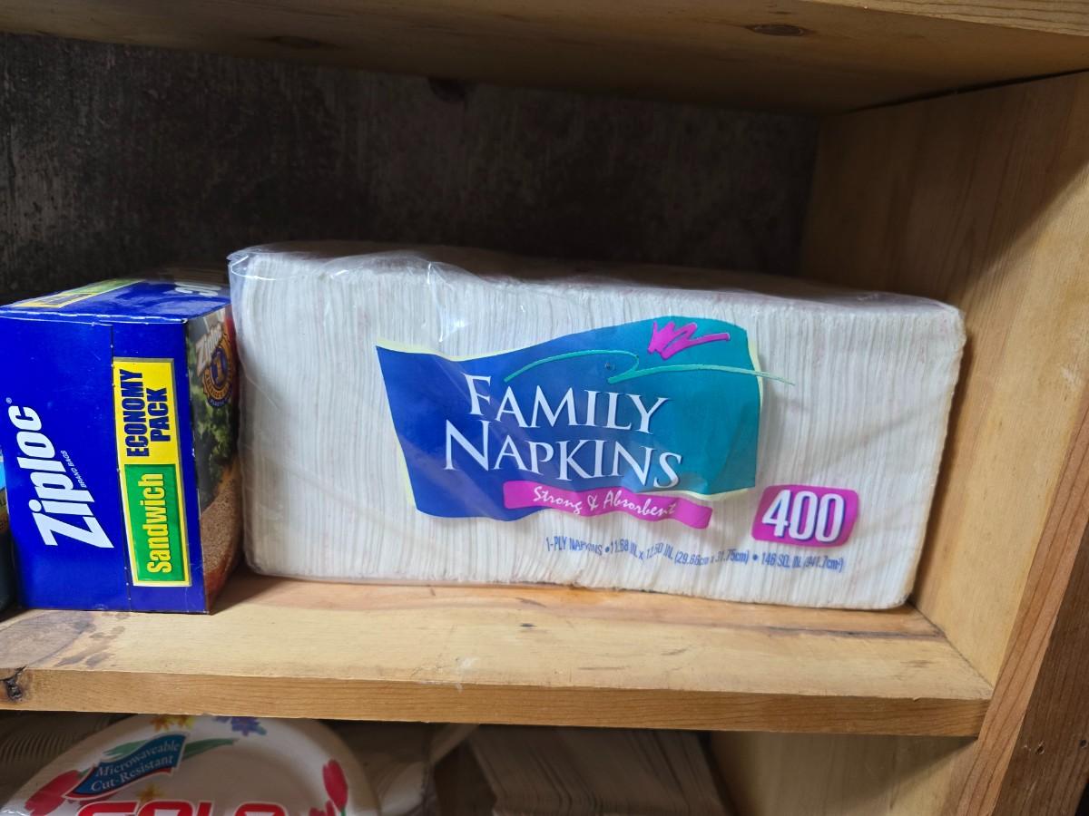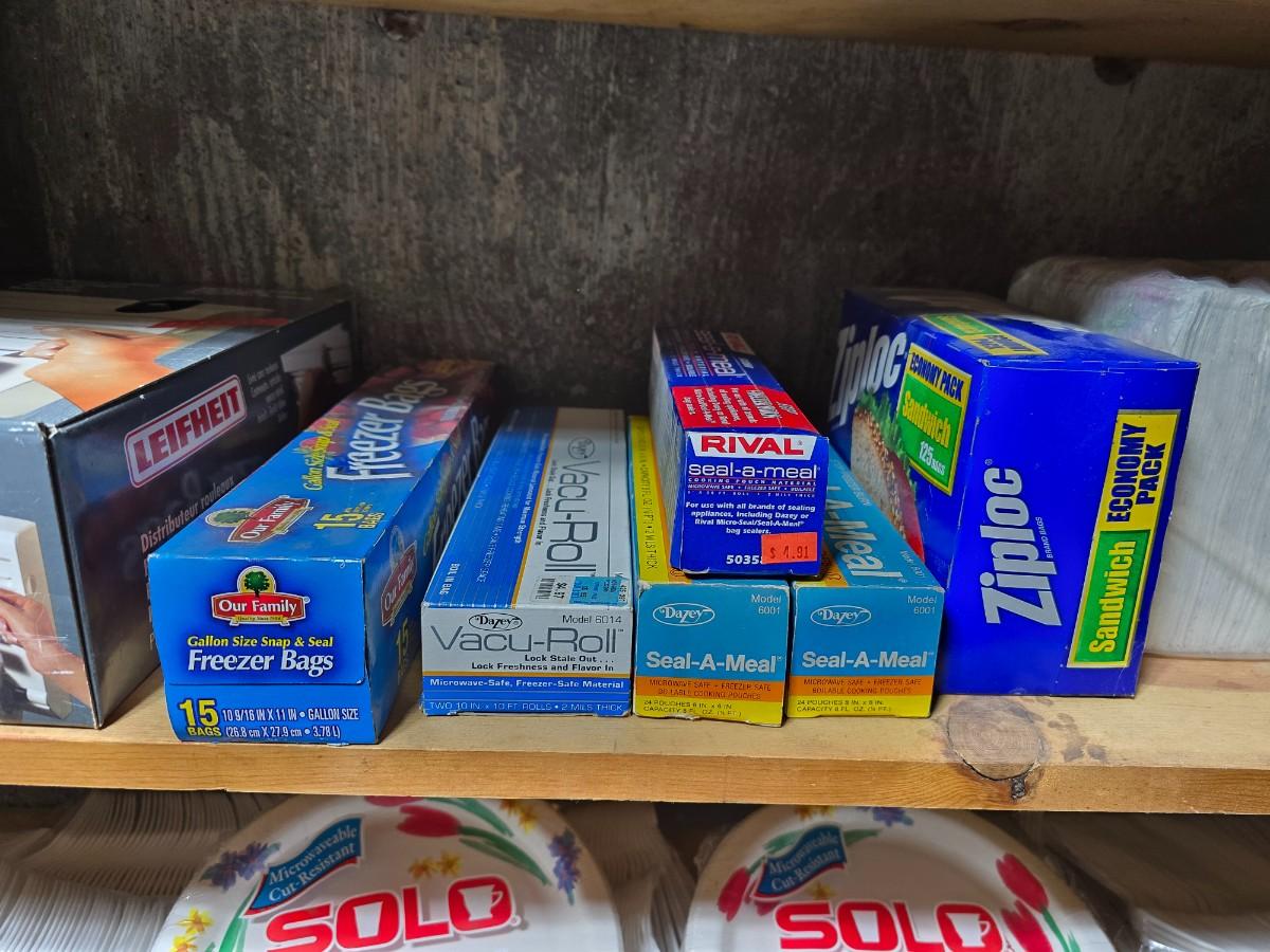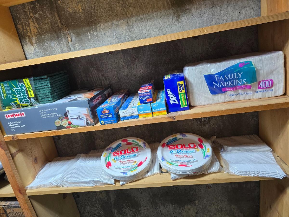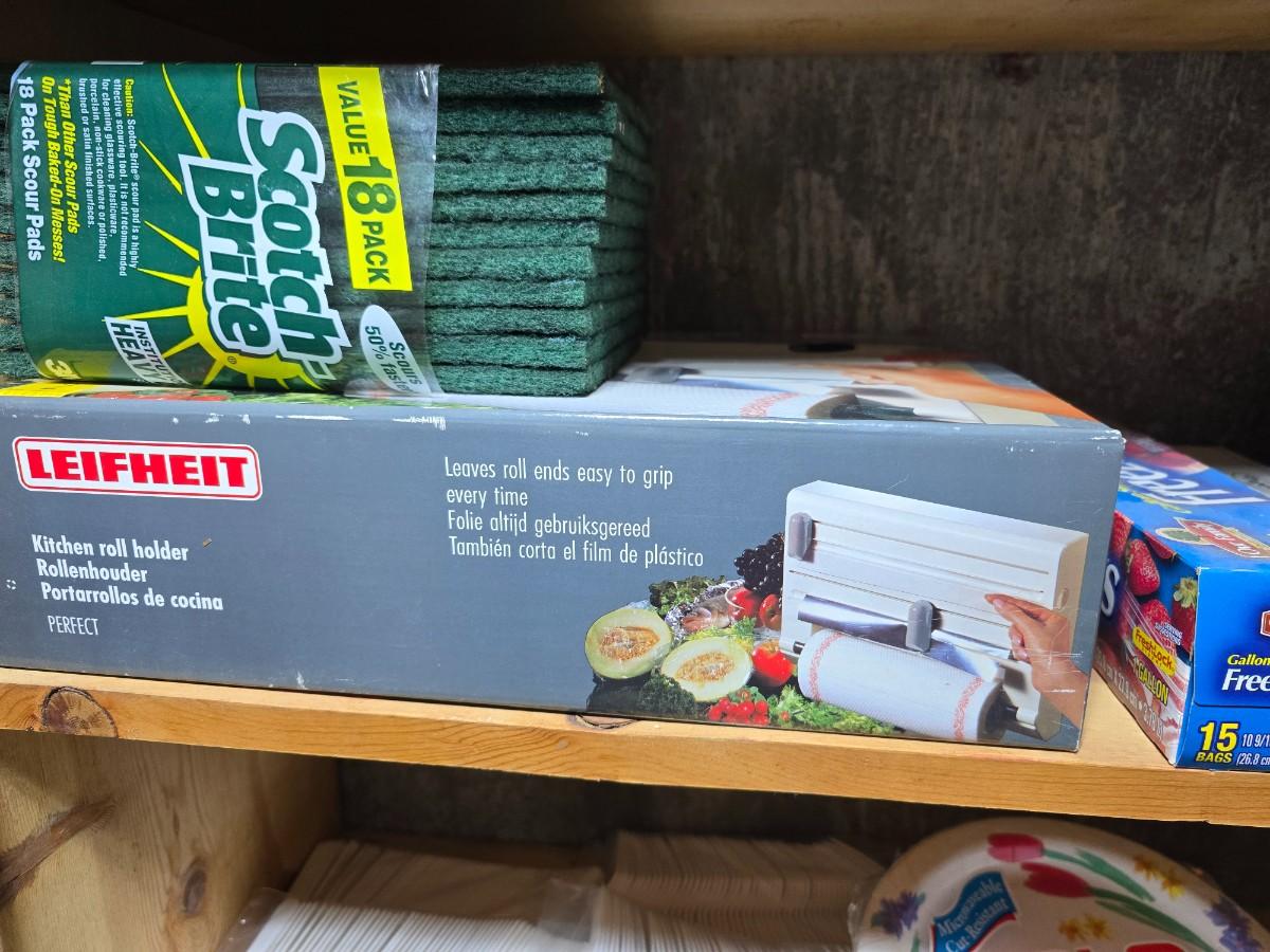 Large assortment of Kitchen must haves - bags - paper plates - plastic flatware and a Leifheit kitchen roll holder