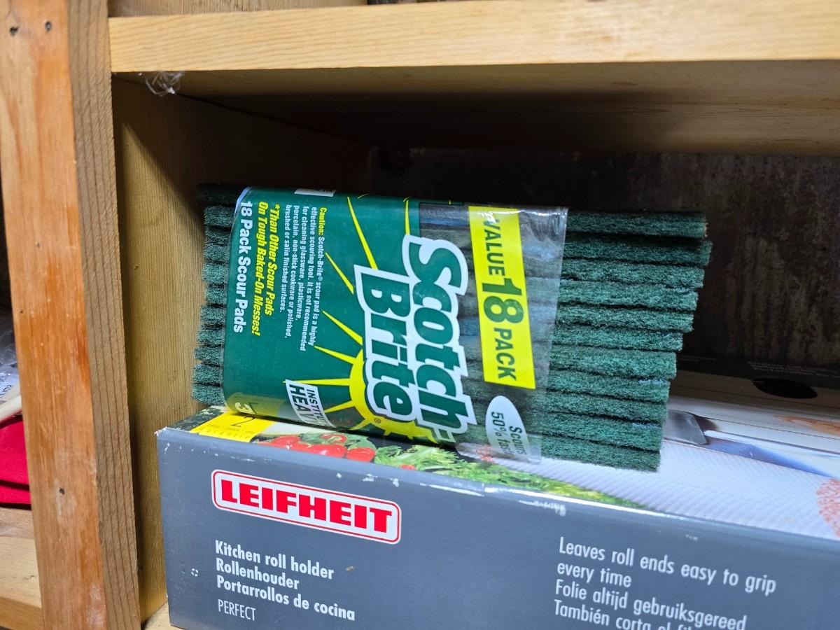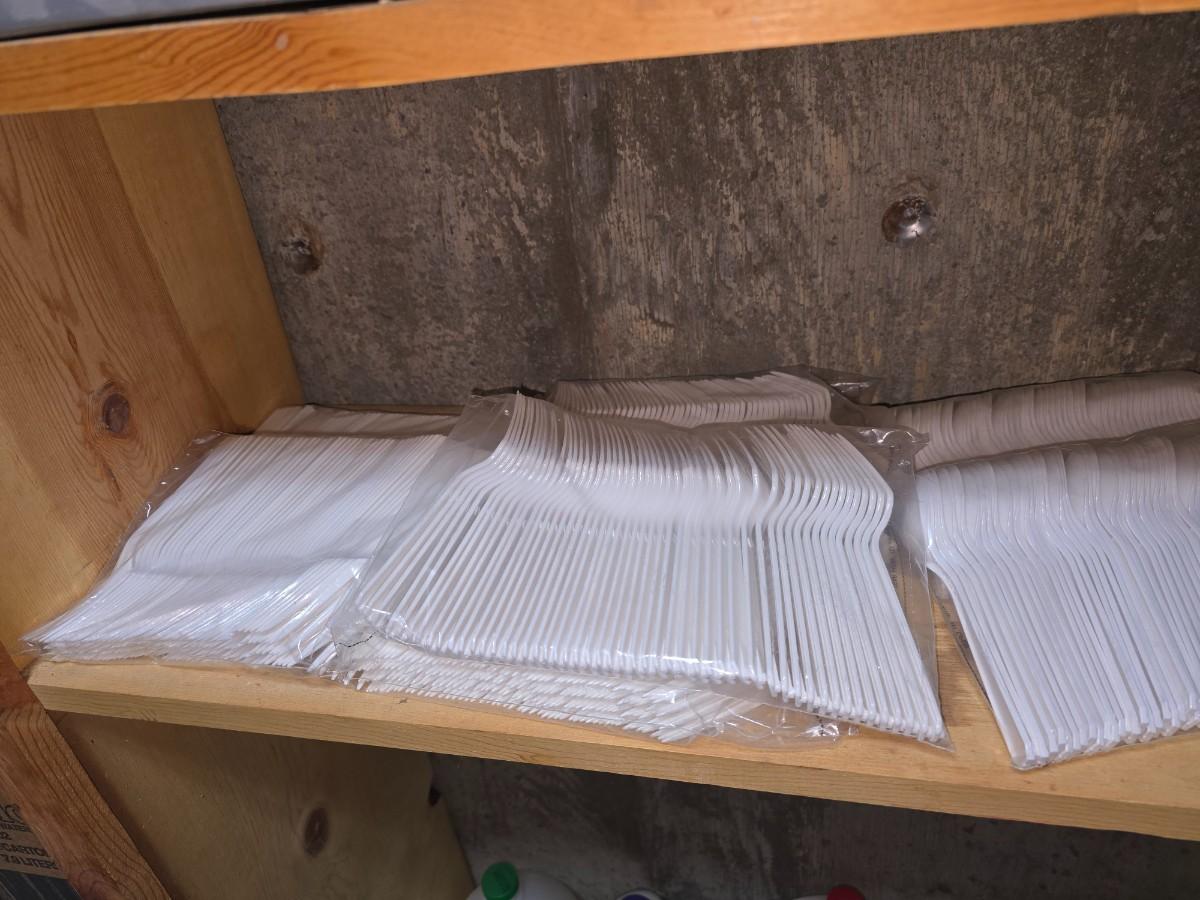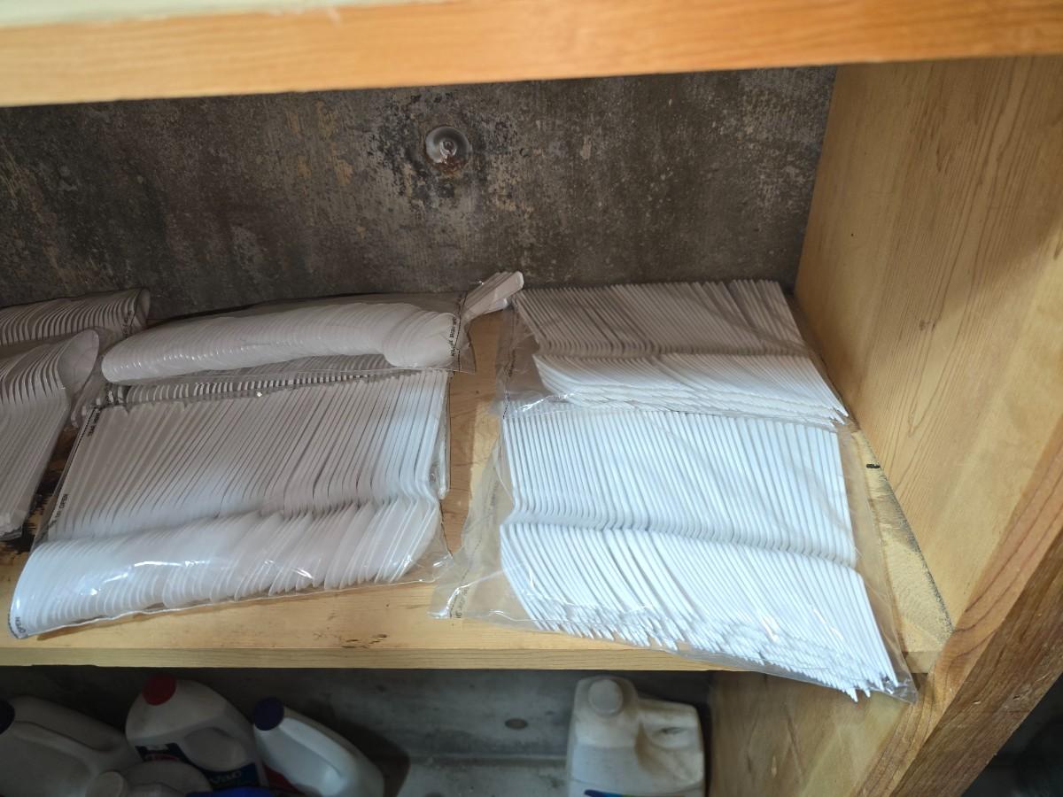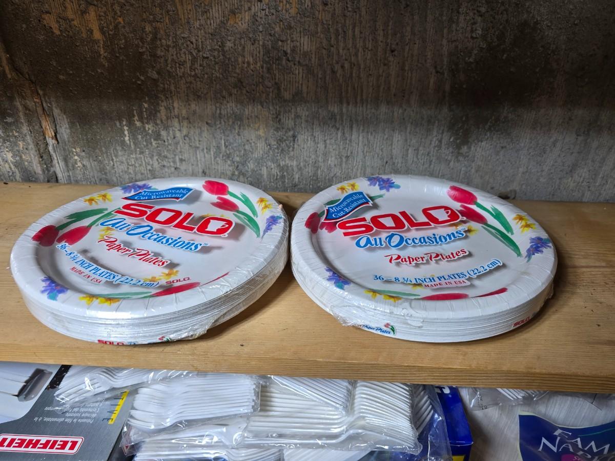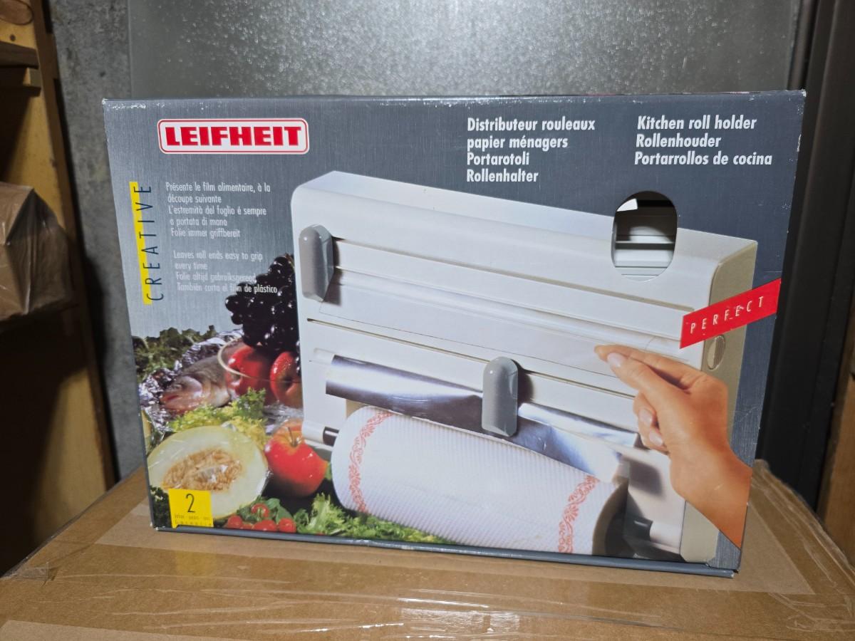 Large assortment of Kitchen must haves - bags - paper plates - plastic flatware and a Leifheit kitchen roll holder
