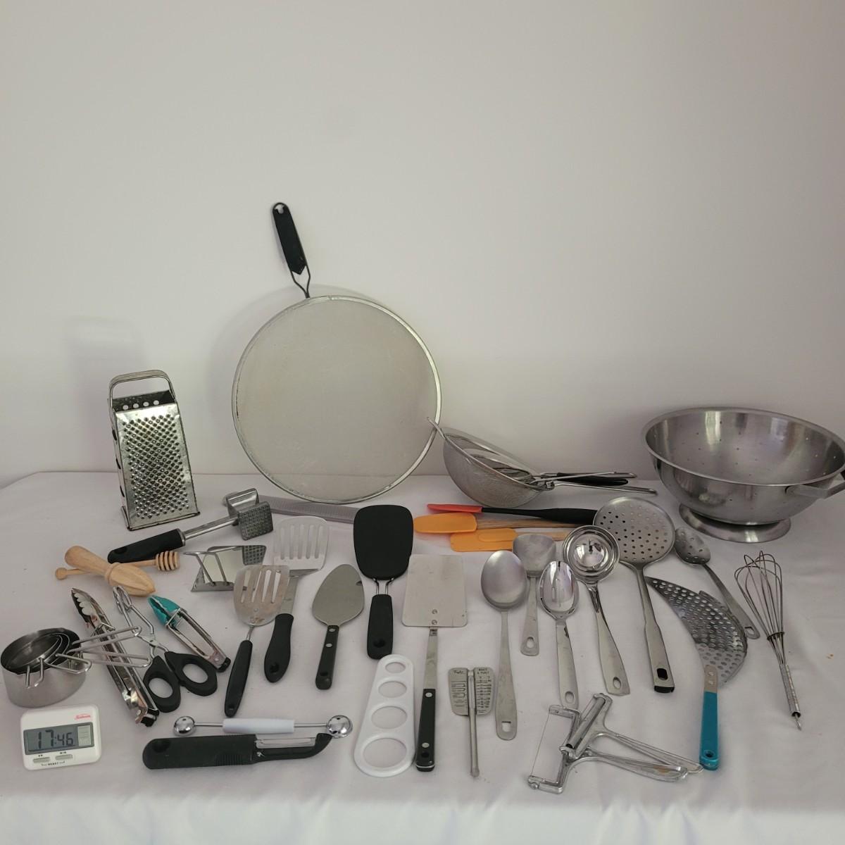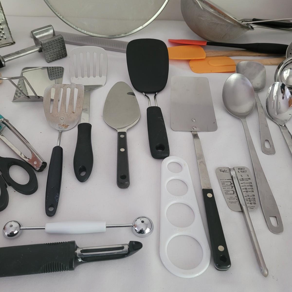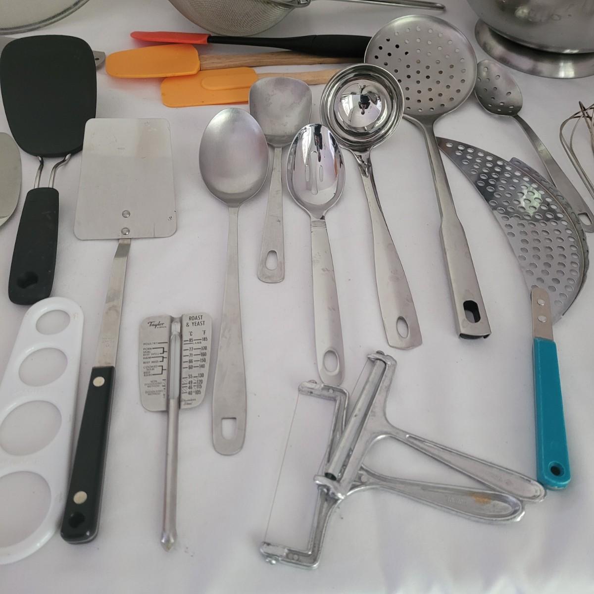 This large lot of kitchen items includes strainers, serving spoons, spatulas, tongs, peelers and much more. Shipping available.