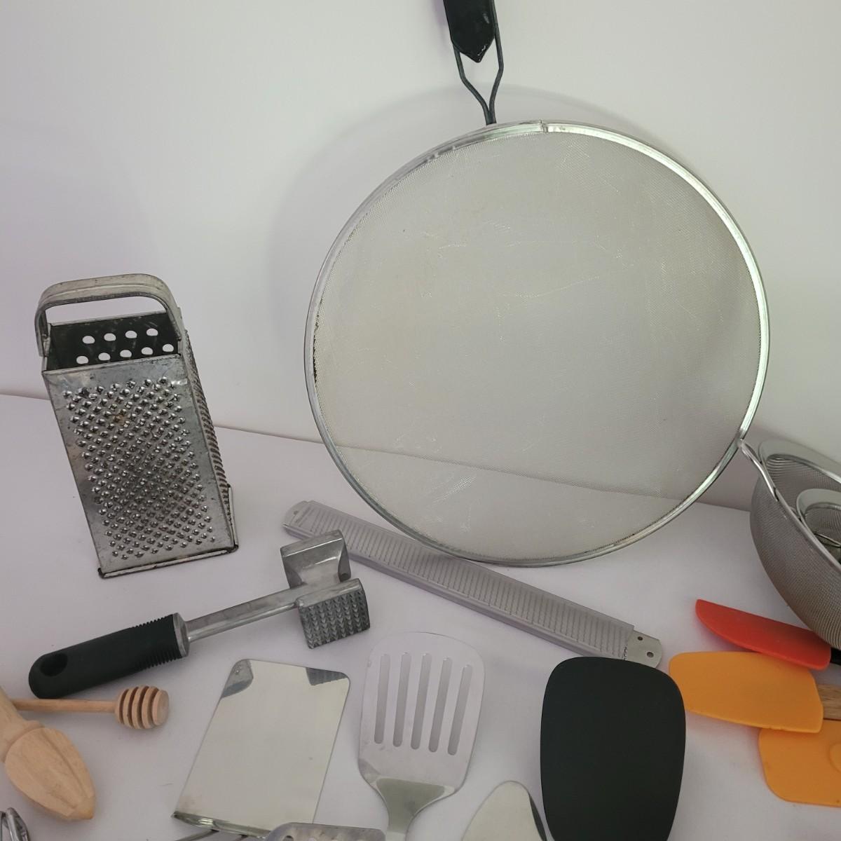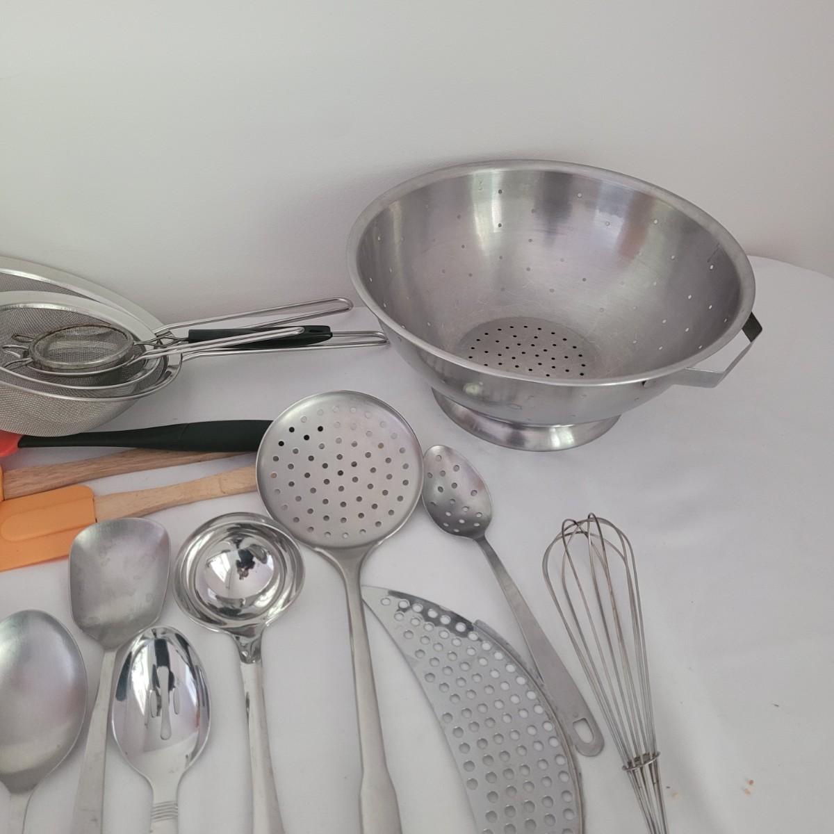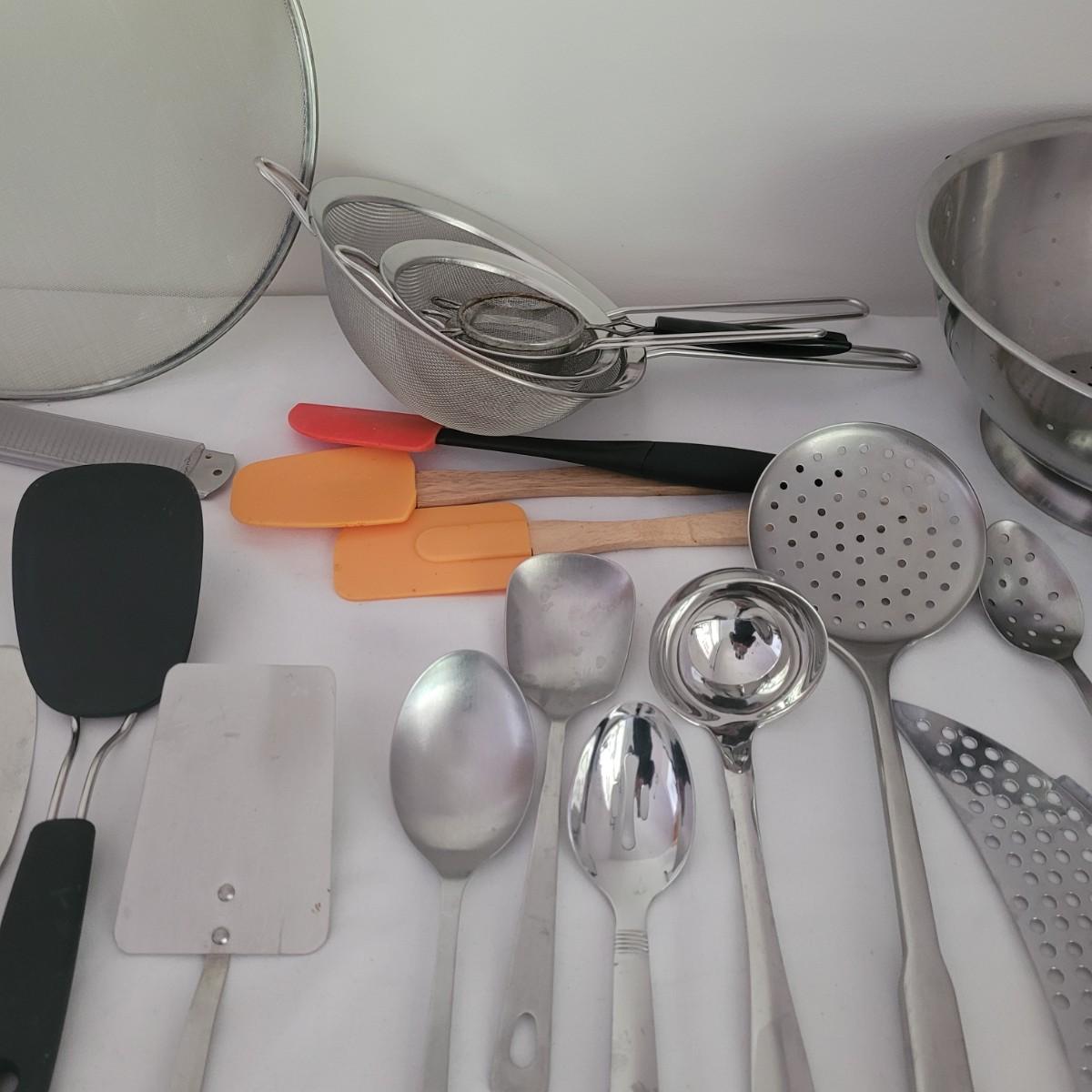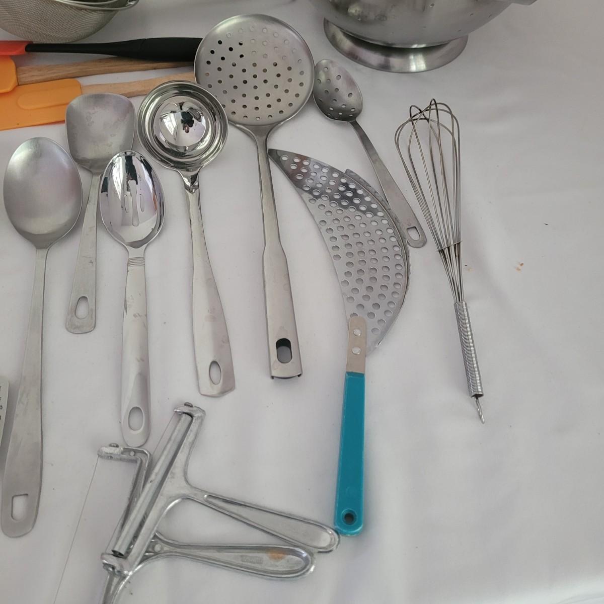 This large lot of kitchen items includes strainers, serving spoons, spatulas, tongs, peelers and much more. Shipping available.