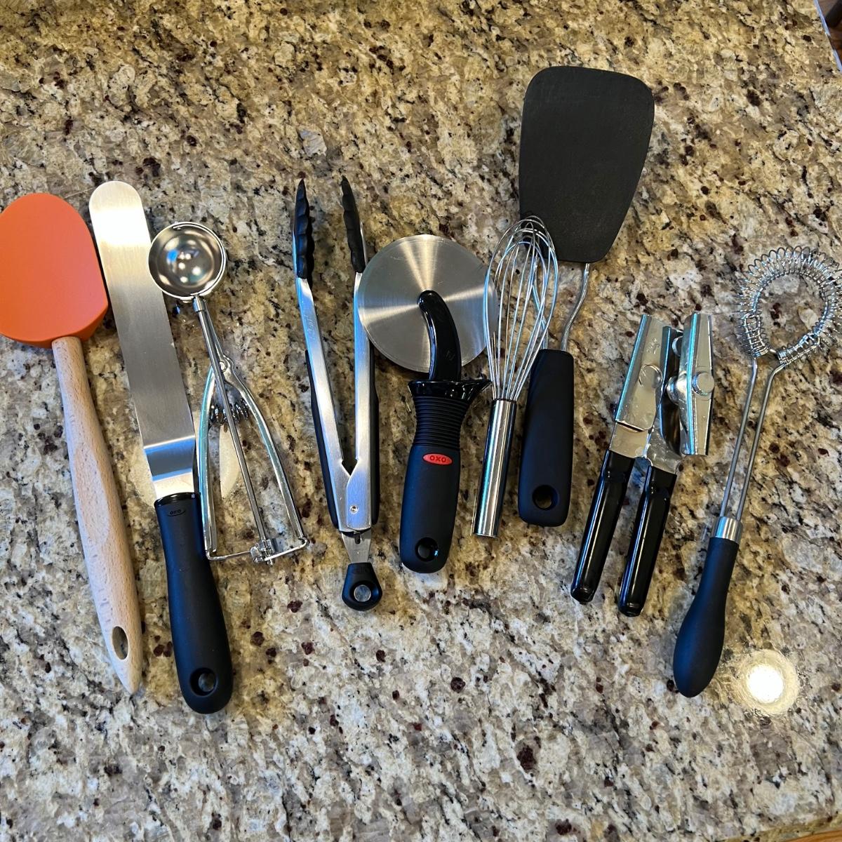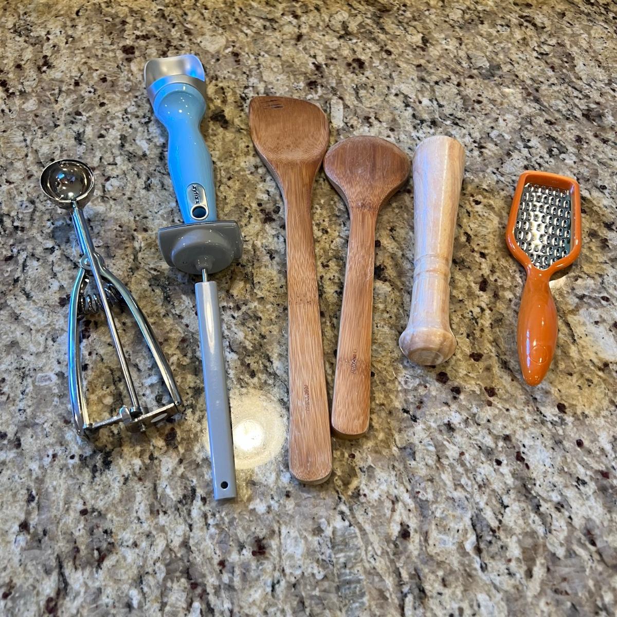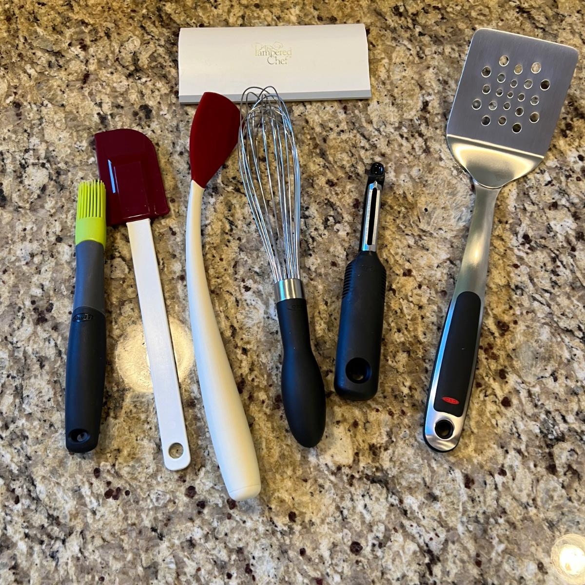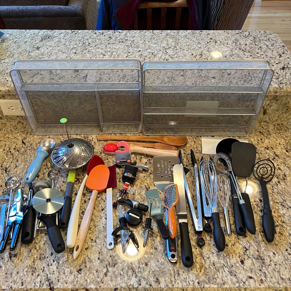 A large assortment of kitchen tools includes two whisks, tongs, spatulas, basting brush, wine stopper, wooden spoons, pizza cutter, ladle and spatula and more. See photographs for a full inventory. Lot also includes two metal drawer organizing trays each measuring 11” x 16” x 2”H.