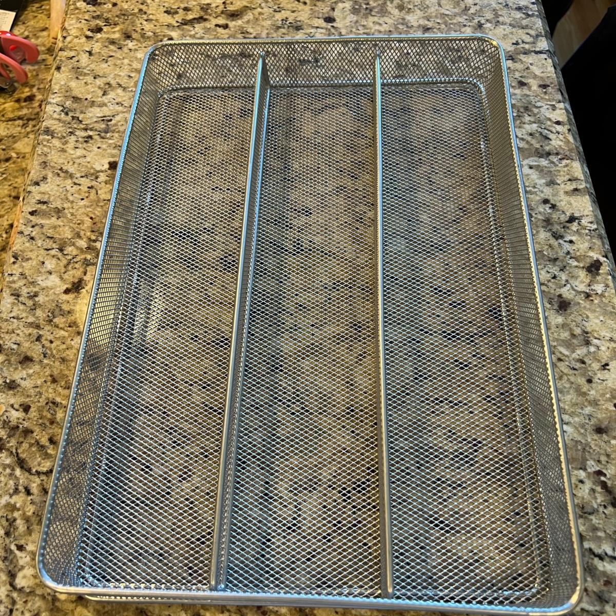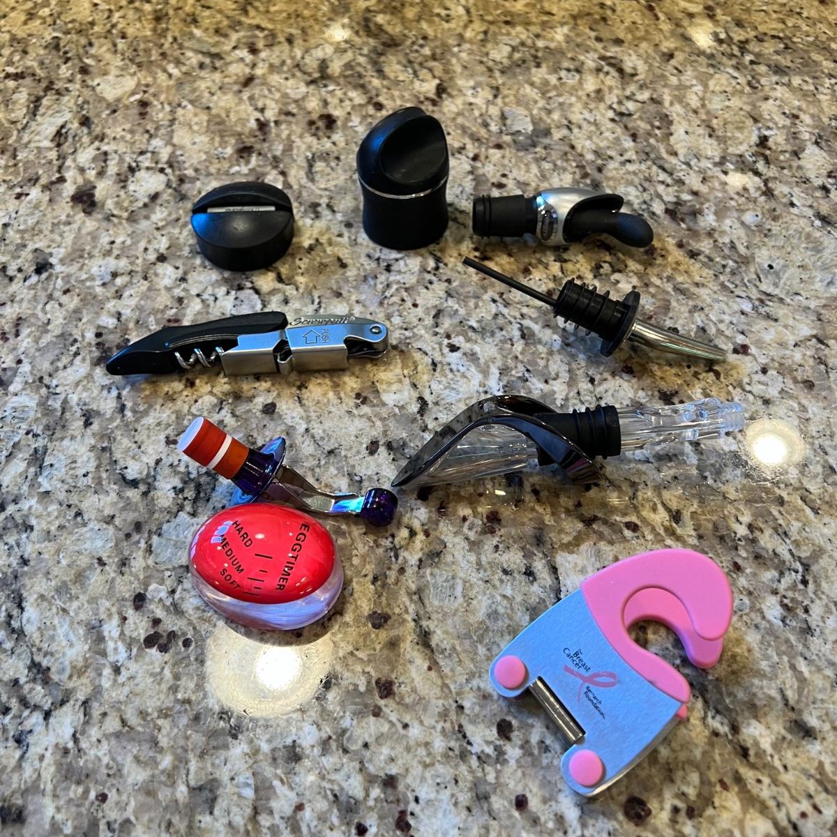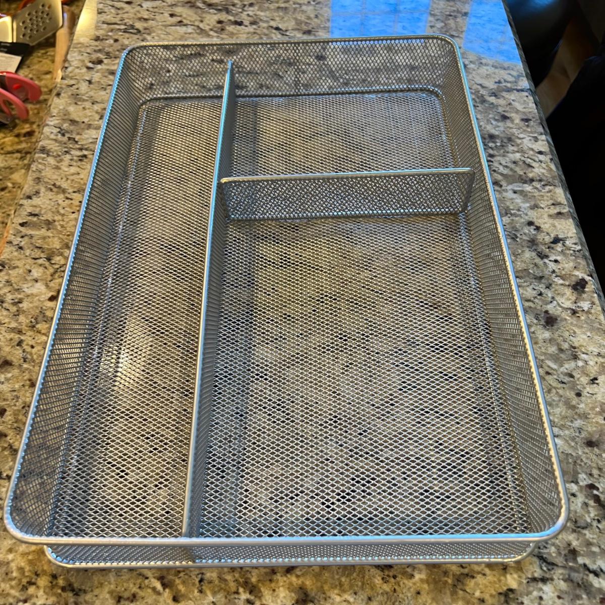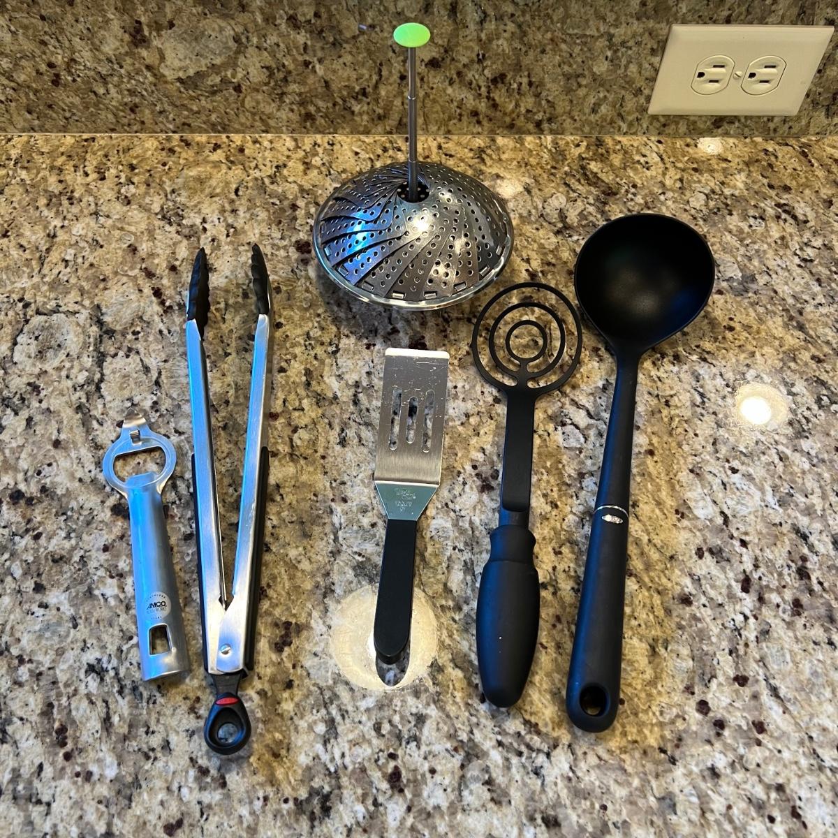 A large assortment of kitchen tools includes two whisks, tongs, spatulas, basting brush, wine stopper, wooden spoons, pizza cutter, ladle and spatula and more. See photographs for a full inventory. Lot also includes two metal drawer organizing trays each measuring 11” x 16” x 2”H.