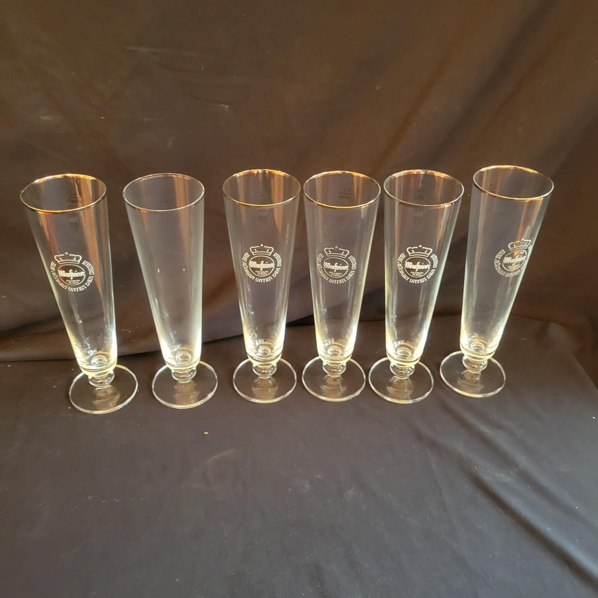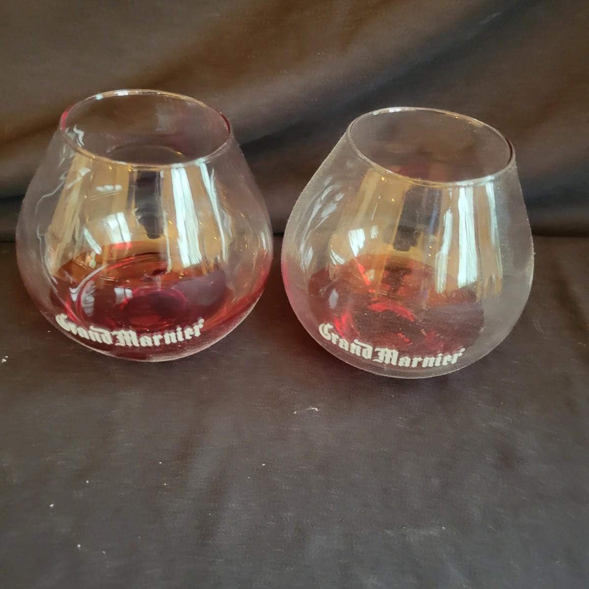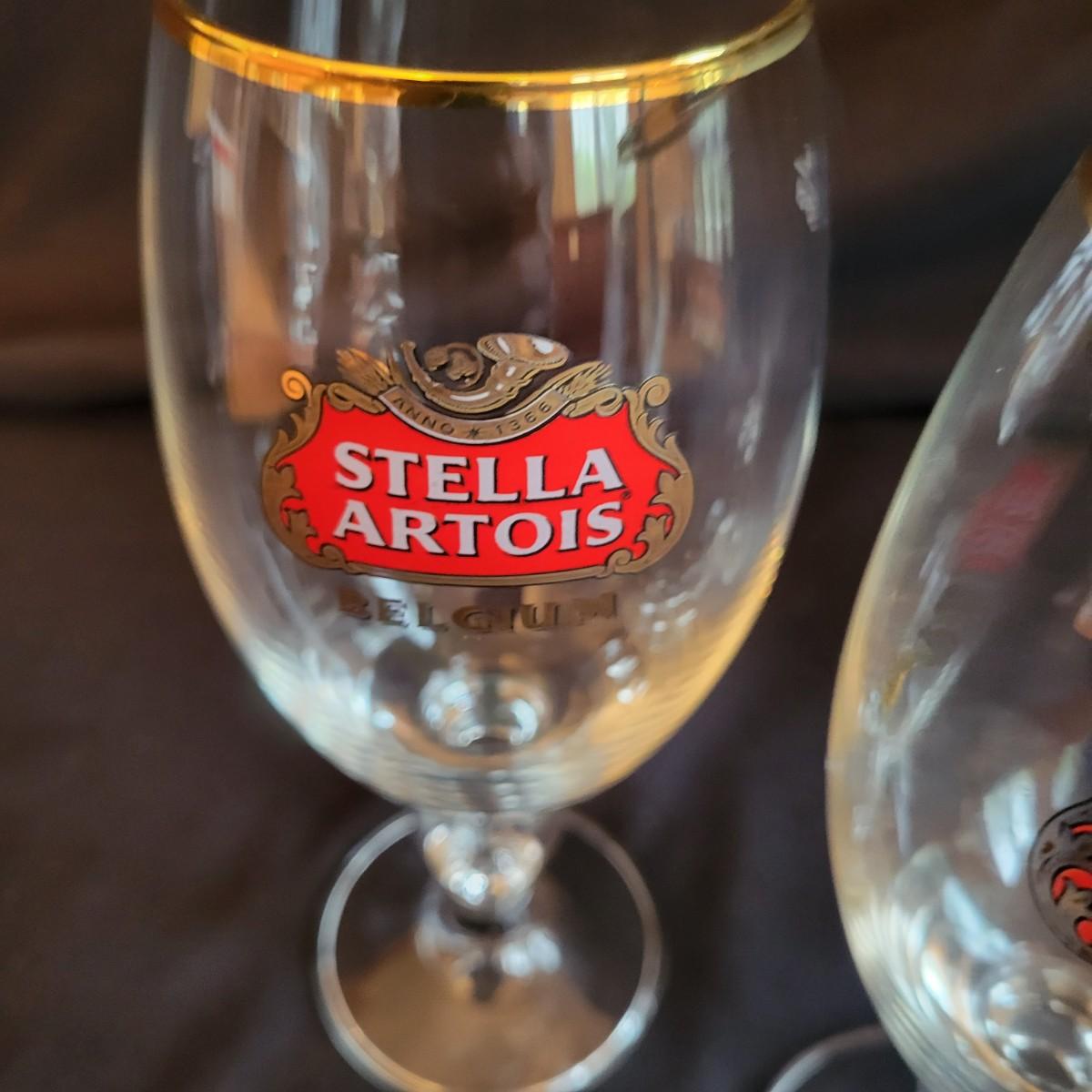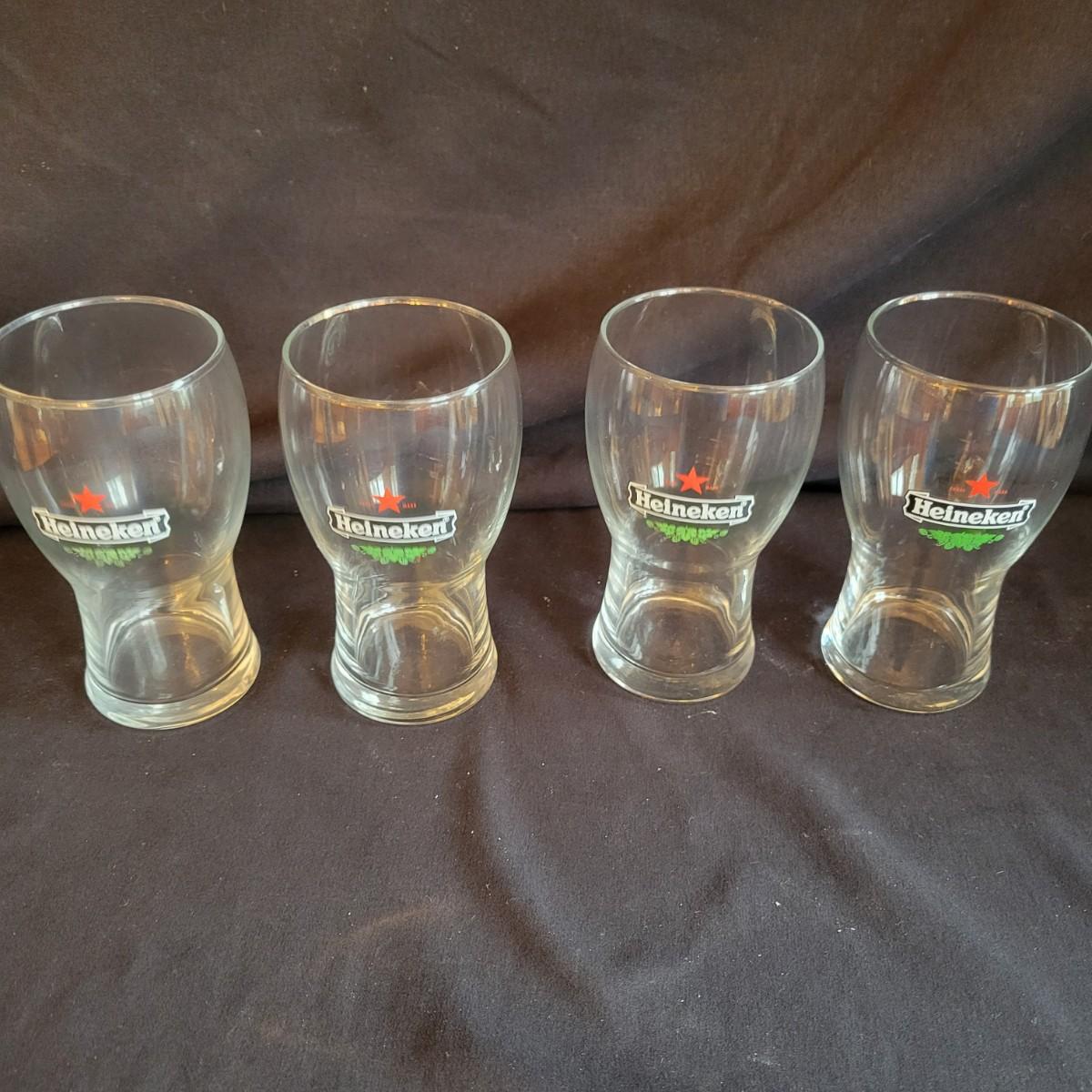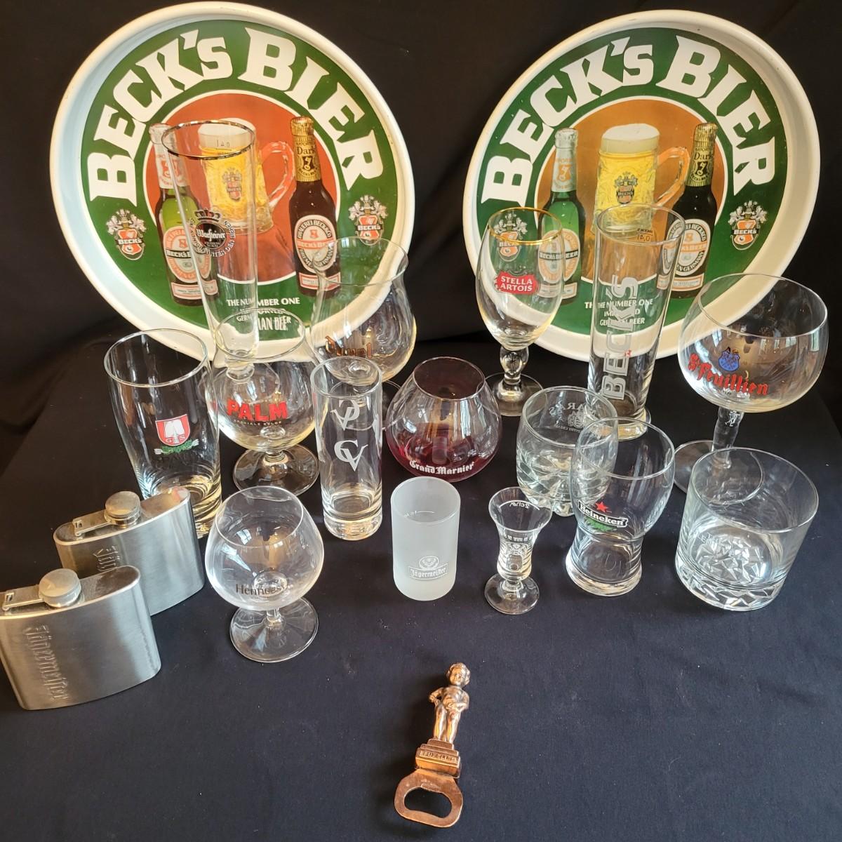 A large assortment of labeled bar glasses in a variety of shapes and volumes. Glass labeled with producers such as Hennessy, Stella Artois, Grand Marnier, Becks and more. The largest glass are approximately 10.25"H. Local pickup only.
