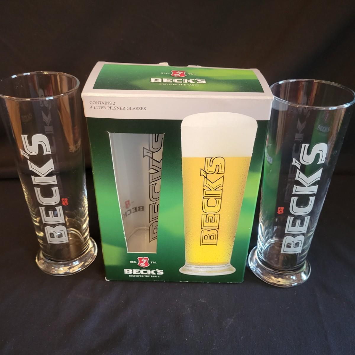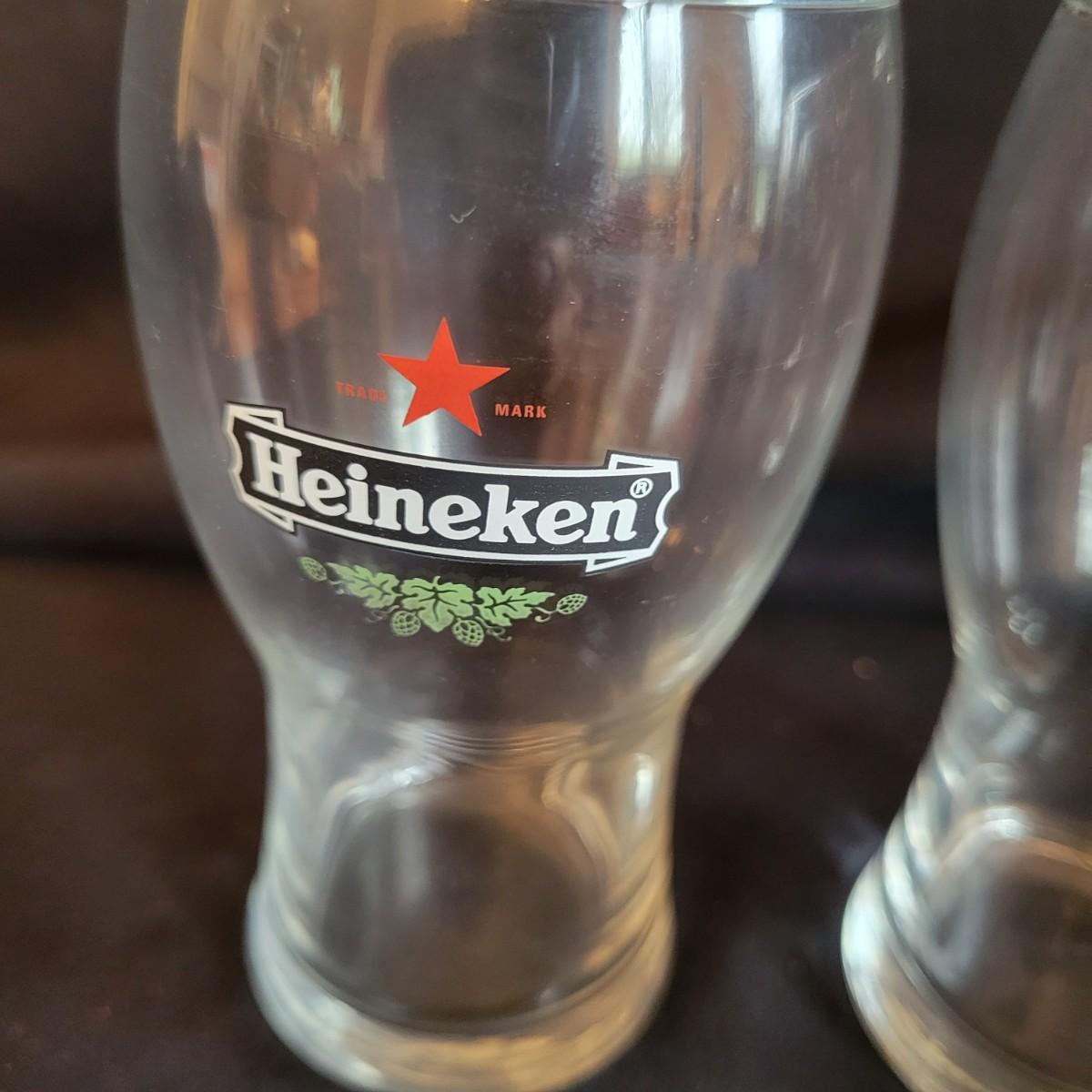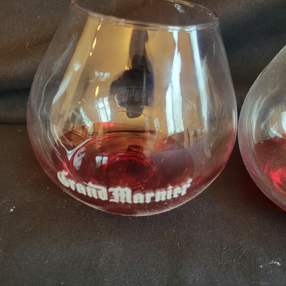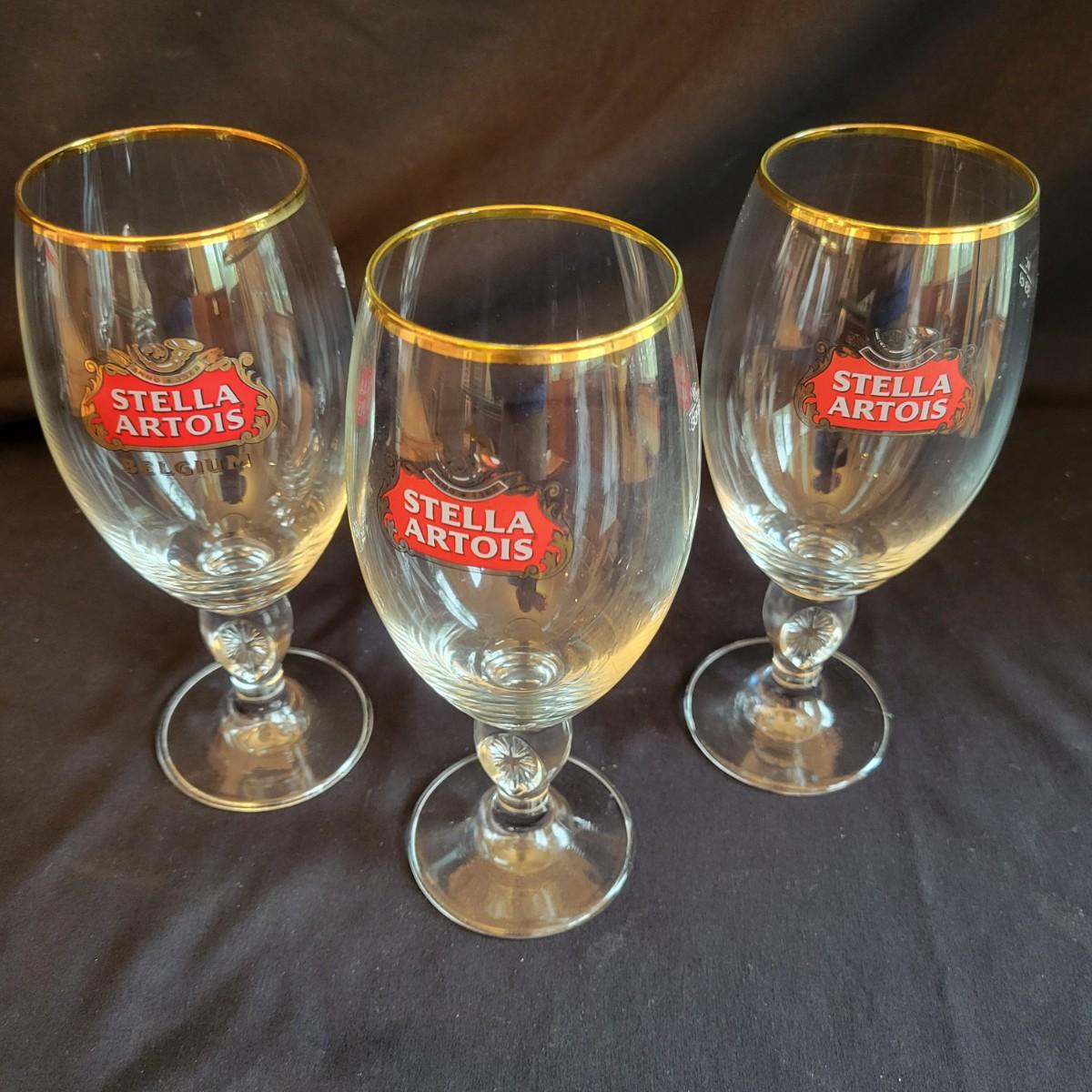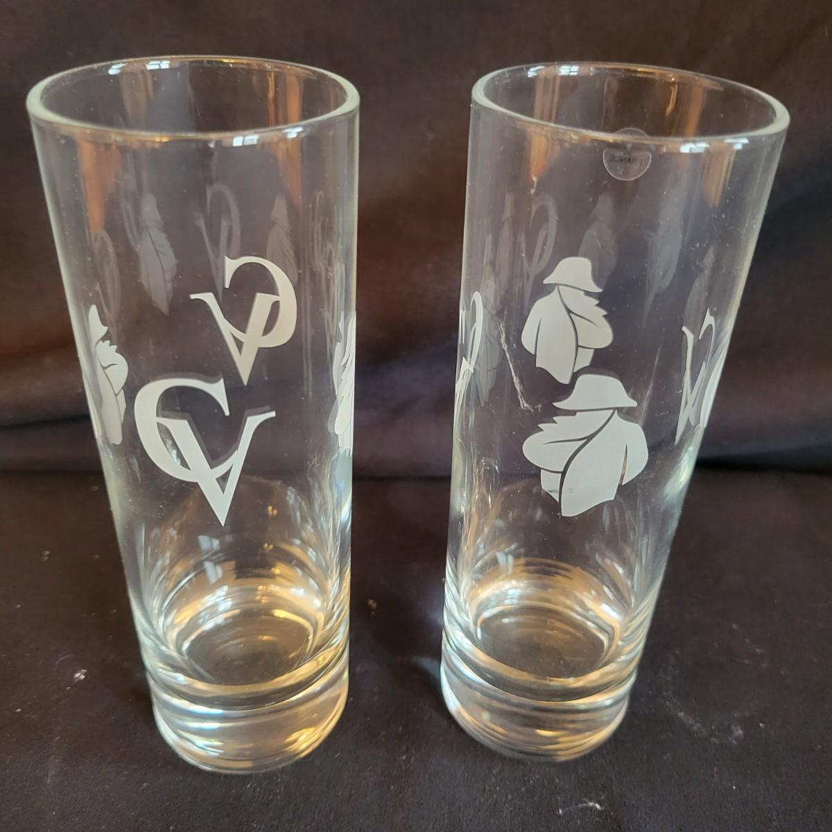 A large assortment of labeled bar glasses in a variety of shapes and volumes. Glass labeled with producers such as Hennessy, Stella Artois, Grand Marnier, Becks and more. The largest glass are approximately 10.25"H. Local pickup only.
