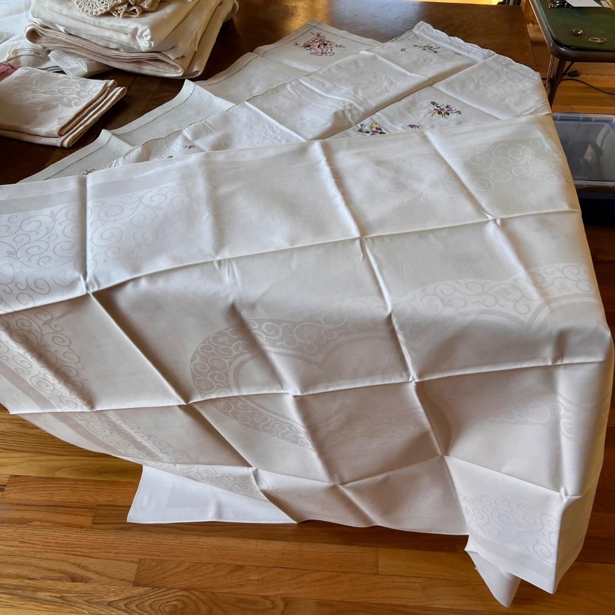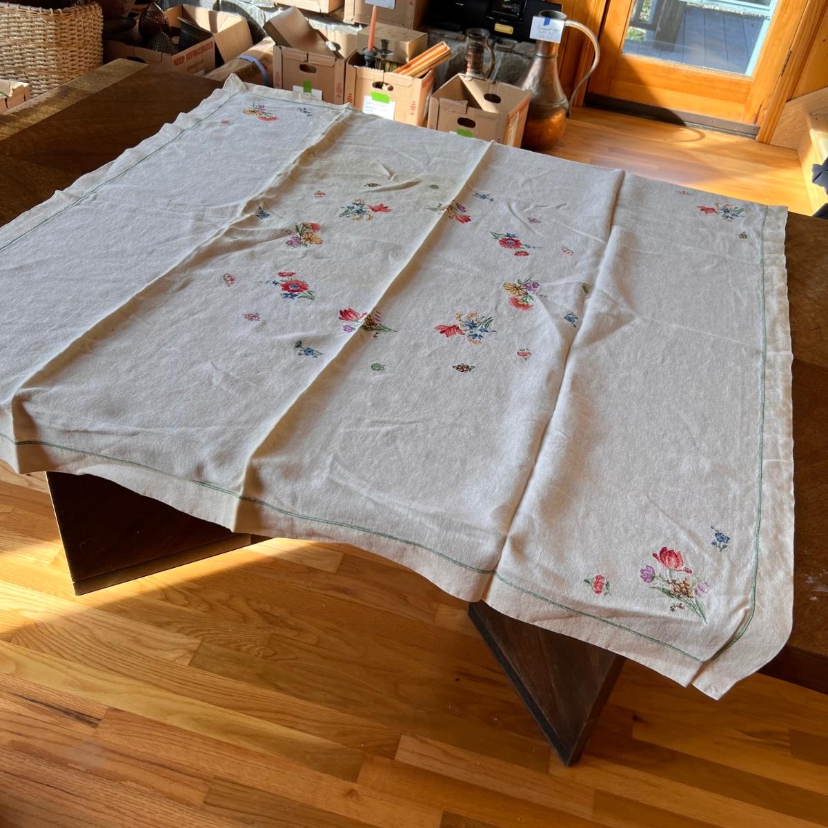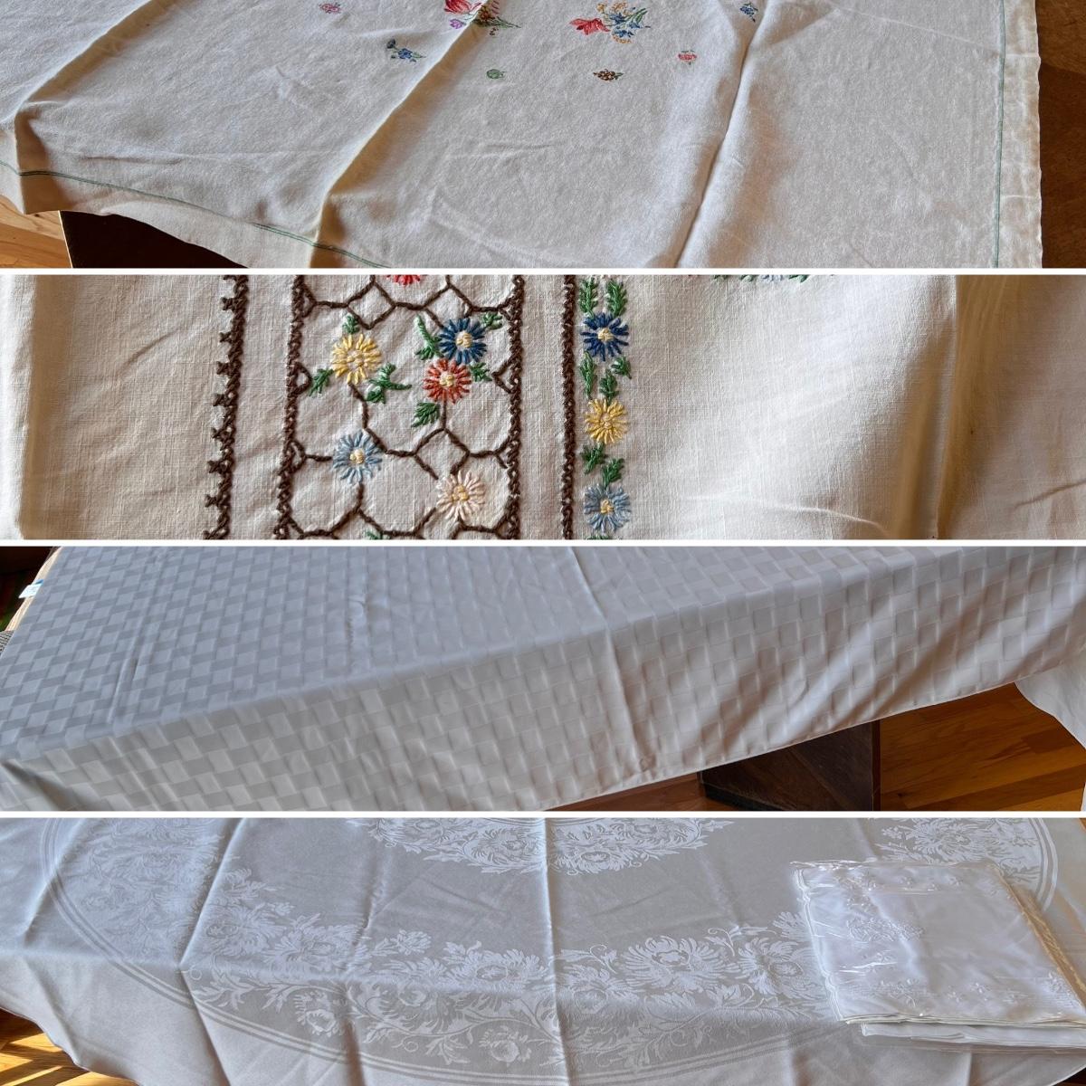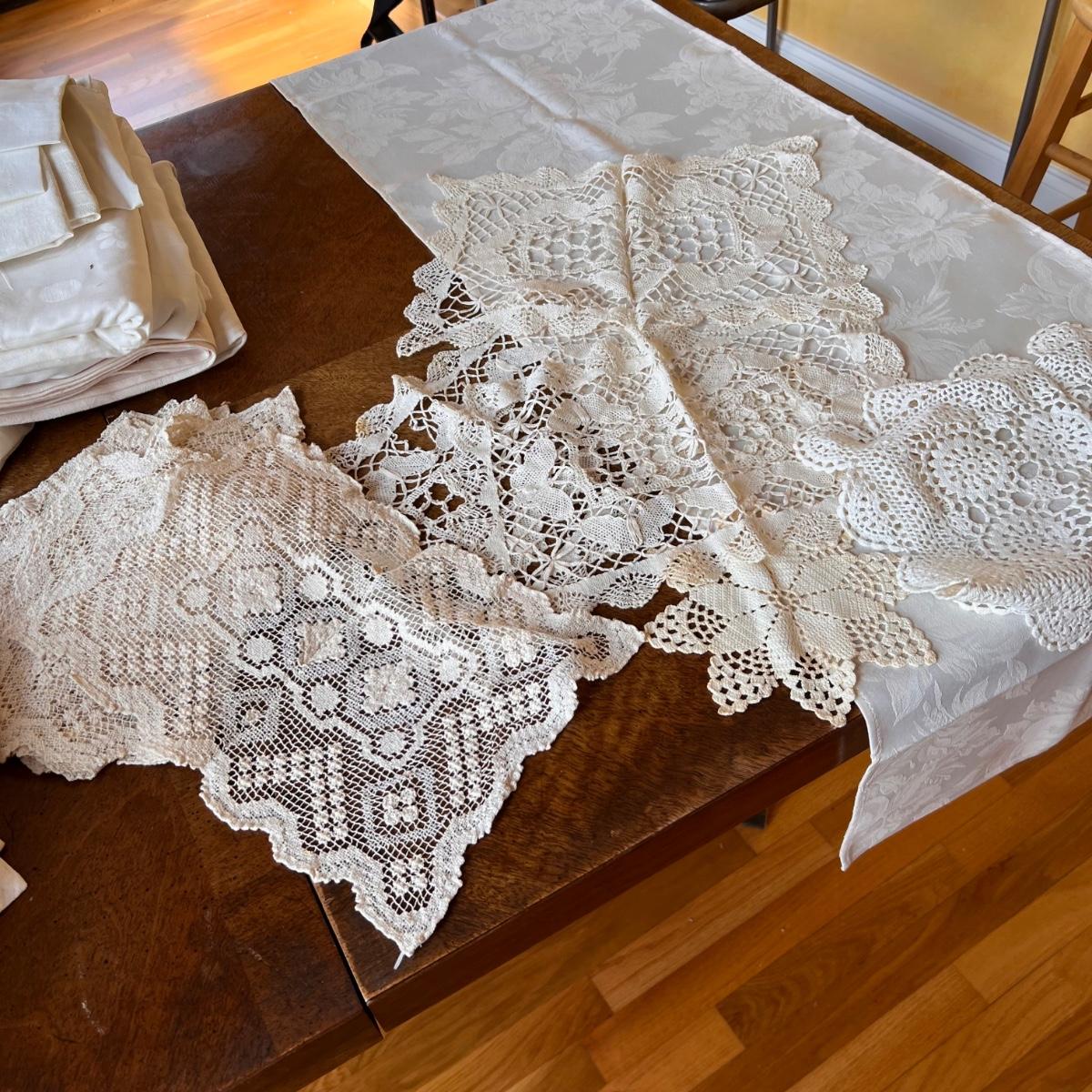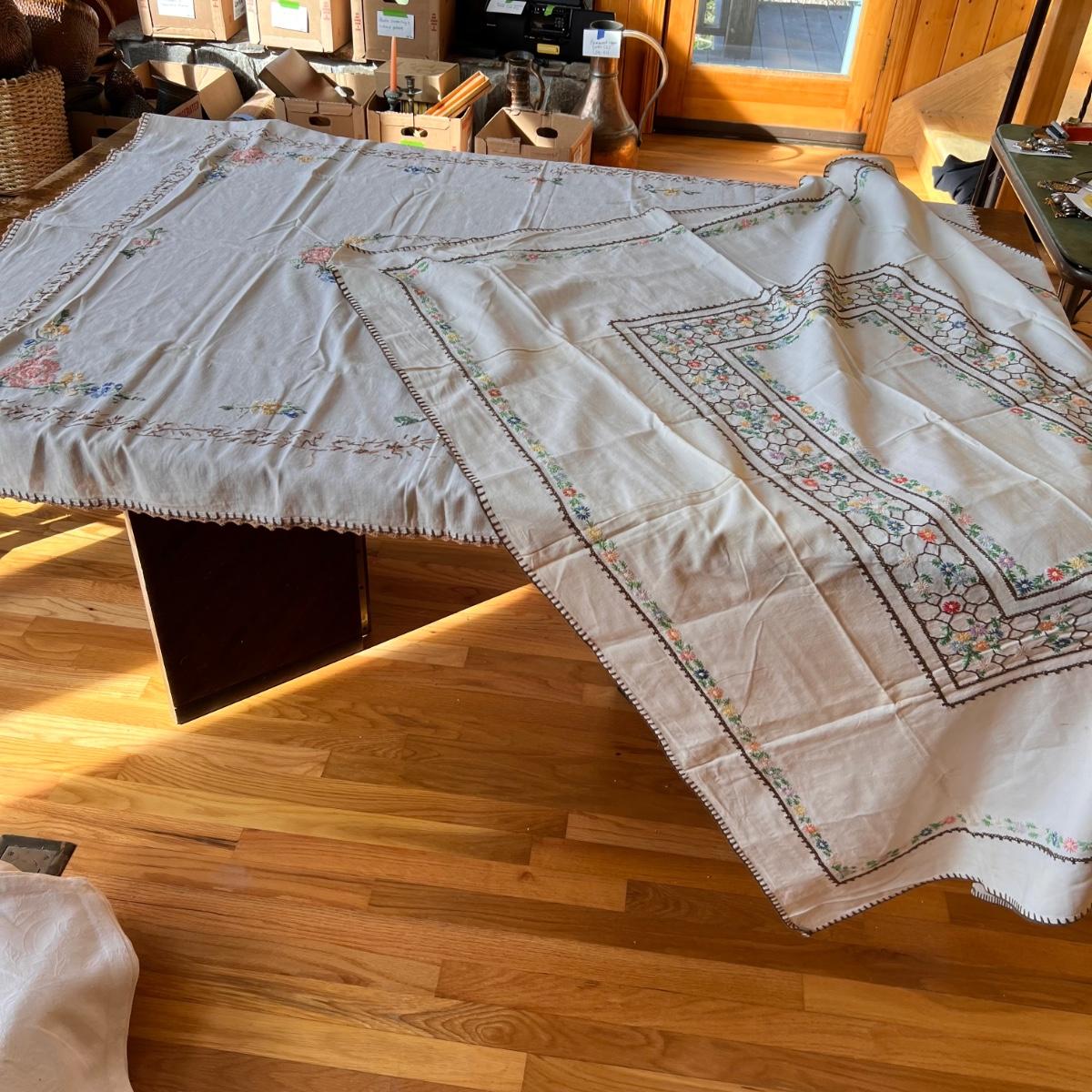Approximately 15 tablecloths, mostly linen and includes some that are embroidered. Lot also includes lace doilies and napkins. A fair number of light stains on items, see images. Tablecloths were photographed on a 40” x 62” x 29”H table.