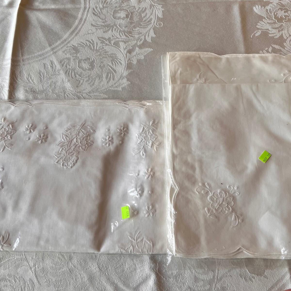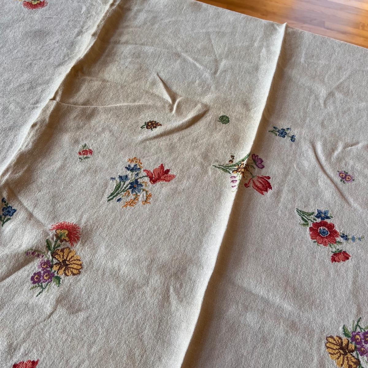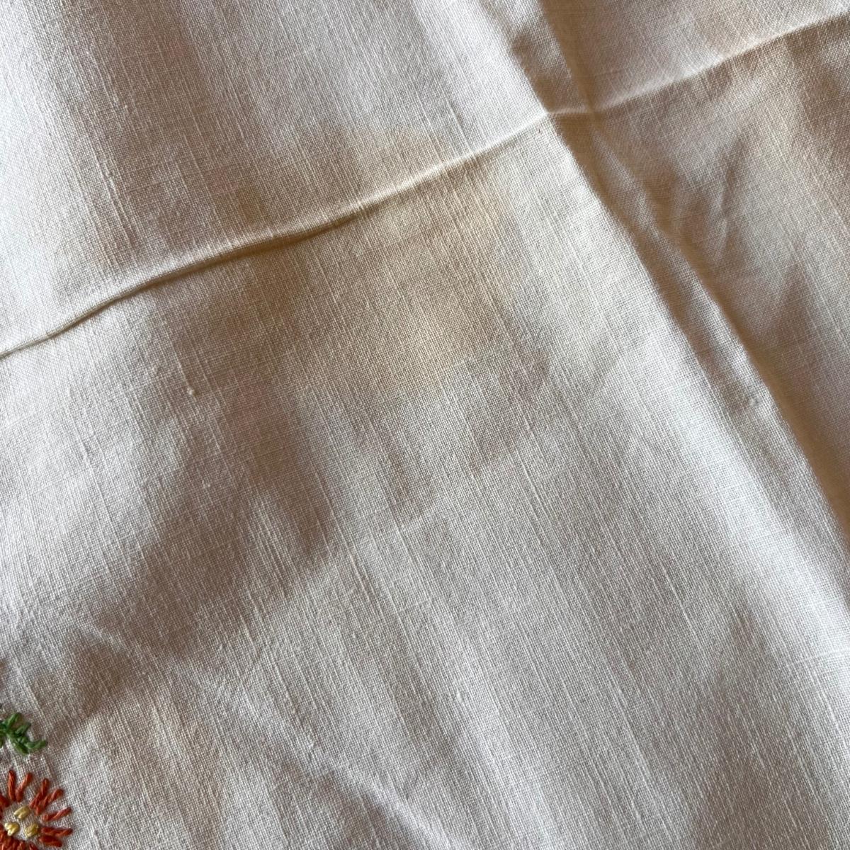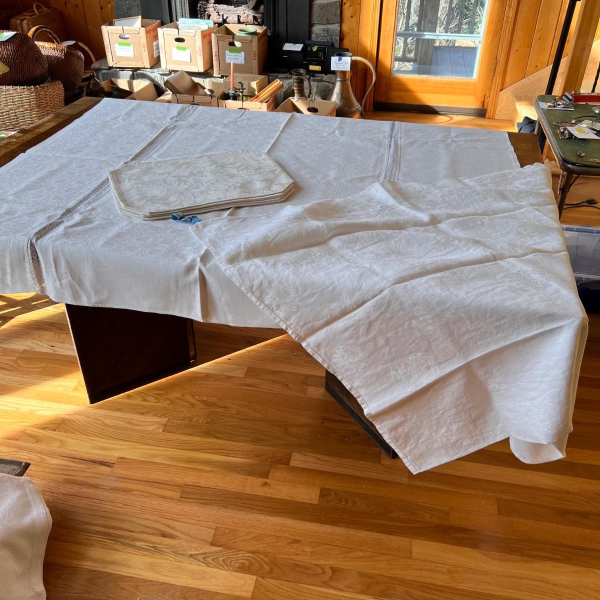 Approximately 15 tablecloths, mostly linen and includes some that are embroidered. Lot also includes lace doilies and napkins. A fair number of light stains on items, see images. Tablecloths were photographed on a 40” x 62” x 29”H table.