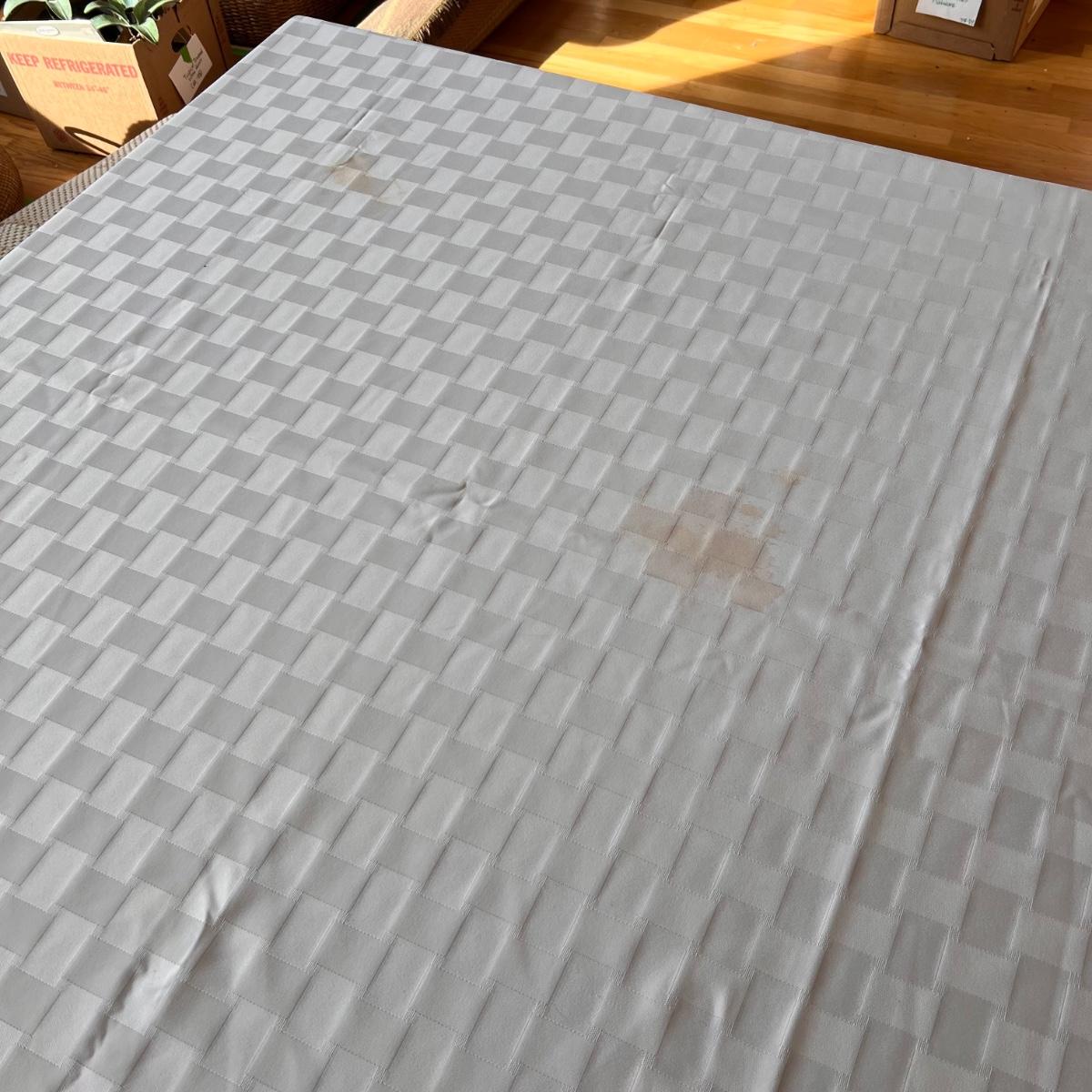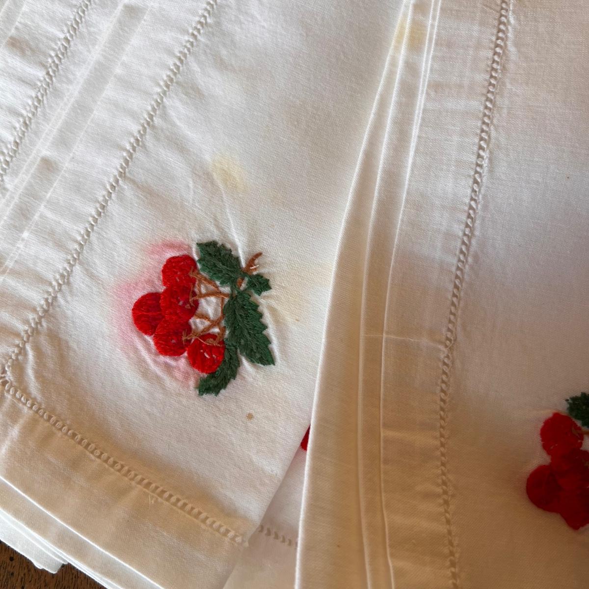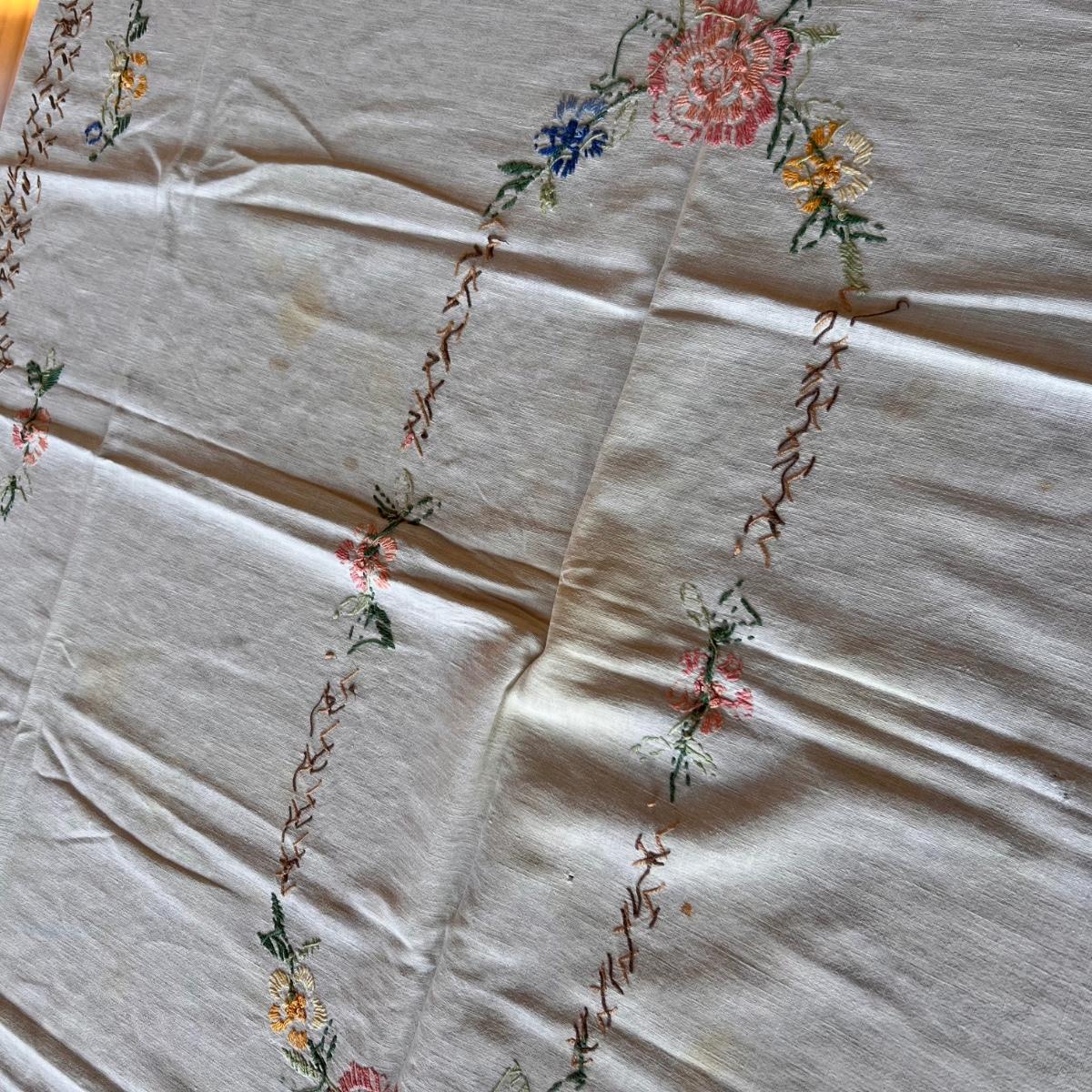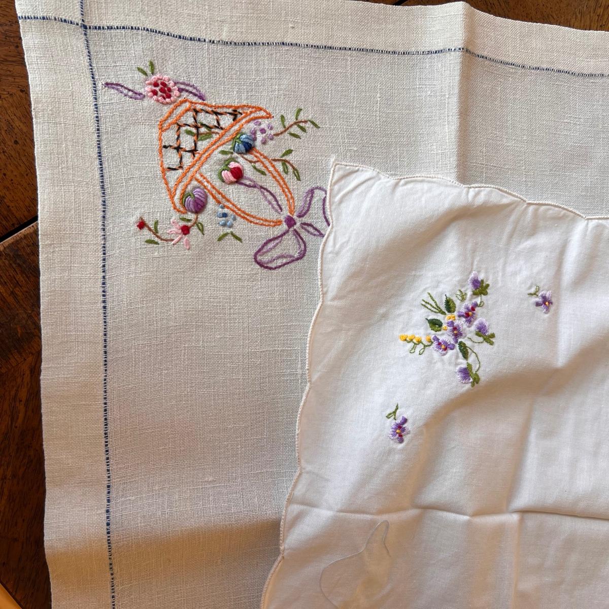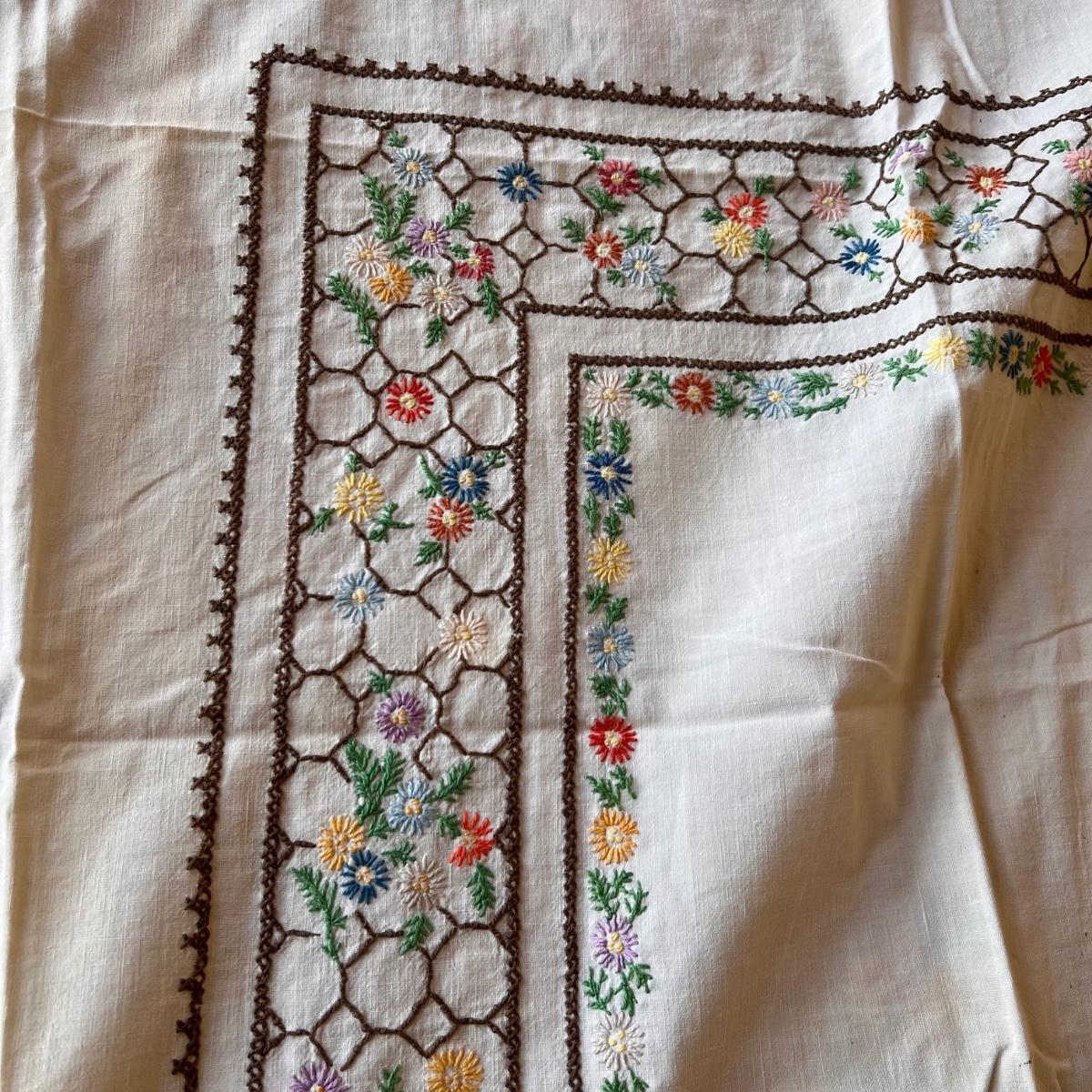 Approximately 15 tablecloths, mostly linen and includes some that are embroidered. Lot also includes lace doilies and napkins. A fair number of light stains on items, see images. Tablecloths were photographed on a 40” x 62” x 29”H table.