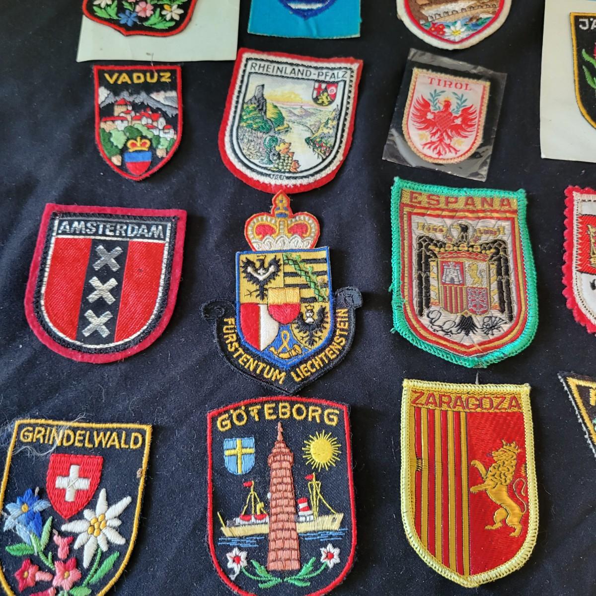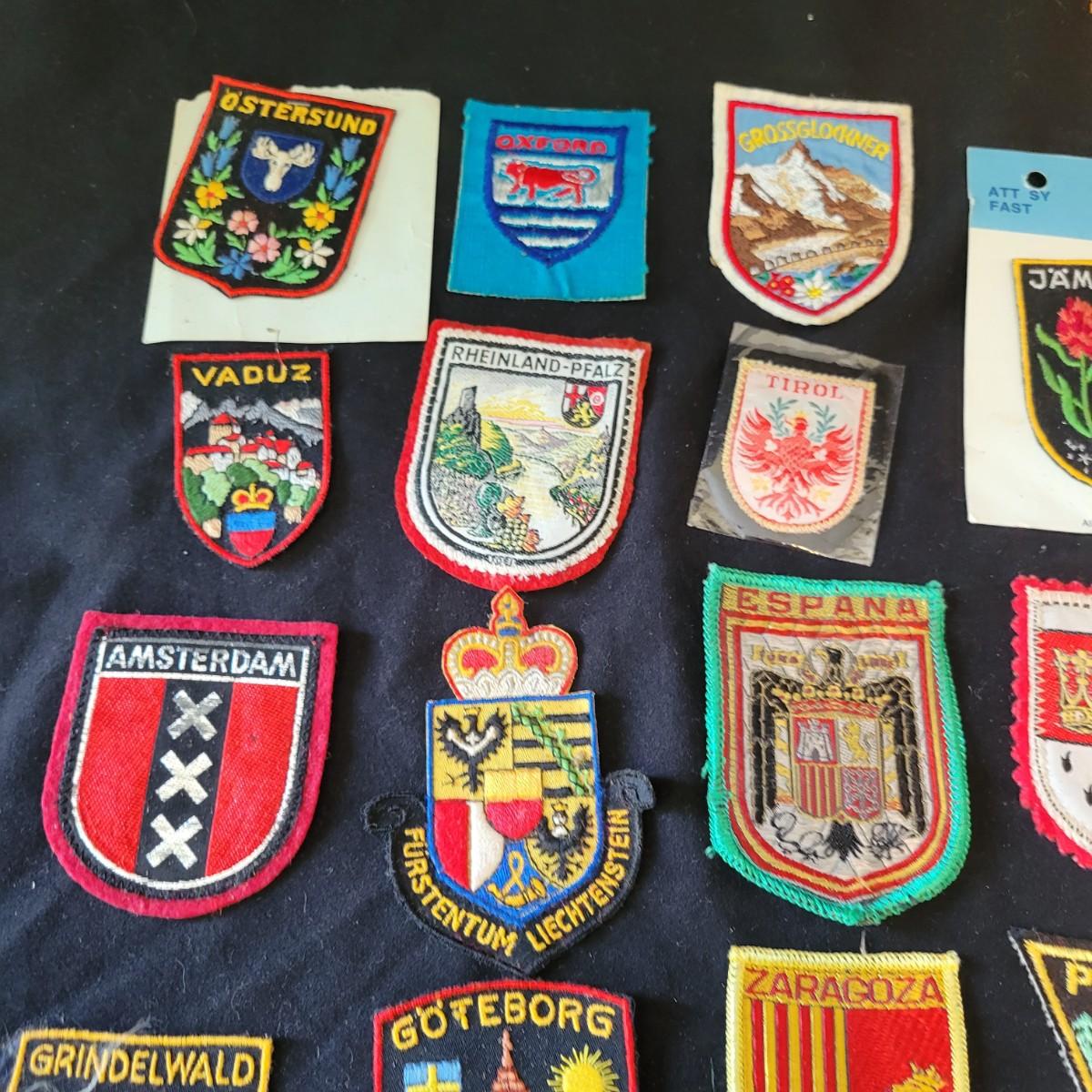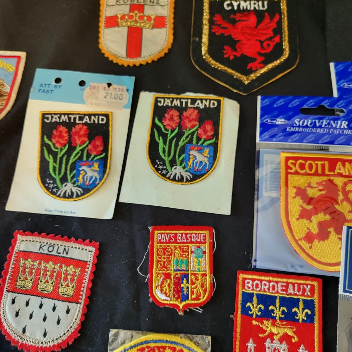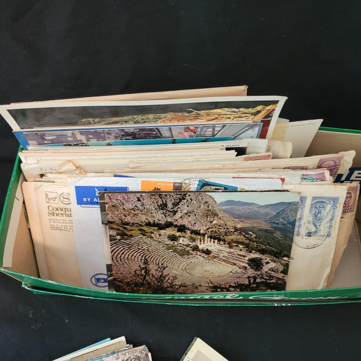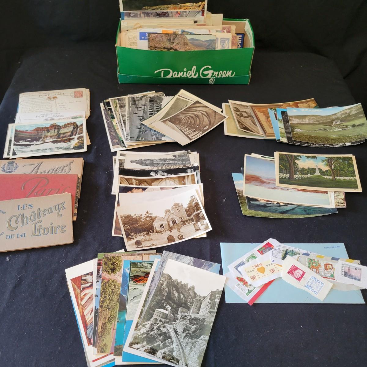 An assortment of patches from Europe, most are unused and some are still in original packaging. A box full of postcard. Most are new, but there are some that have been mailed. Many are vintage and are from Europe and the United States. Also included are stamps and letters from European countries. A majority of theses have been stamped from mailing. Shipping available