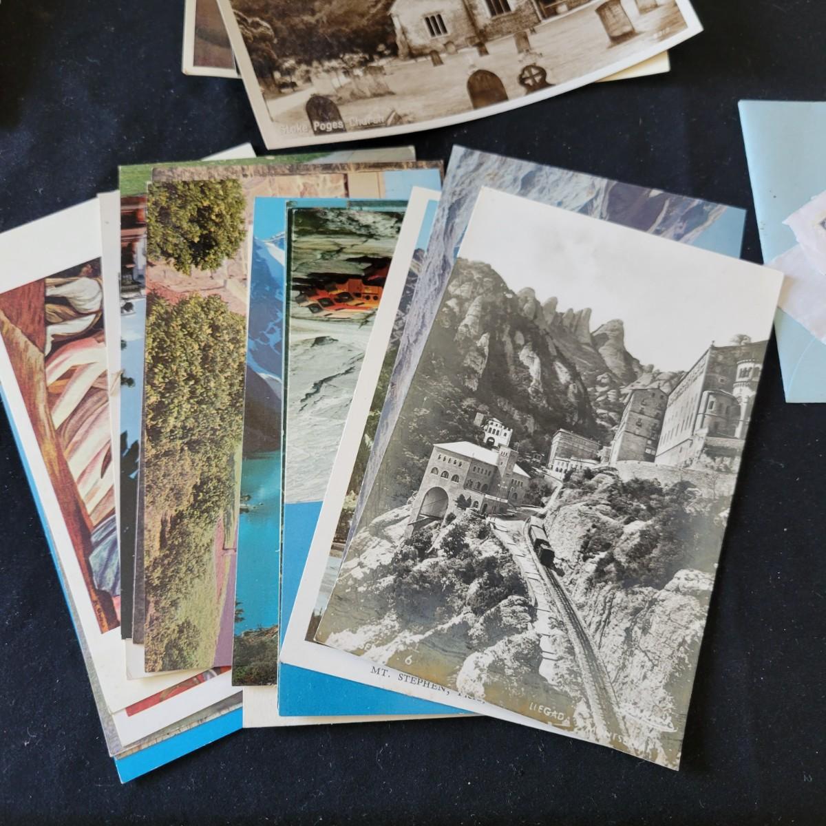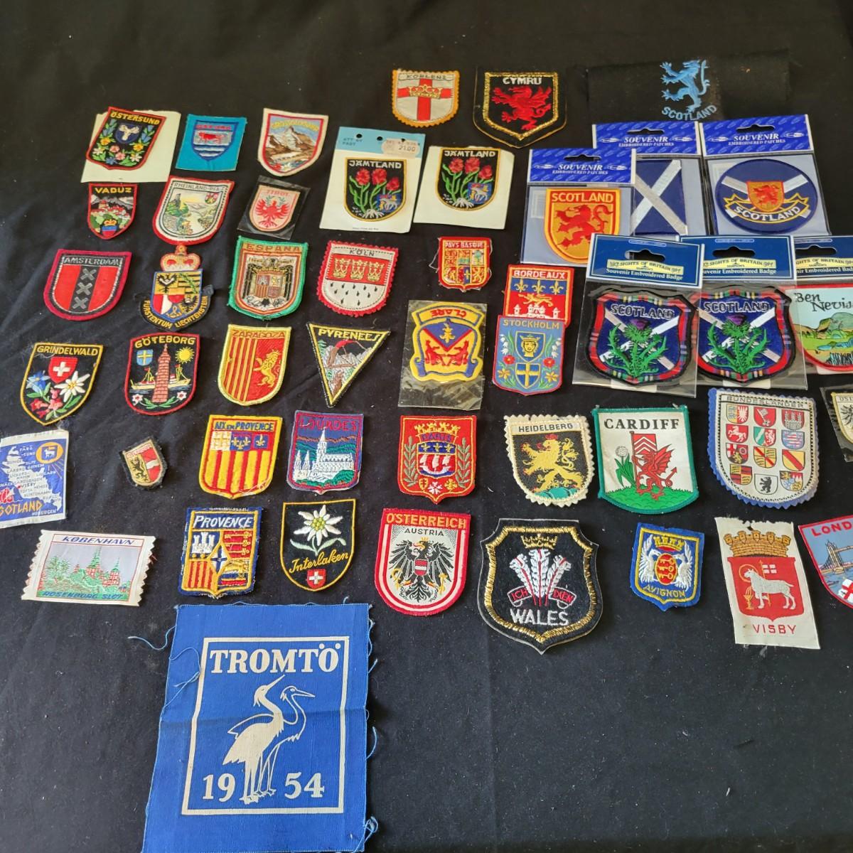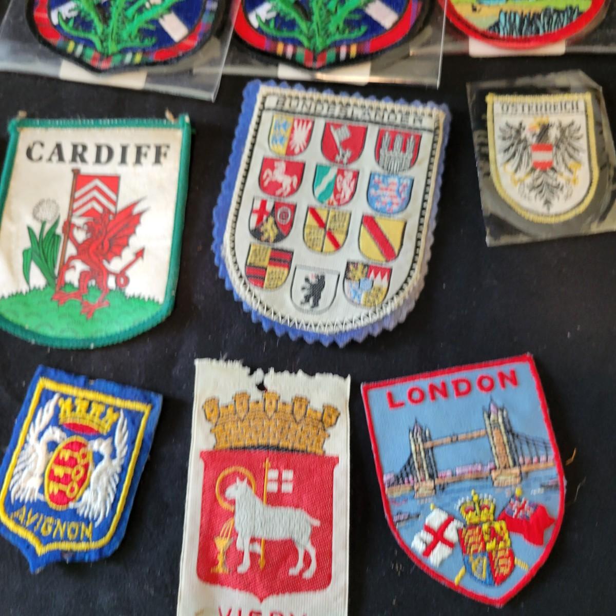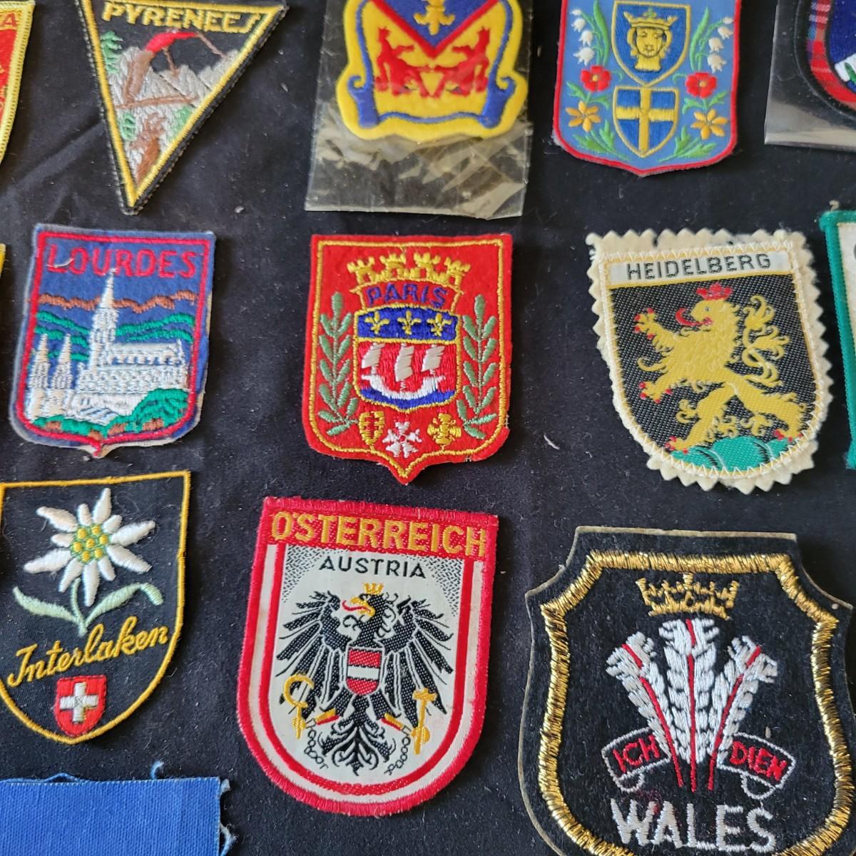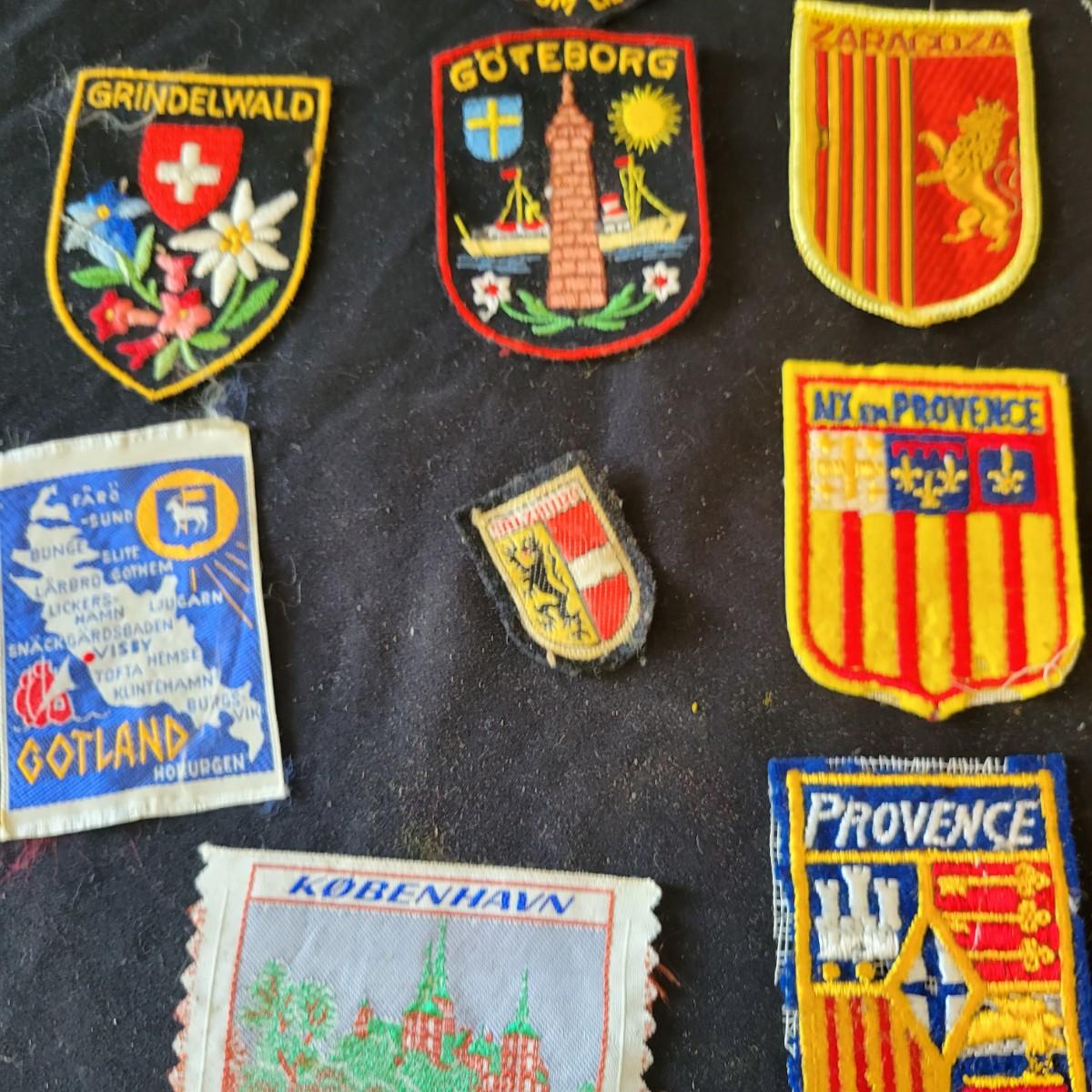 An assortment of patches from Europe, most are unused and some are still in original packaging. A box full of postcard. Most are new, but there are some that have been mailed. Many are vintage and are from Europe and the United States. Also included are stamps and letters from European countries. A majority of theses have been stamped from mailing. Shipping available