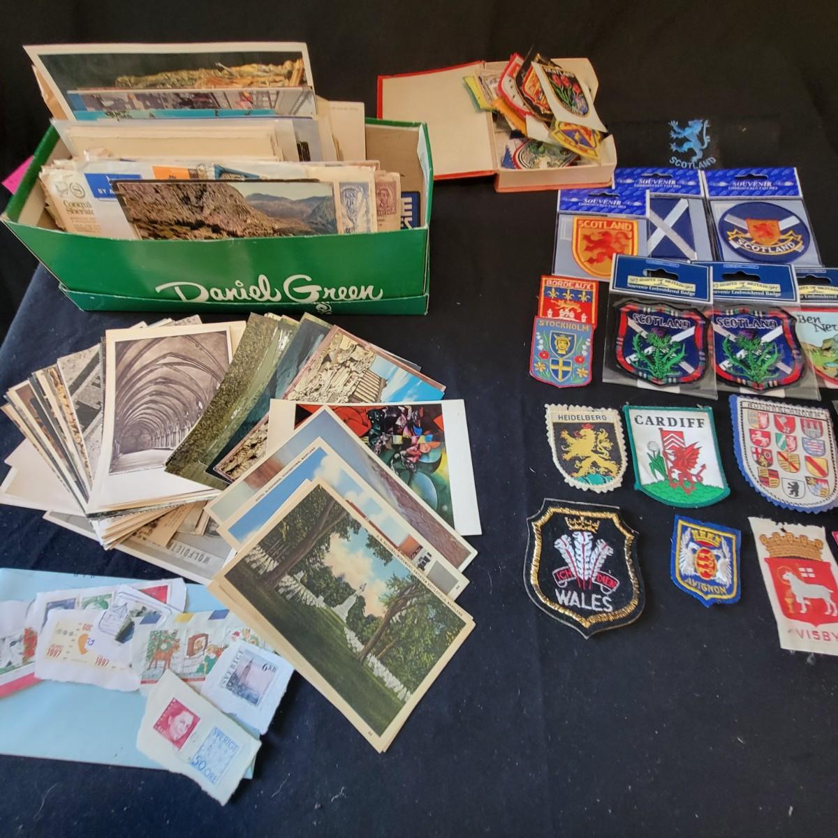 Large Assortment of Patches, Postcards and Stamps (LR-DW)
