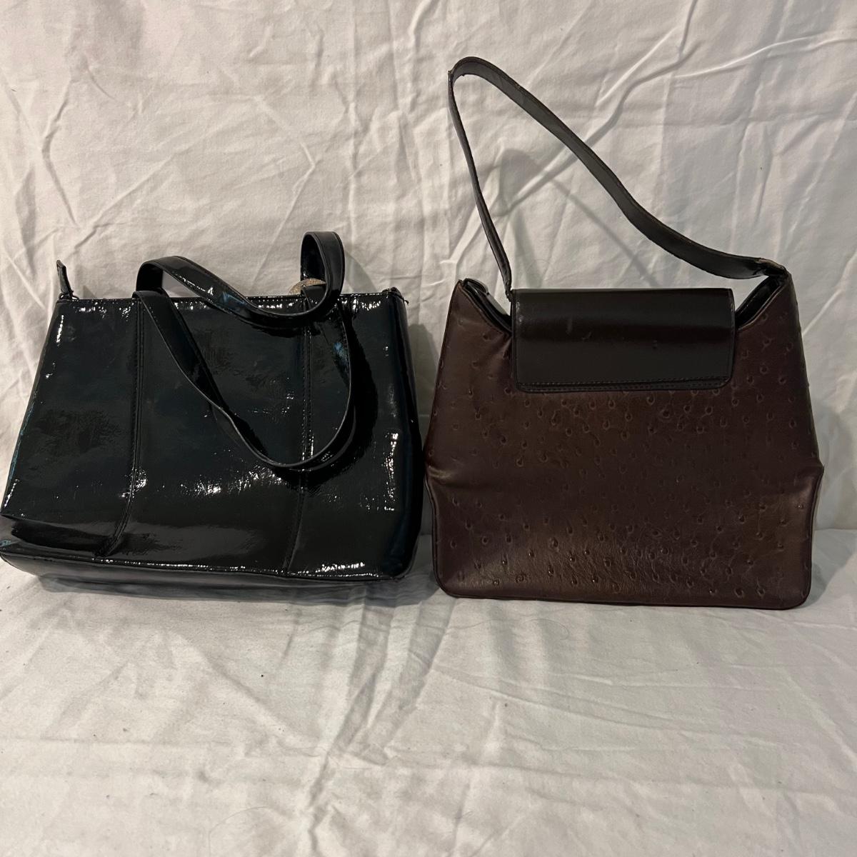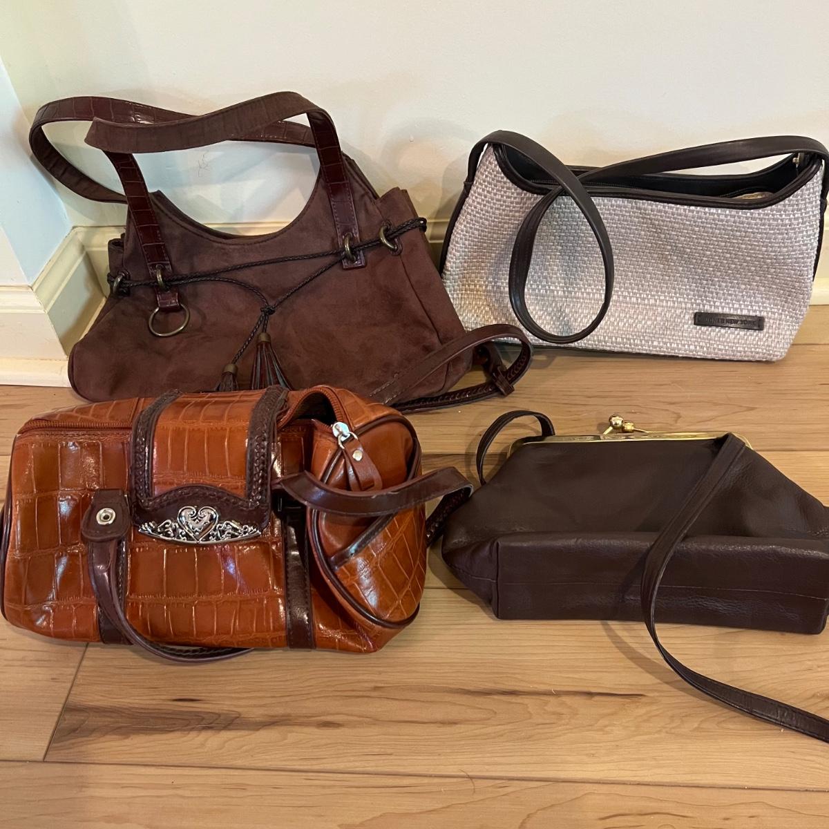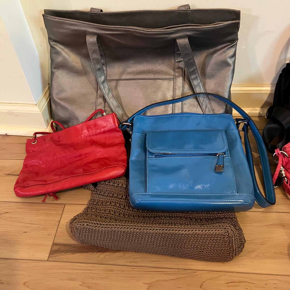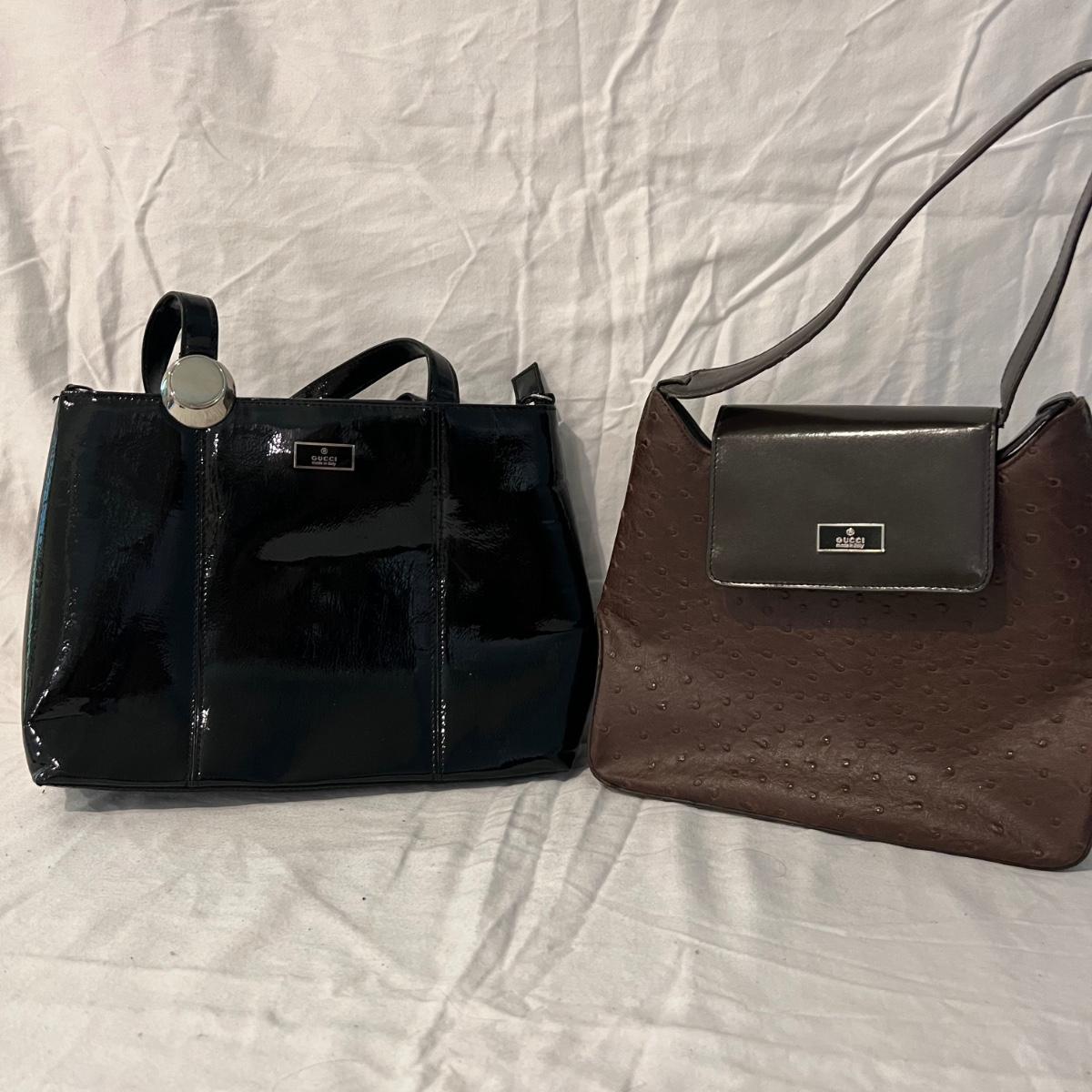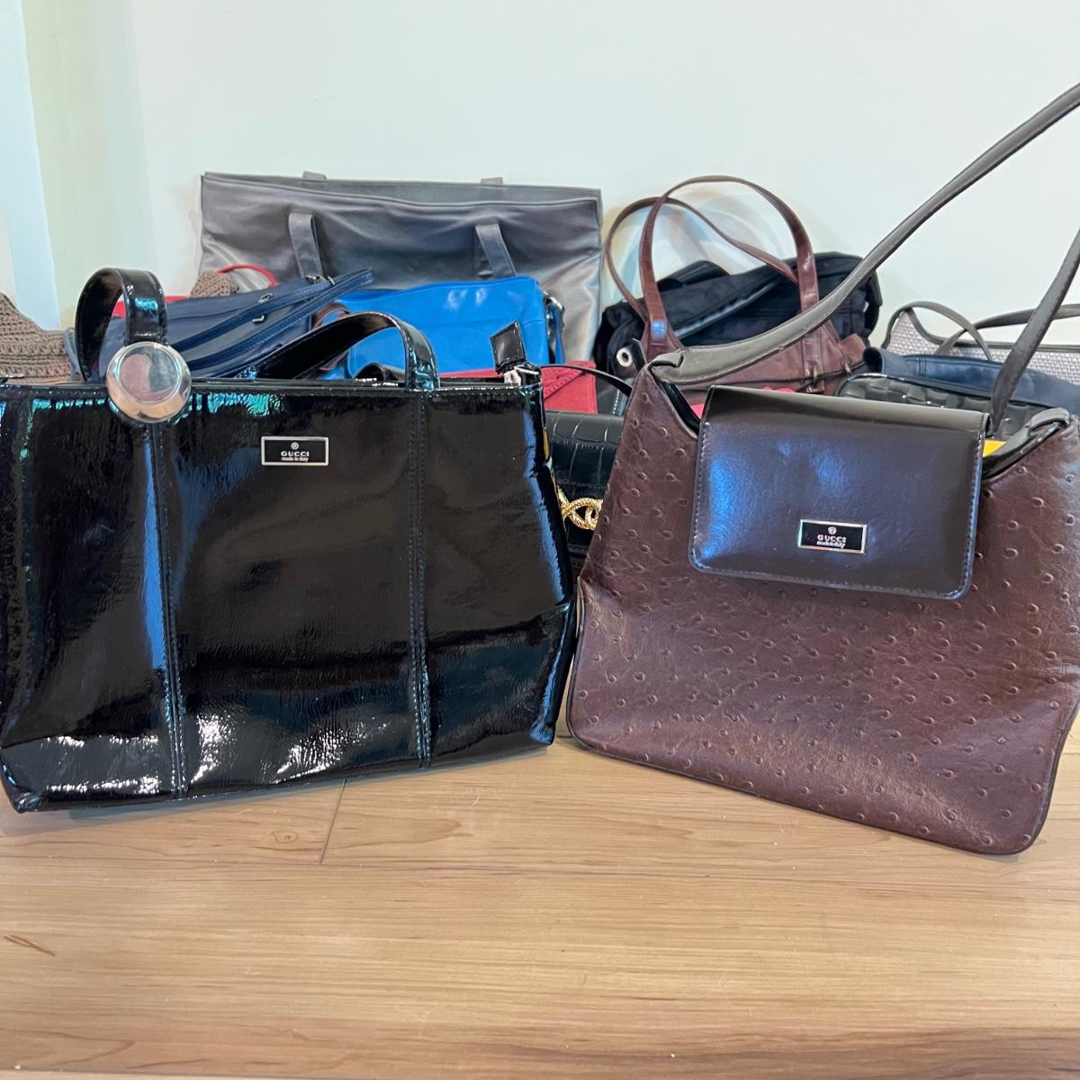 19 purses in this lot that includes some that are genuine leather. Two have Gucci labels but we cannot authenticate them and note the brown purse has some splitting in the handle. See images for tags where found.