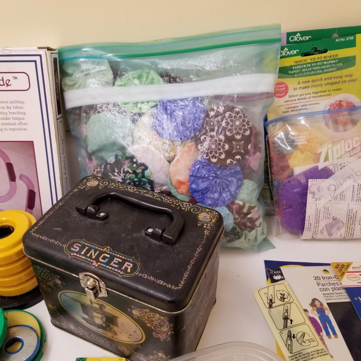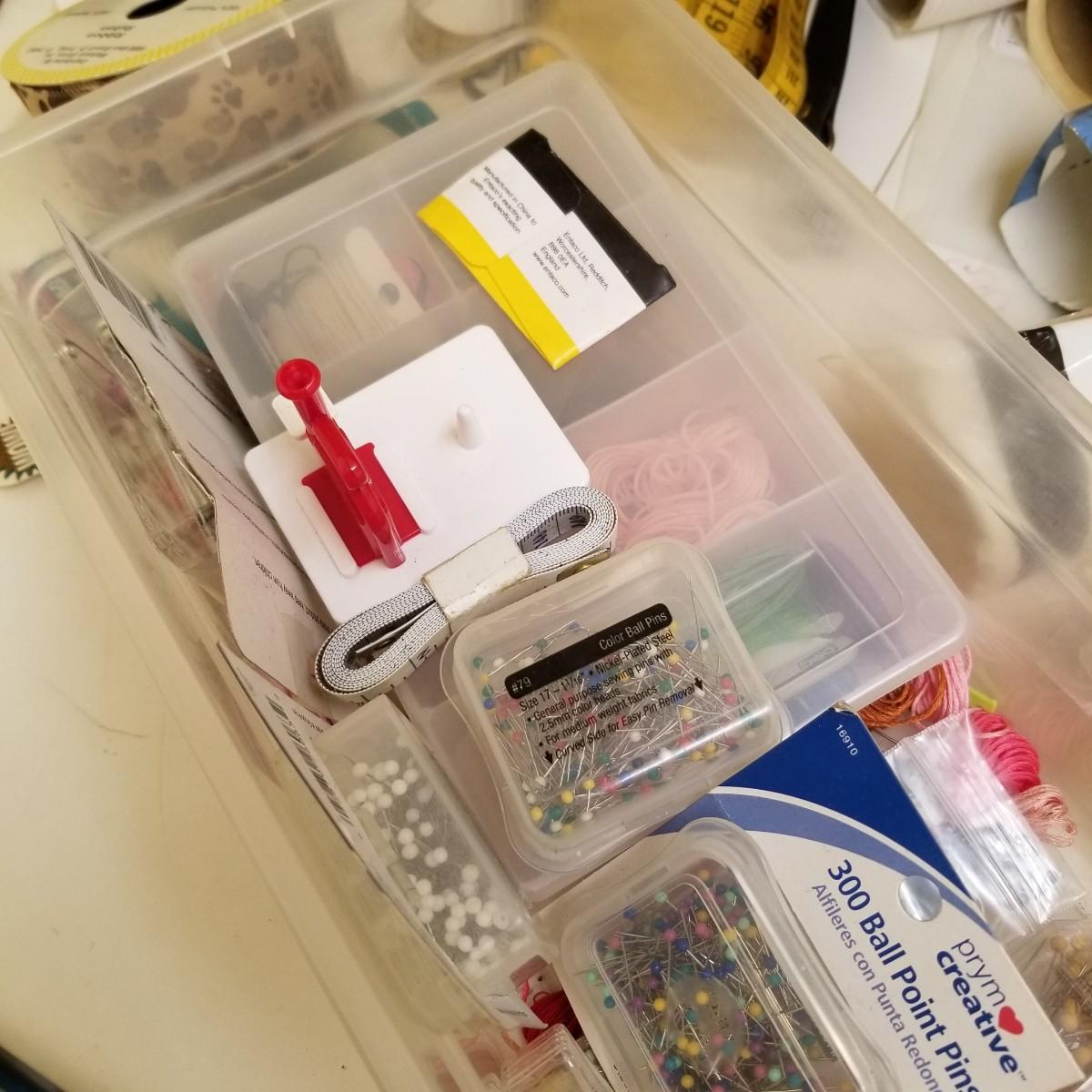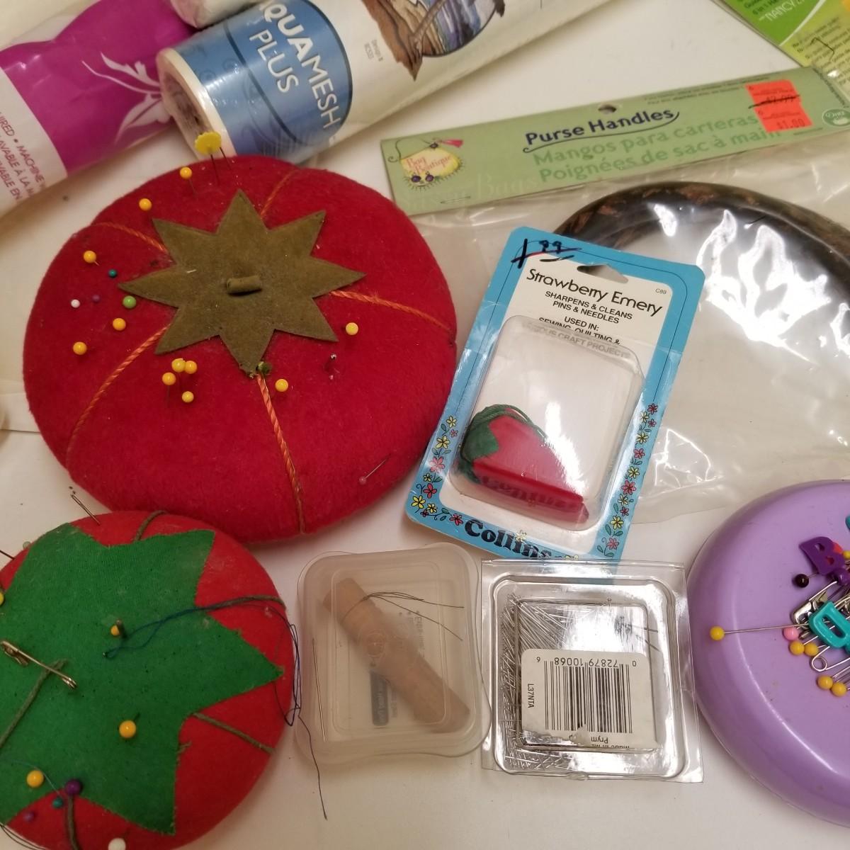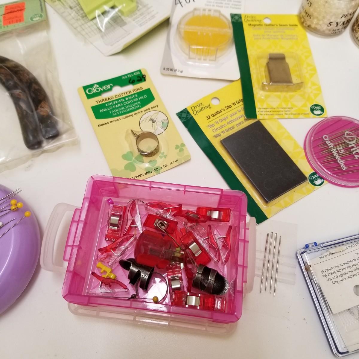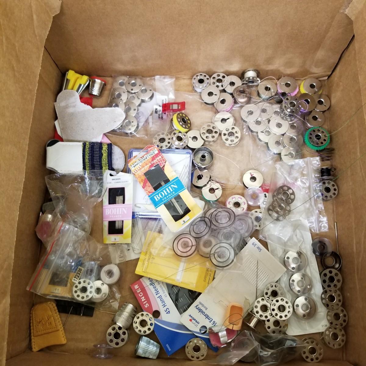 The gold mine of sewing stuff. Needles, pins, bobbins, buttons, ribbon, pattern weights, markers, clips, tools, gauges, beads, on and on. Hundreds of pieces. See photos for details. Shipping available.