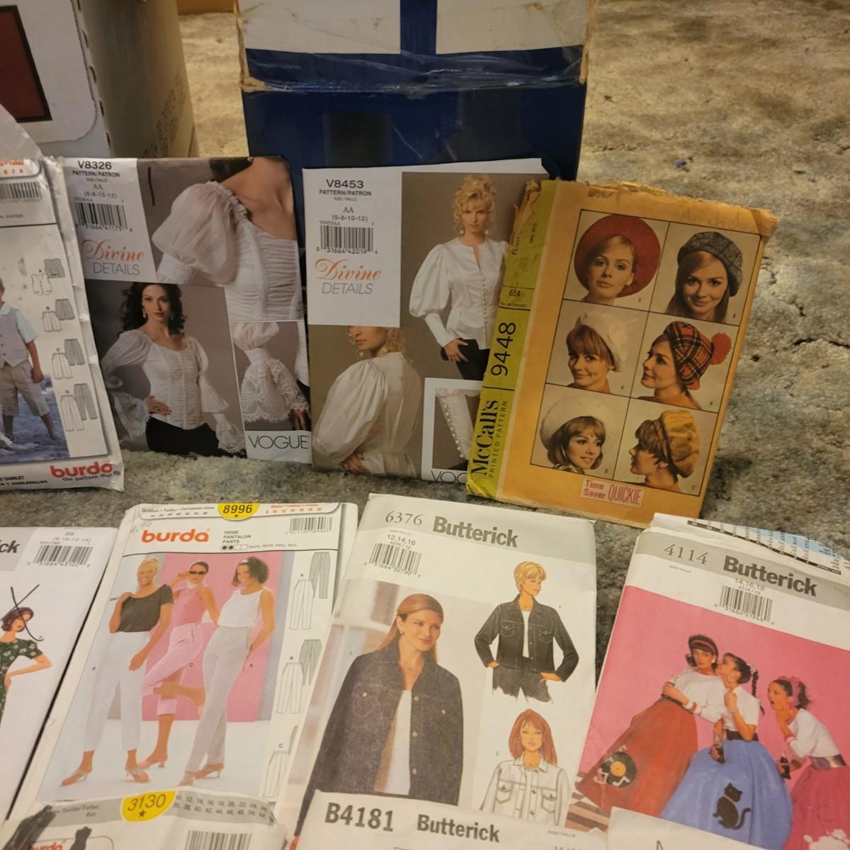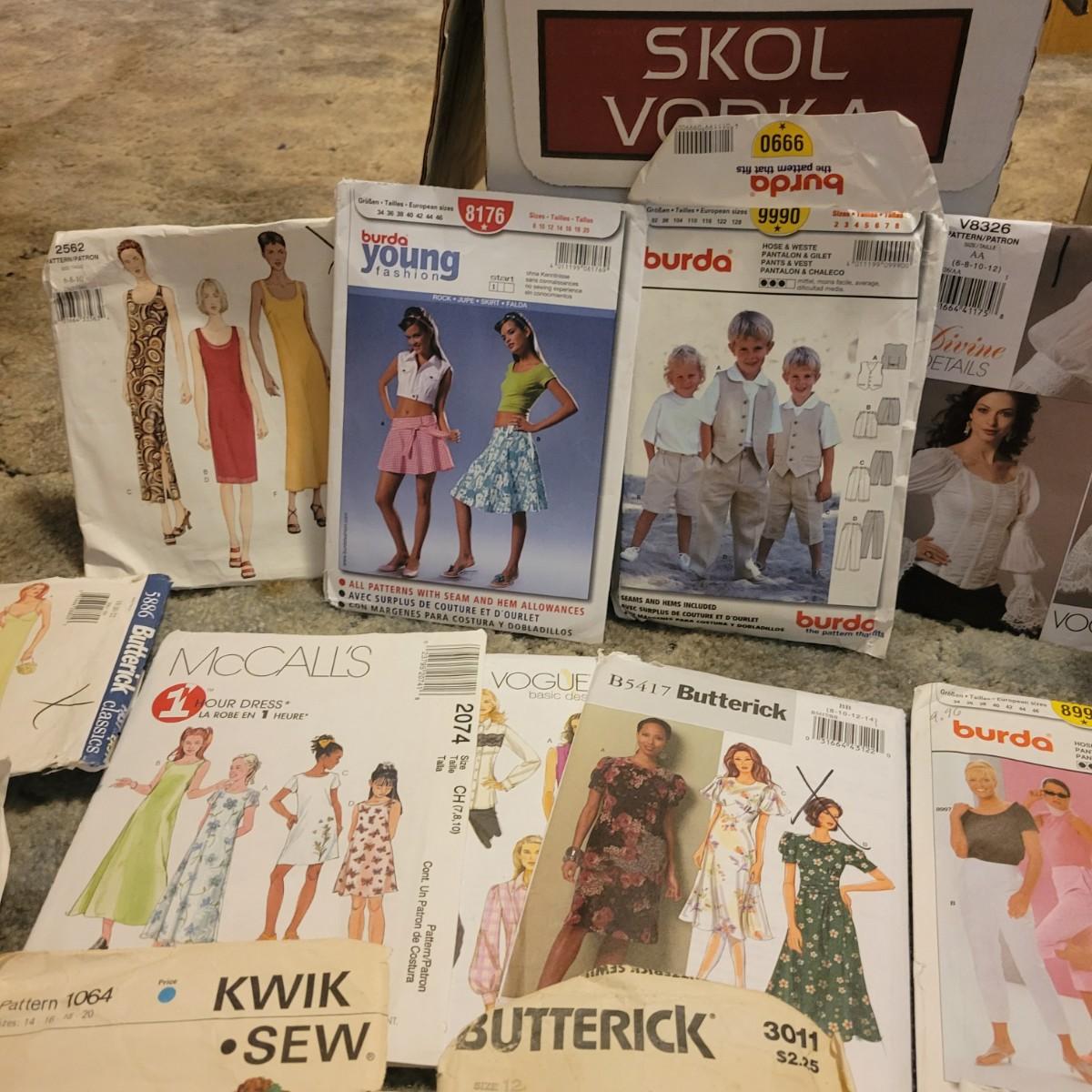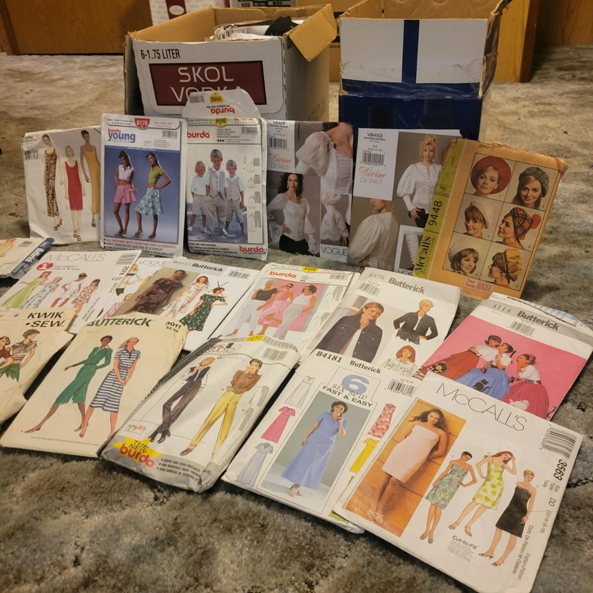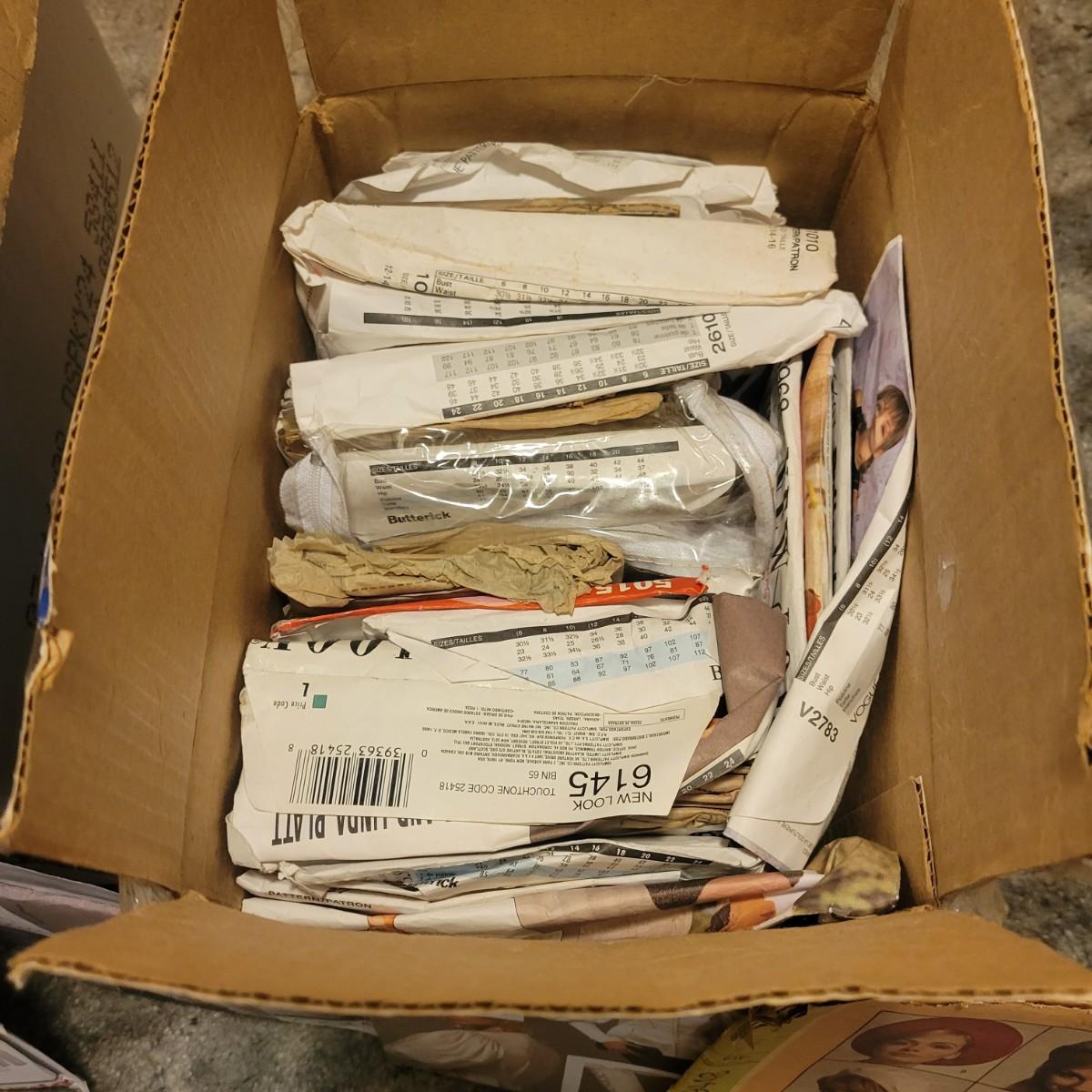 Two boxes full of sewing patterns. It appears most have been used, but cut outlines have been put back into their respective packages. Patterns for women's clothing, children's clothing, dolls, etc. Likely ove 80 patterns in this lot. Shipping available
