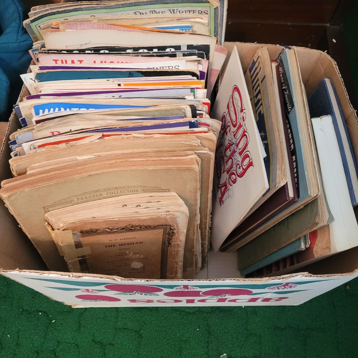 A box full of sheet music. Some of it is dated to the early 1900s, some are newer publications. Condition ranges from fair to good depending on use and age. See attached pictures for more detail. Shipping available. Shipping can be costly please call UPS store at 828-252-6930 for quote