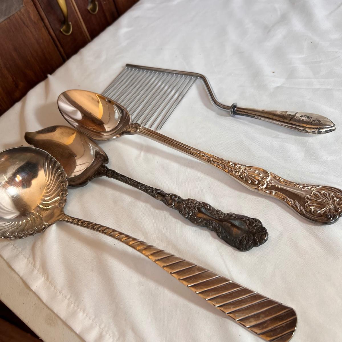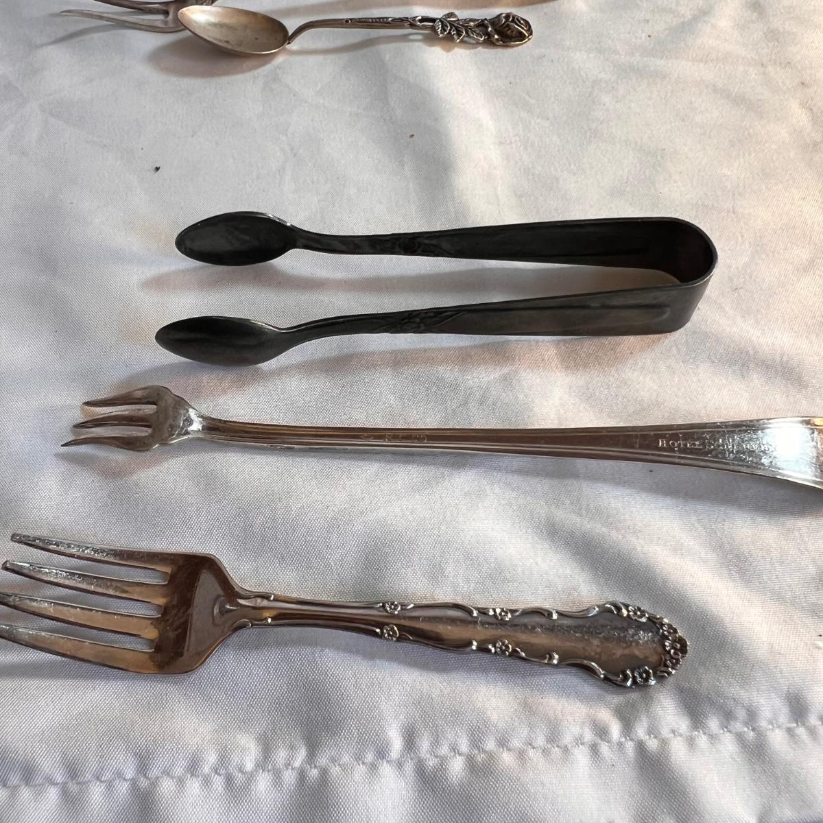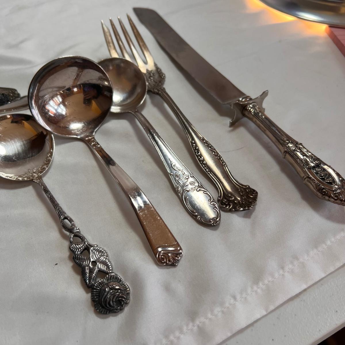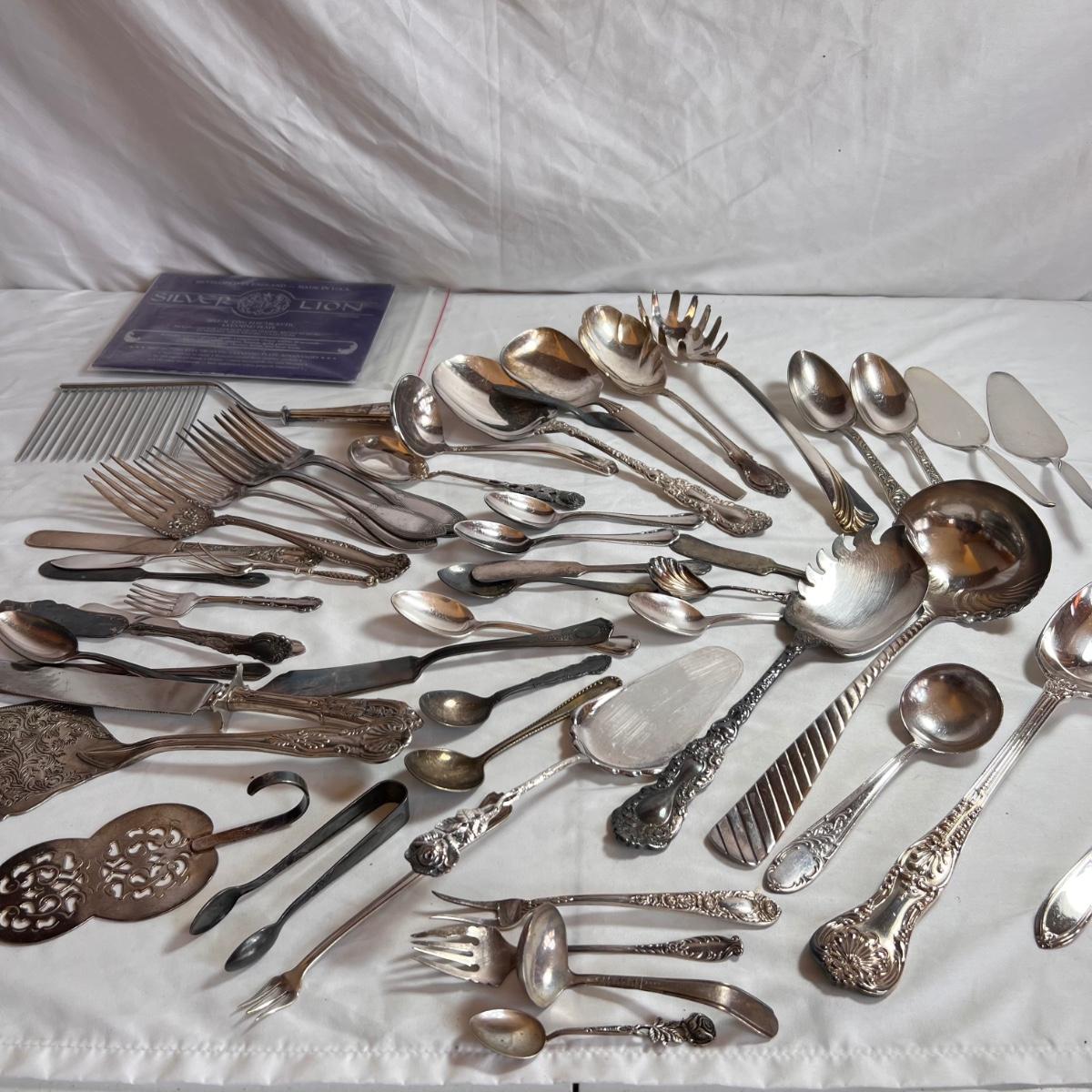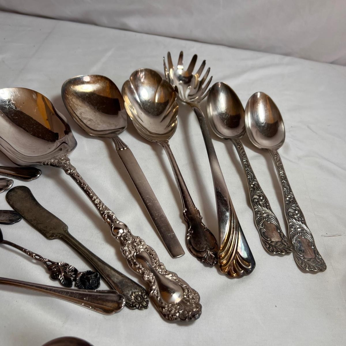 This large lot includes lots of silver flatware and serving utensils. All but five are silver plate; items in the last photos are sterling and includes two teaspoons and three small dessert forks.