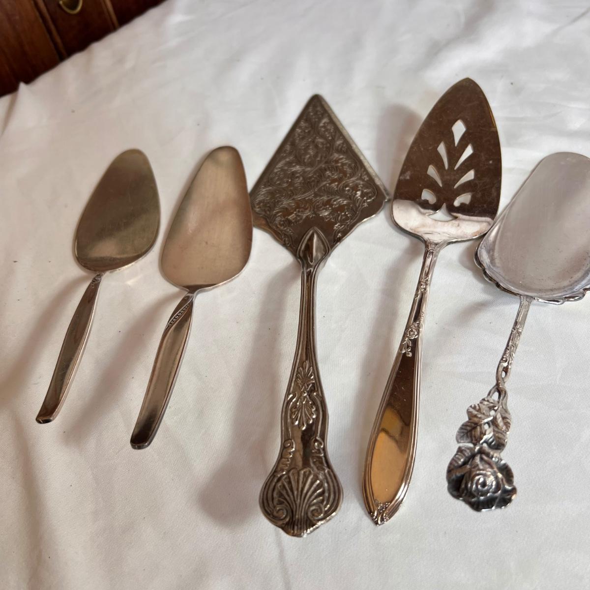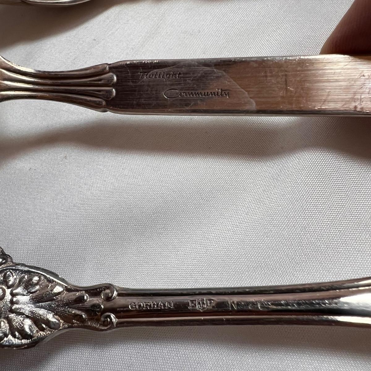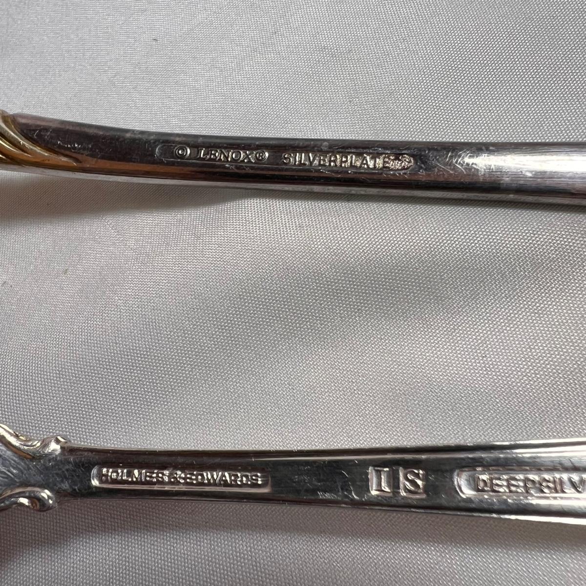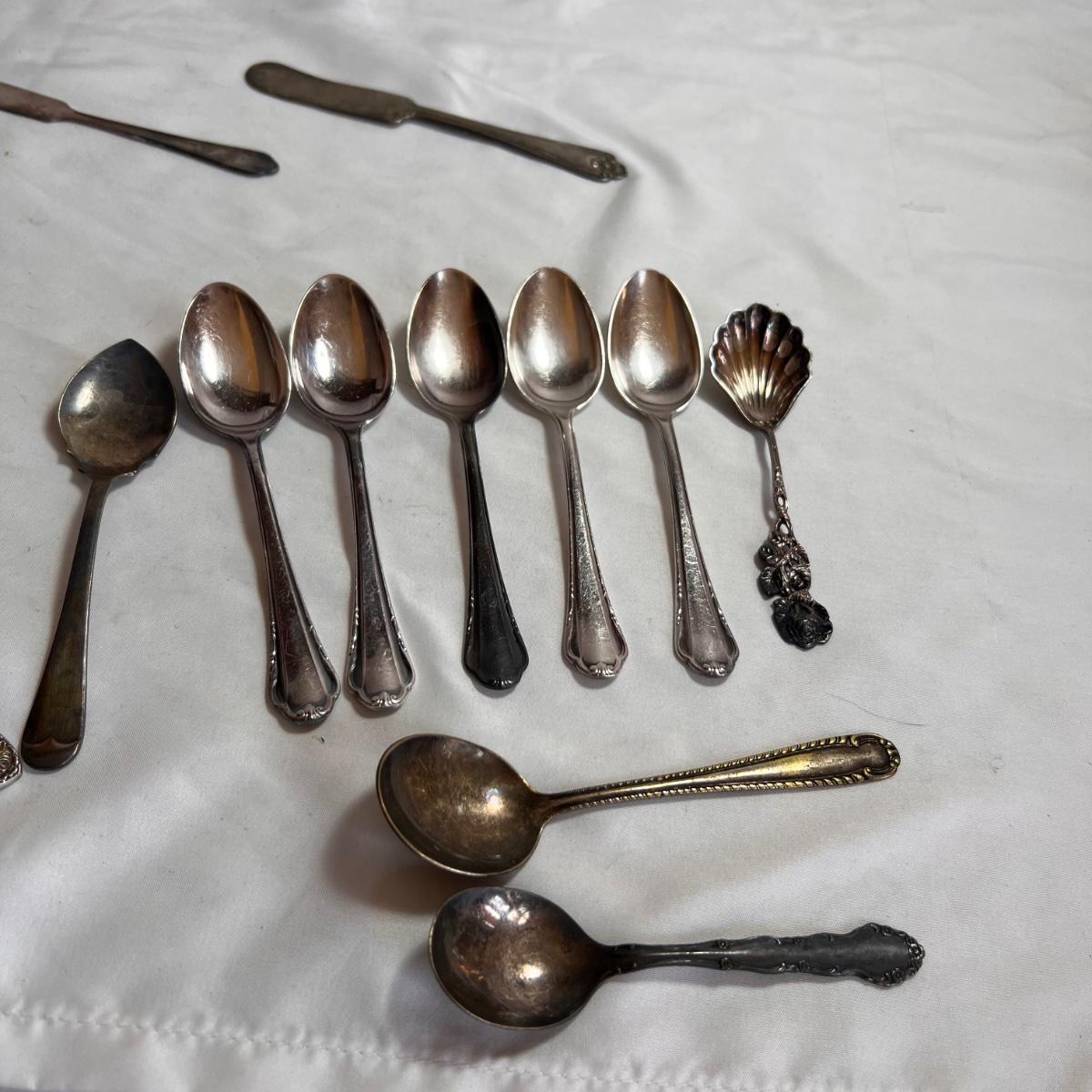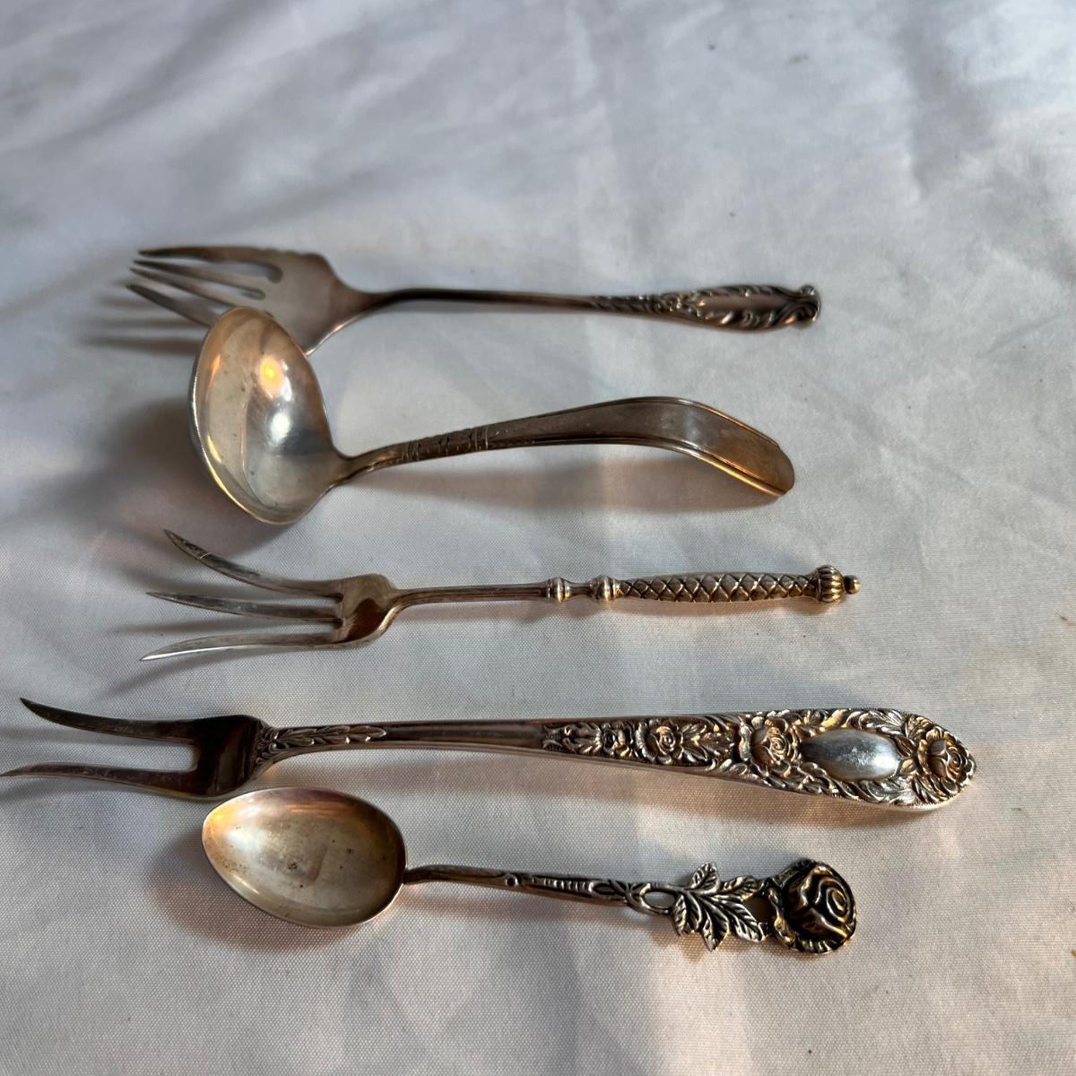 This large lot includes lots of silver flatware and serving utensils. All but five are silver plate; items in the last photos are sterling and includes two teaspoons and three small dessert forks.