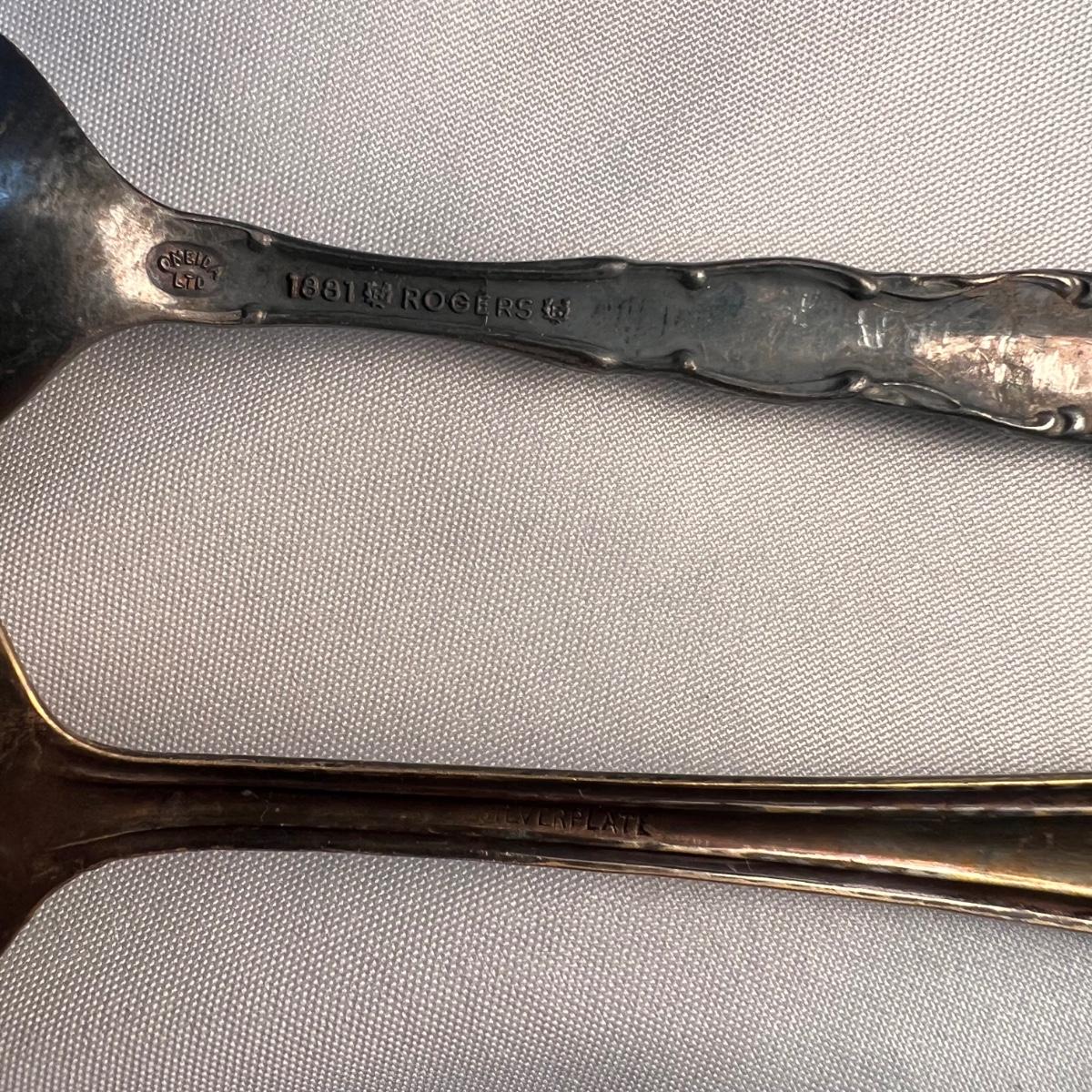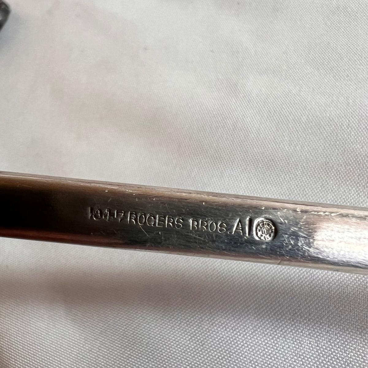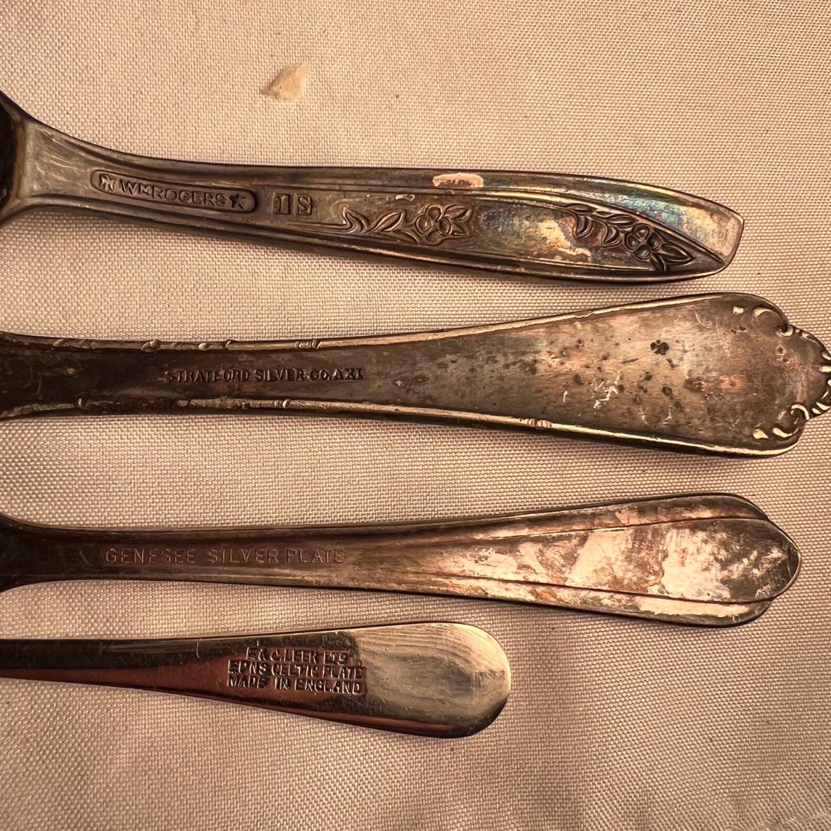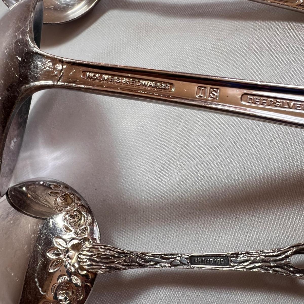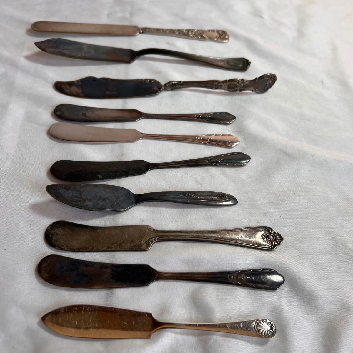 This large lot includes lots of silver flatware and serving utensils. All but five are silver plate; items in the last photos are sterling and includes two teaspoons and three small dessert forks.