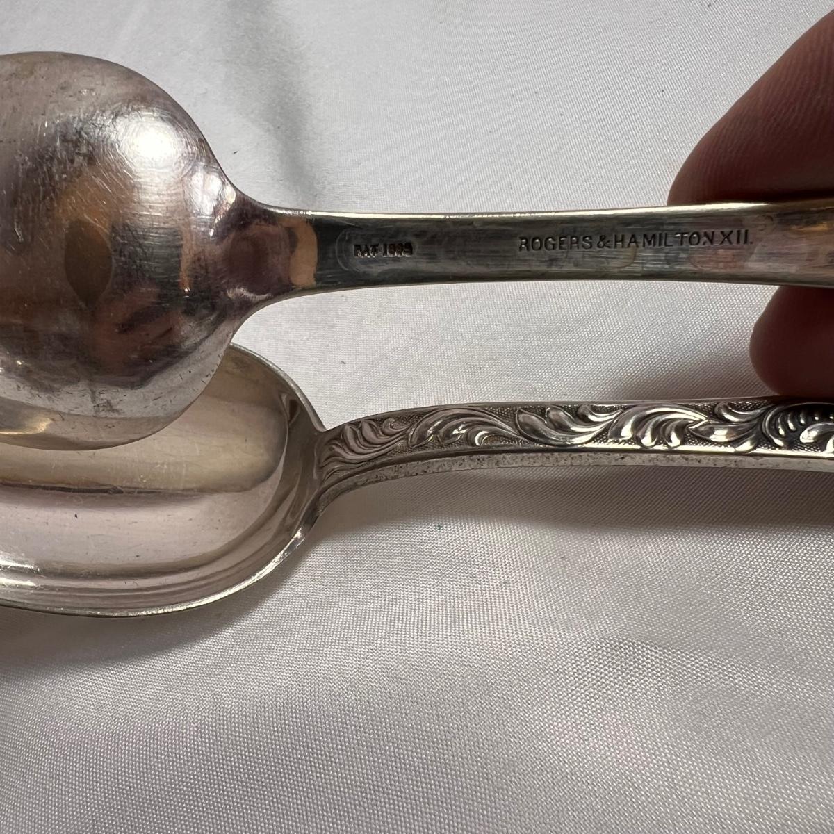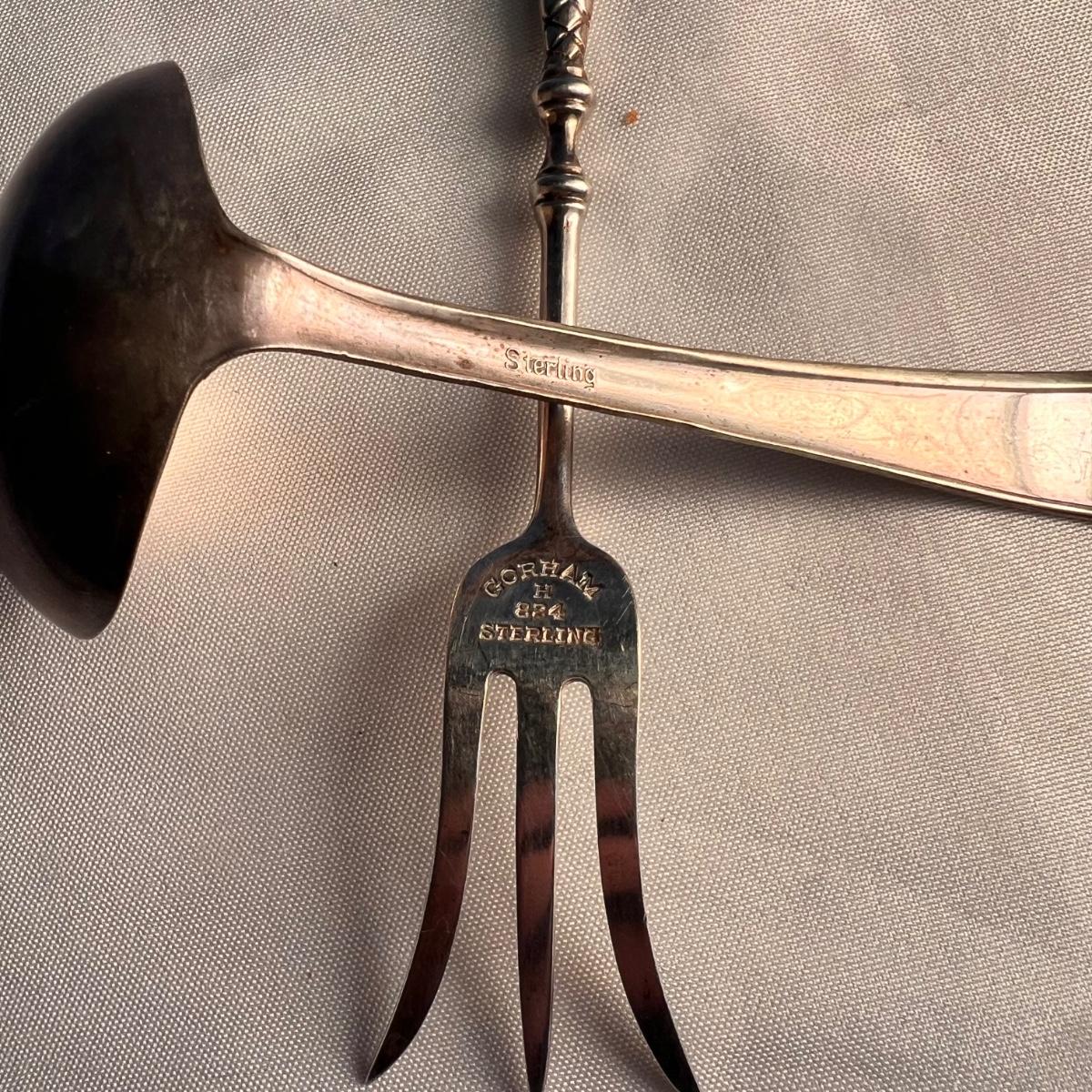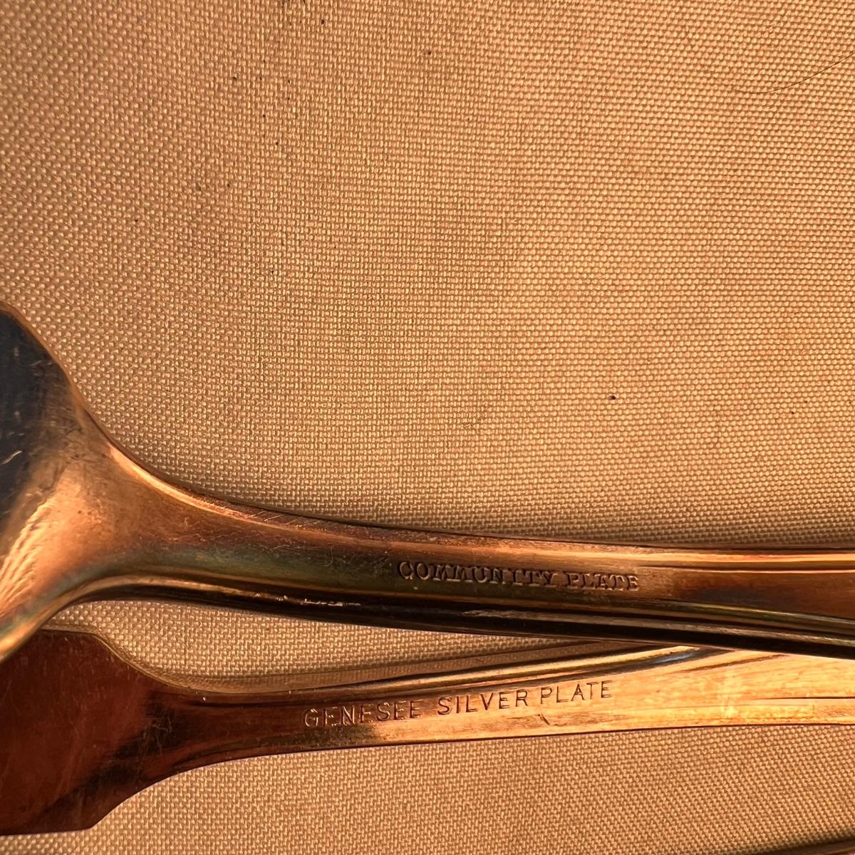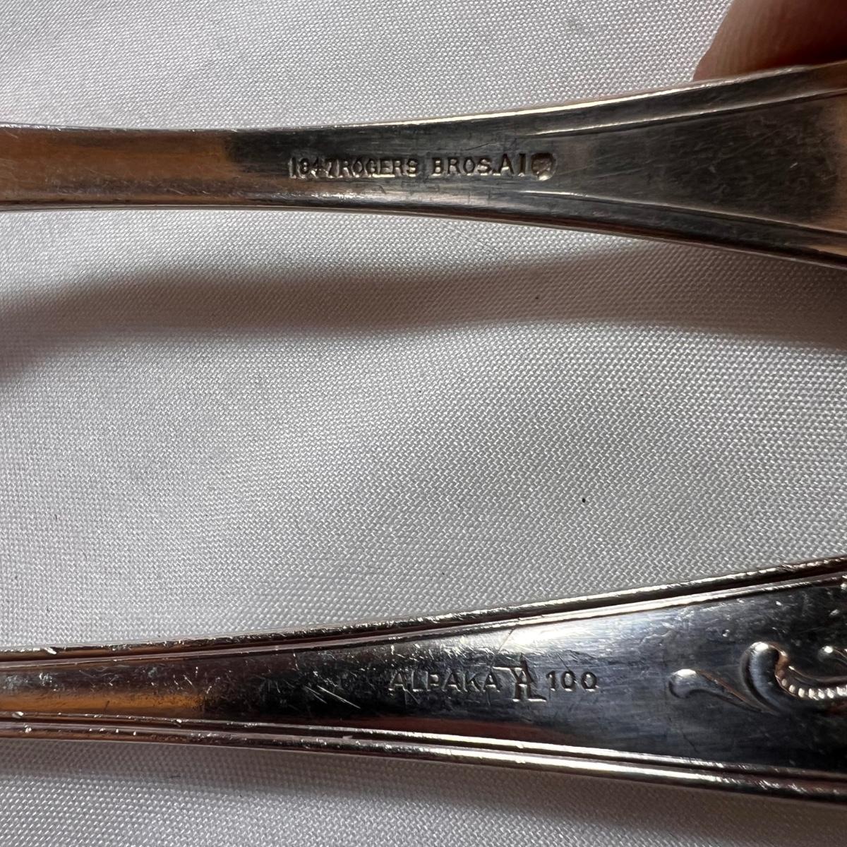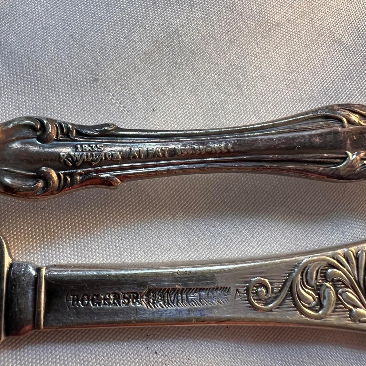 This large lot includes lots of silver flatware and serving utensils. All but five are silver plate; items in the last photos are sterling and includes two teaspoons and three small dessert forks.