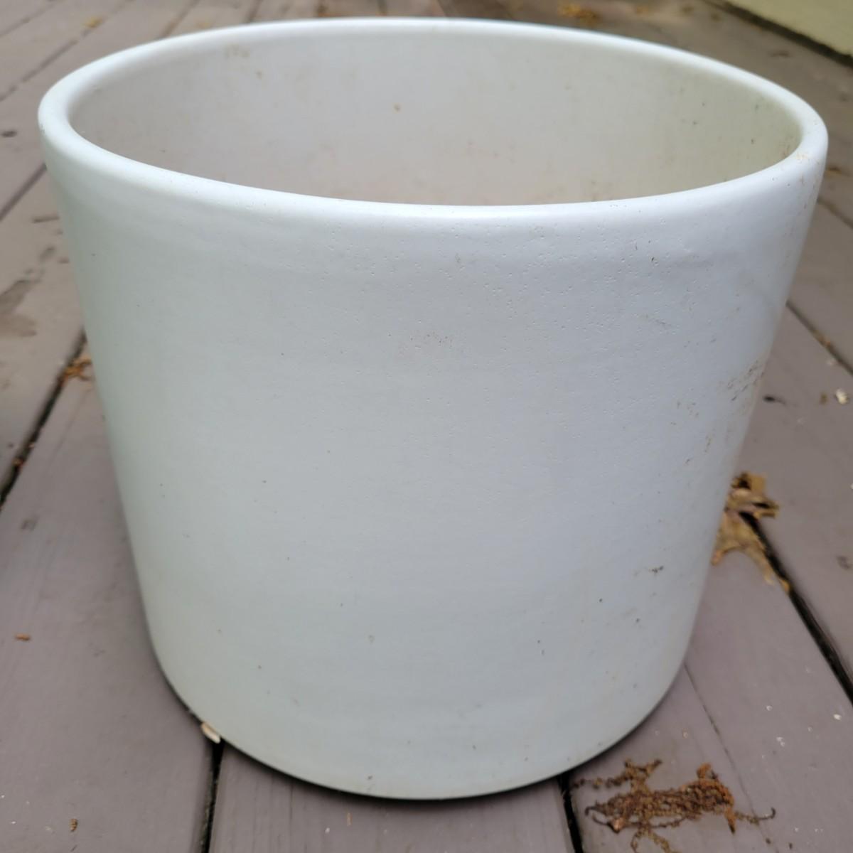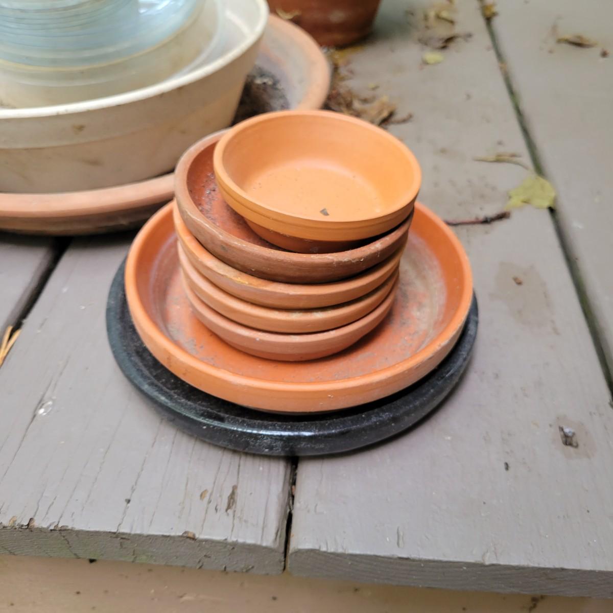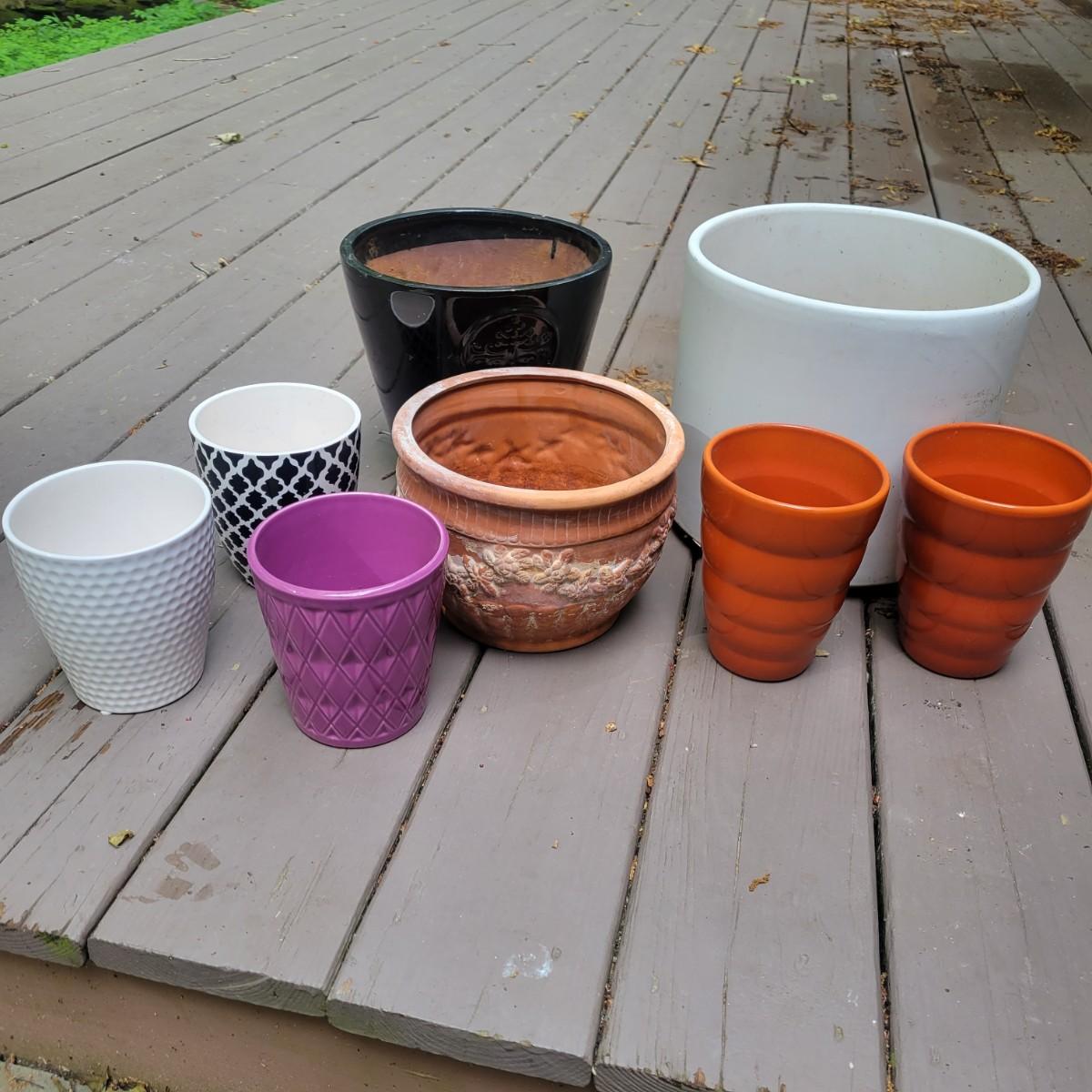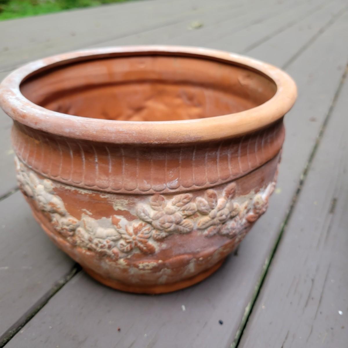 A large assortment of terracotta and ceramic planters and bases. There is a variety of sizes and designs in this lot with the largest white planter measuring approximately 11"D x 10"H and the largest base measuring approximately 12.5"D. Local pickup only.