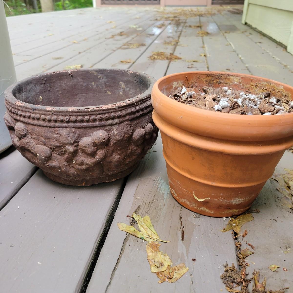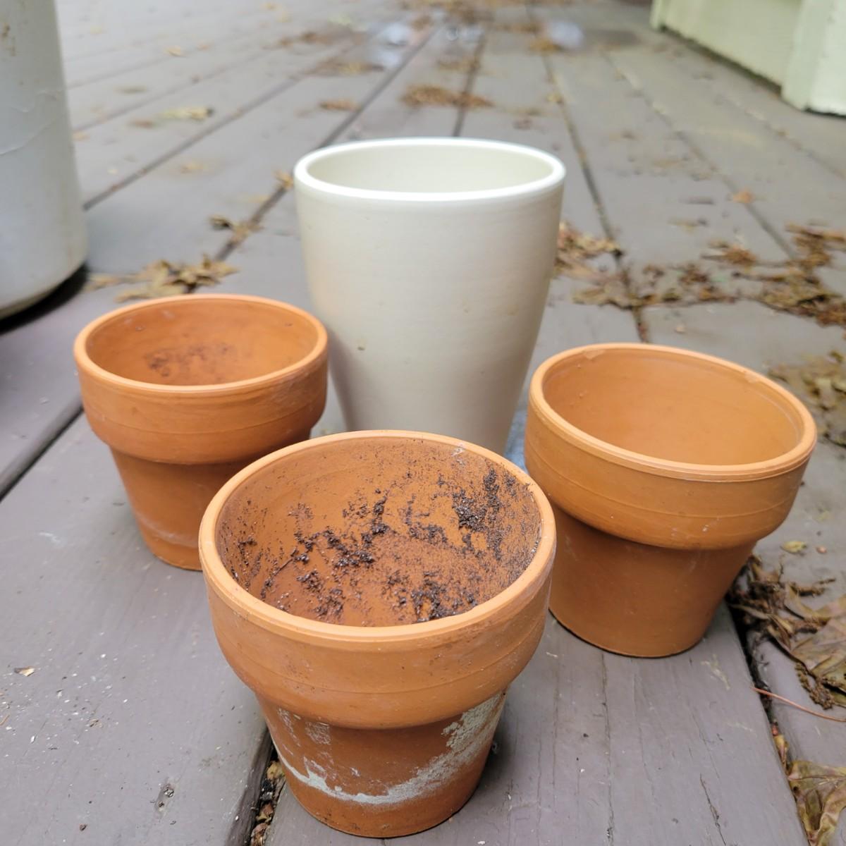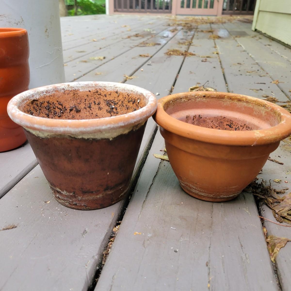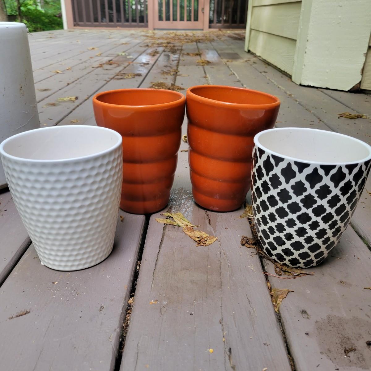 A large assortment of terracotta and ceramic planters and bases. There is a variety of sizes and designs in this lot with the largest white planter measuring approximately 11"D x 10"H and the largest base measuring approximately 12.5"D. Local pickup only.