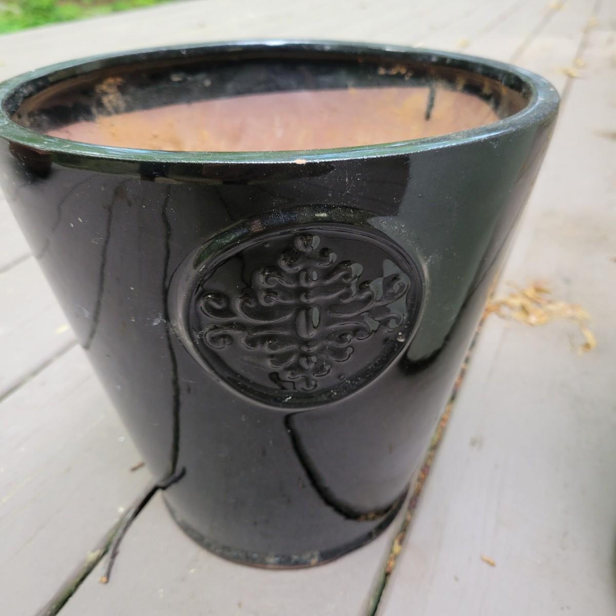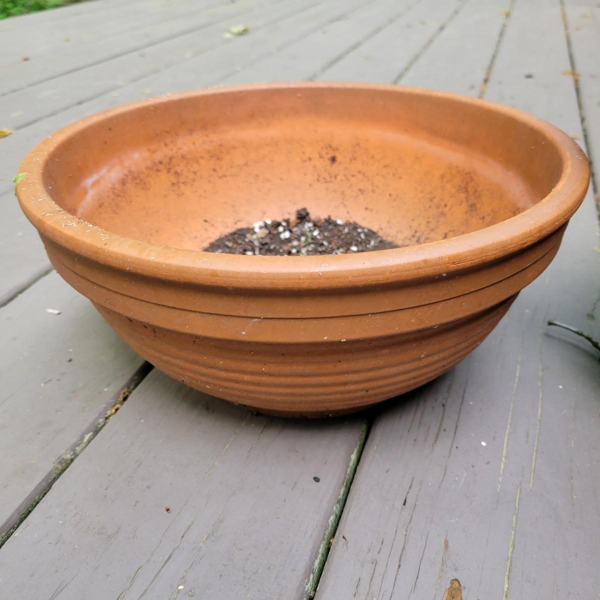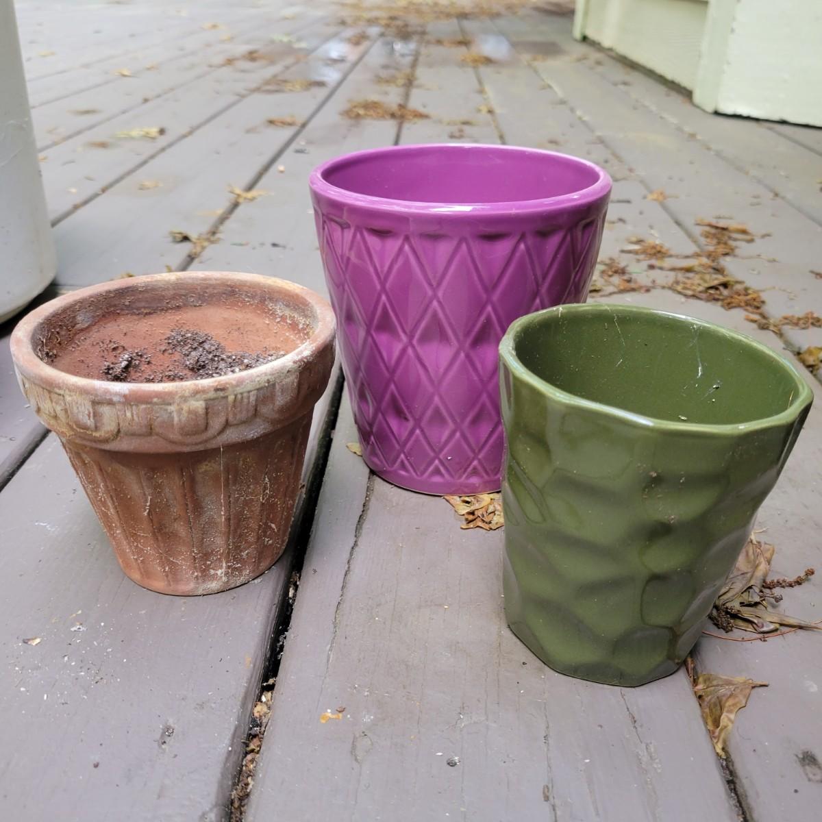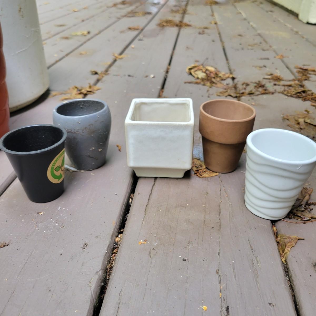 A large assortment of terracotta and ceramic planters and bases. There is a variety of sizes and designs in this lot with the largest white planter measuring approximately 11"D x 10"H and the largest base measuring approximately 12.5"D. Local pickup only.