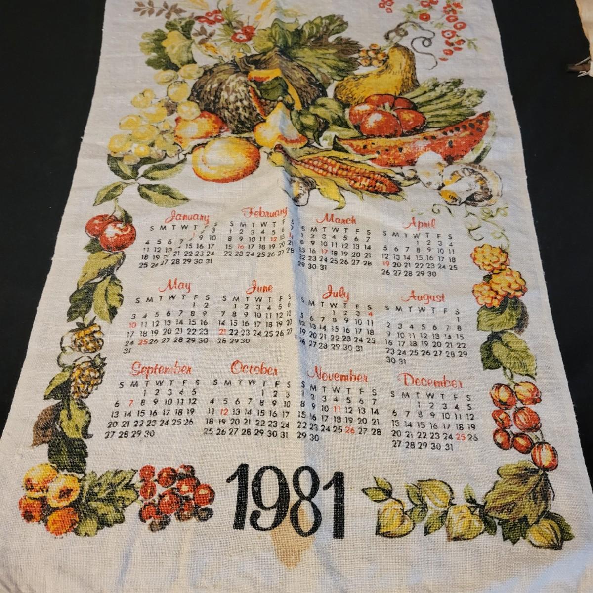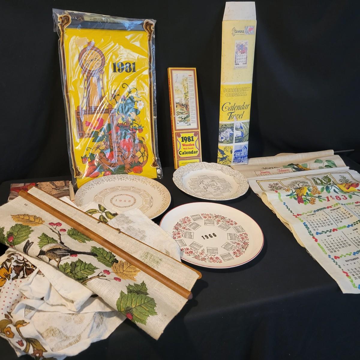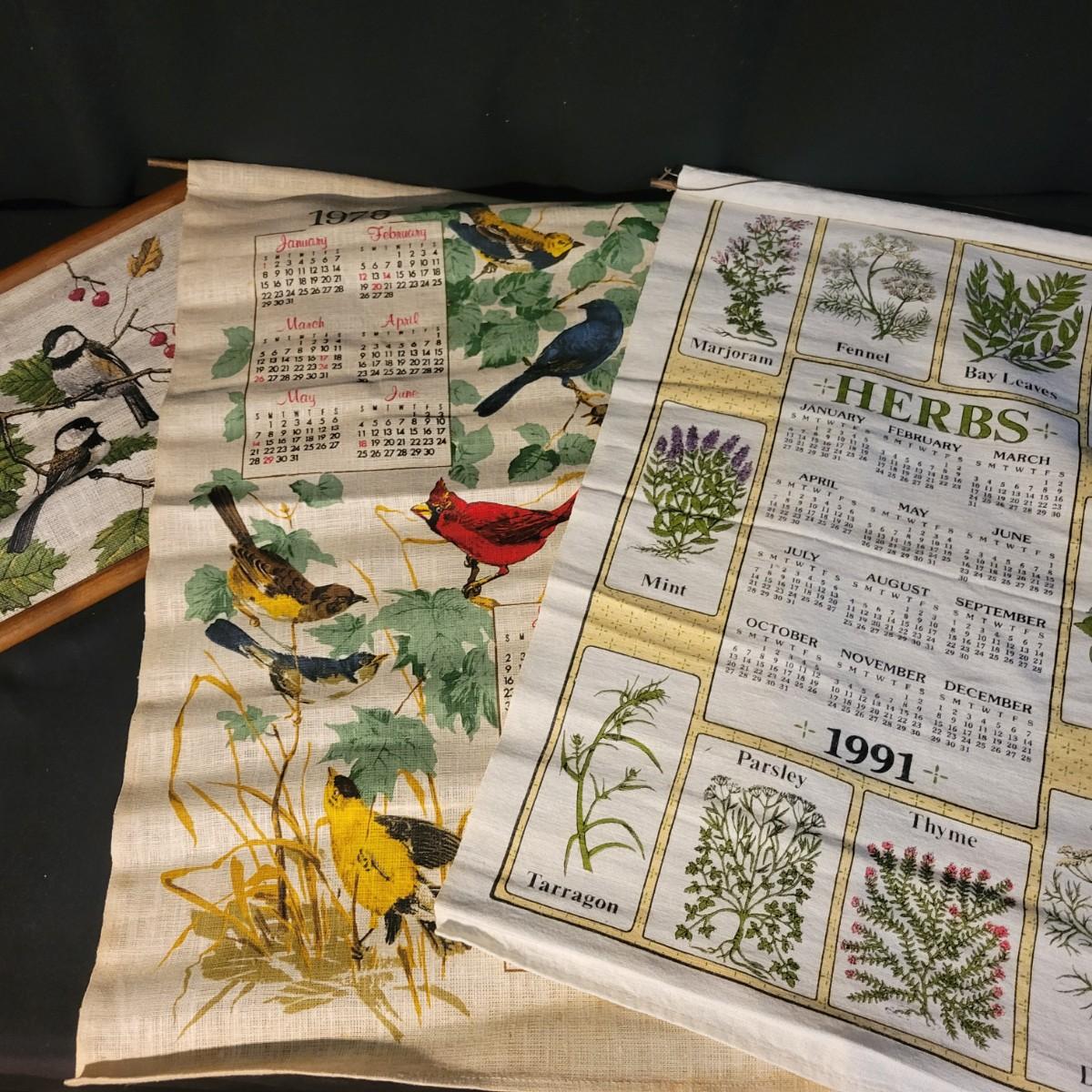 A large assortment of vintage calendars printed on linen and plates. Ranging in dates from 1958 to 1992, many of the linen calendars have nature, herb or seasonal motifs. This lot includes 3 plates and a wooden scroll calendar. There are 16 linen calenders and one seasonal calendar made of felt. Most pieces are in good condition, but a few do have minor stains. Shipping available